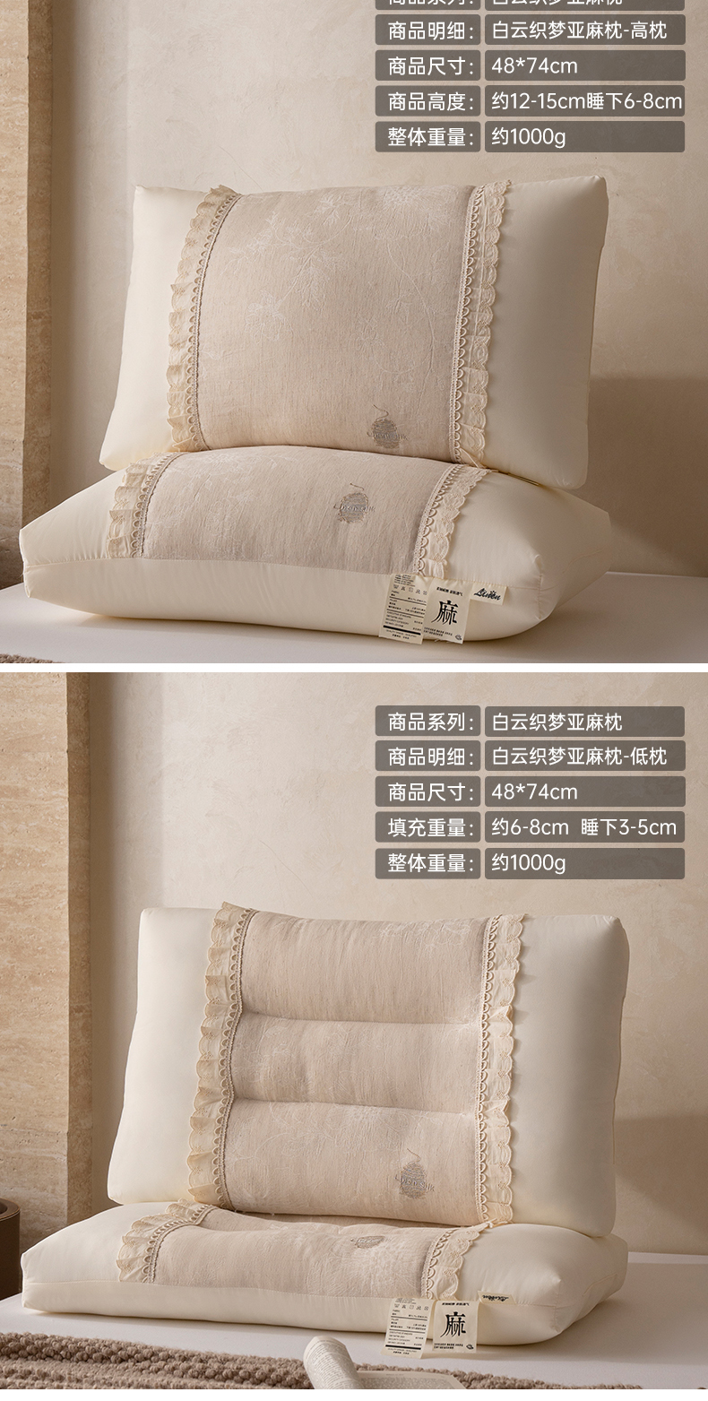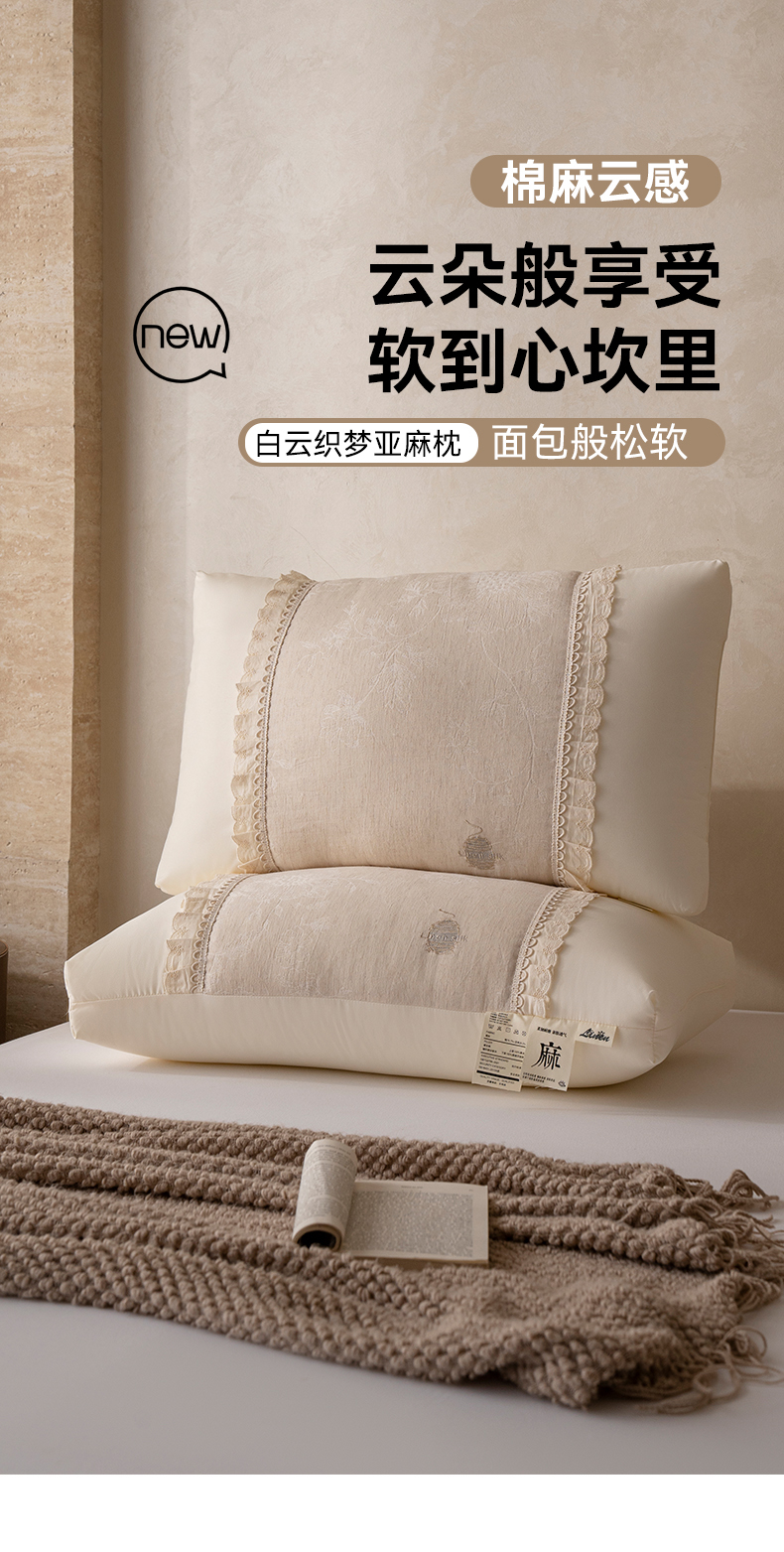 (总)昕科 2025新款白云织梦亚麻枕-实拍版-棉麻高低枕芯花边亚麻刺绣枕头,白云织梦亚麻枕-高枕,白云织梦亚麻枕-低枕