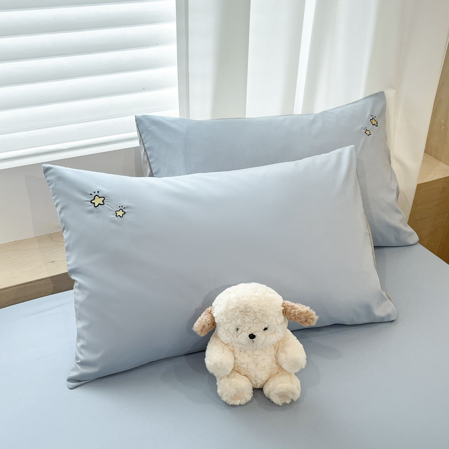 商品名称:泽西家纺+V17798841158发大图 2026新品全棉13376刺绣简约星星枕套 晴空蓝+牛仔蓝