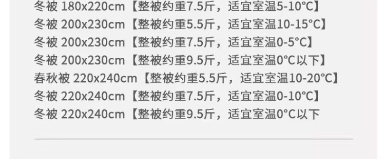 [{"sp_id":11,"sp_name":"\u989c\u8272","sp_format":2,"sp_list":[{"sp_value_id":1664,"sp_value_name":"\u767d\u62fc\u7389\u7c89","sp_value_image":{"id":999,"path":"https:\/\/img3.91jf.com\/ghelp\/2025\/20251225\/20251225171301_209665.jpg"},"sp_value_video":{"id":0,"img":"","path":"","time":0,"download_num":0,"play_num":0},"price":"35.50","storage":6000,"weight":"1.500","is_check_weight":0,"plus_price":"","sp_sort":0}]},{"sp_id":27,"sp_name":"\u5c3a\u5bf8","sp_format":1,"sp_list":[{"sp_value_id":302,"sp_value_name":"150*200-3\u65a4","sp_value_image":{"id":0,"path":""},"sp_value_video":{"id":0,"img":"","path":"","time":0,"download_num":0,"play_num":0},"price":"35.50","storage":500,"weight":"1.500","is_check_weight":0,"plus_price":"","sp_sort":5},{"sp_value_id":303,"sp_value_name":"150*200-5.5\u65a4","sp_value_image":{"id":0,"path":""},"sp_value_video":{"id":0,"img":"","path":"","time":0,"download_num":0,"play_num":0},"price":"41.50","storage":500,"weight":"2.750","is_check_weight":0,"plus_price":"","sp_sort":6},{"sp_value_id":304,"sp_value_name":"150*200-7.5\u65a4","sp_value_image":{"id":0,"path":""},"sp_value_video":{"id":0,"img":"","path":"","time":0,"download_num":0,"play_num":0},"price":"45.90","storage":500,"weight":"3.750","is_check_weight":0,"plus_price":"","sp_sort":7},{"sp_value_id":305,"sp_value_name":"180*200-5.5\u65a4","sp_value_image":{"id":0,"path":""},"sp_value_video":{"id":0,"img":"","path":"","time":0,"download_num":0,"play_num":0},"price":"43.30","storage":500,"weight":"2.750","is_check_weight":0,"plus_price":"","sp_sort":8},{"sp_value_id":306,"sp_value_name":"180*200-7.5\u65a4","sp_value_image":{"id":0,"path":""},"sp_value_video":{"id":0,"img":"","path":"","time":0,"download_num":0,"play_num":0},"price":"46.50","storage":500,"weight":"3.750","is_check_weight":0,"plus_price":"","sp_sort":9},{"sp_value_id":307,"sp_value_name":"180*200-9.5\u65a4","sp_value_image":{"id":0,"path":""},"sp_value_video":{"id":0,"img":"","path":"","time":0,"download_num":0,"play_num":0},"price":"52.10","storage":500,"weight":"4.750","is_check_weight":0,"plus_price":"","sp_sort":10},{"sp_value_id":308,"sp_value_name":"200*230-5.5\u65a4","sp_value_image":{"id":0,"path":""},"sp_value_video":{"id":0,"img":"","path":"","time":0,"download_num":0,"play_num":0},"price":"44.80","storage":500,"weight":"2.750","is_check_weight":0,"plus_price":"","sp_sort":11},{"sp_value_id":309,"sp_value_name":"200*230-7.5\u65a4","sp_value_image":{"id":0,"path":""},"sp_value_video":{"id":0,"img":"","path":"","time":0,"download_num":0,"play_num":0},"price":"49.10","storage":500,"weight":"3.750","is_check_weight":0,"plus_price":"","sp_sort":12},{"sp_value_id":310,"sp_value_name":"200*230-9.5\u65a4","sp_value_image":{"id":0,"path":""},"sp_value_video":{"id":0,"img":"","path":"","time":0,"download_num":0,"play_num":0},"price":"53.50","storage":500,"weight":"4.750","is_check_weight":0,"plus_price":"","sp_sort":13},{"sp_value_id":311,"sp_value_name":"220*240-5.5\u65a4","sp_value_image":{"id":0,"path":""},"sp_value_video":{"id":0,"img":"","path":"","time":0,"download_num":0,"play_num":0},"price":"46.50","storage":500,"weight":"2.750","is_check_weight":0,"plus_price":"","sp_sort":14},{"sp_value_id":312,"sp_value_name":"220*240-7.5\u65a4","sp_value_image":{"id":0,"path":""},"sp_value_video":{"id":0,"img":"","path":"","time":0,"download_num":0,"play_num":0},"price":"51.40","storage":500,"weight":"3.750","is_check_weight":0,"plus_price":"","sp_sort":15},{"sp_value_id":313,"sp_value_name":"220*240-9.5\u65a4","sp_value_image":{"id":0,"path":""},"sp_value_video":{"id":0,"img":"","path":"","time":0,"download_num":0,"play_num":0},"price":"56.20","storage":500,"weight":"4.750","is_check_weight":0,"plus_price":"","sp_sort":16}]}]