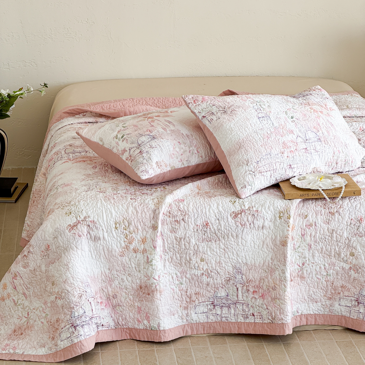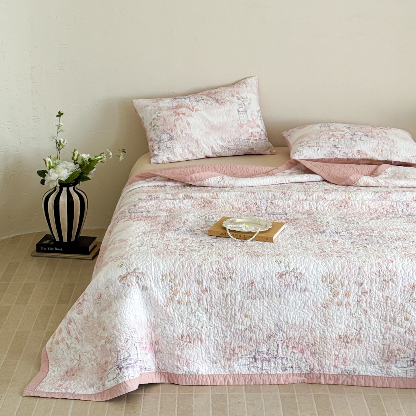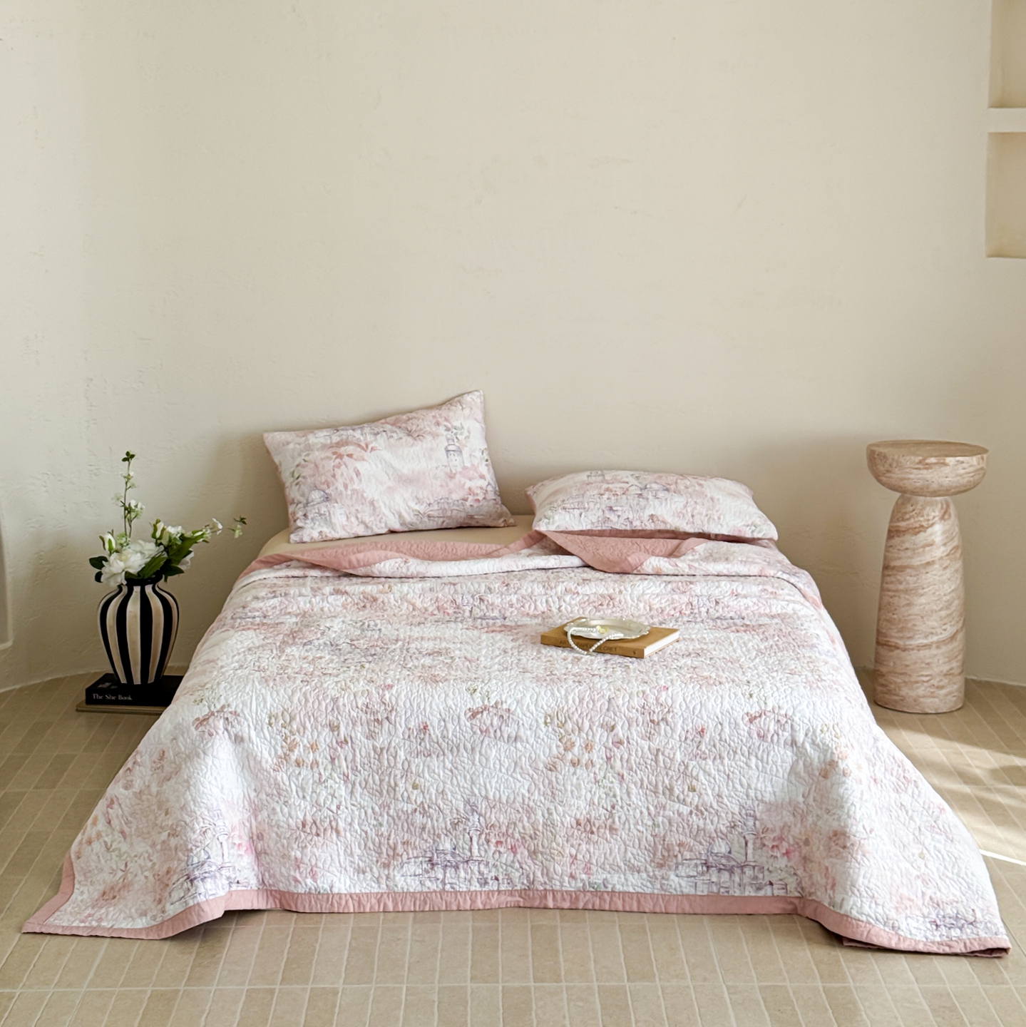 床盖工厂店 2026新款高端活性数码工艺双面全棉棉花床盖三件套 法兰庄园-粉