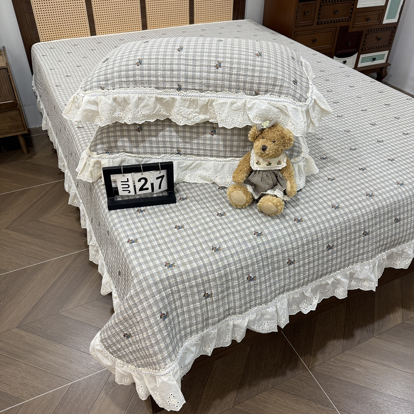 商品名称:(总)欣宜家纺 2026新款法式双面全棉填充棉花加厚花边床盖三件套