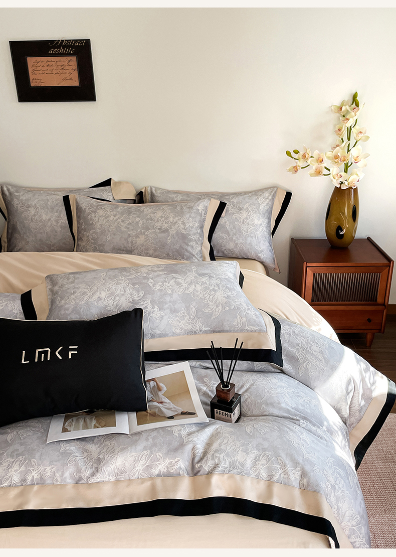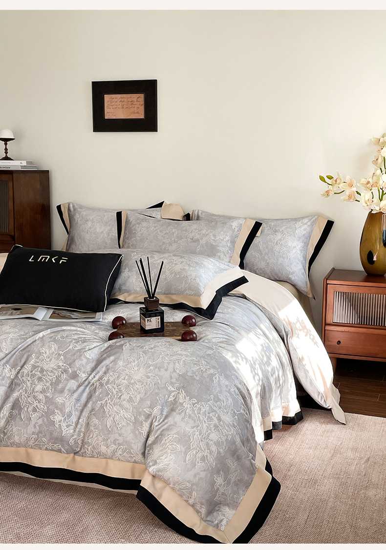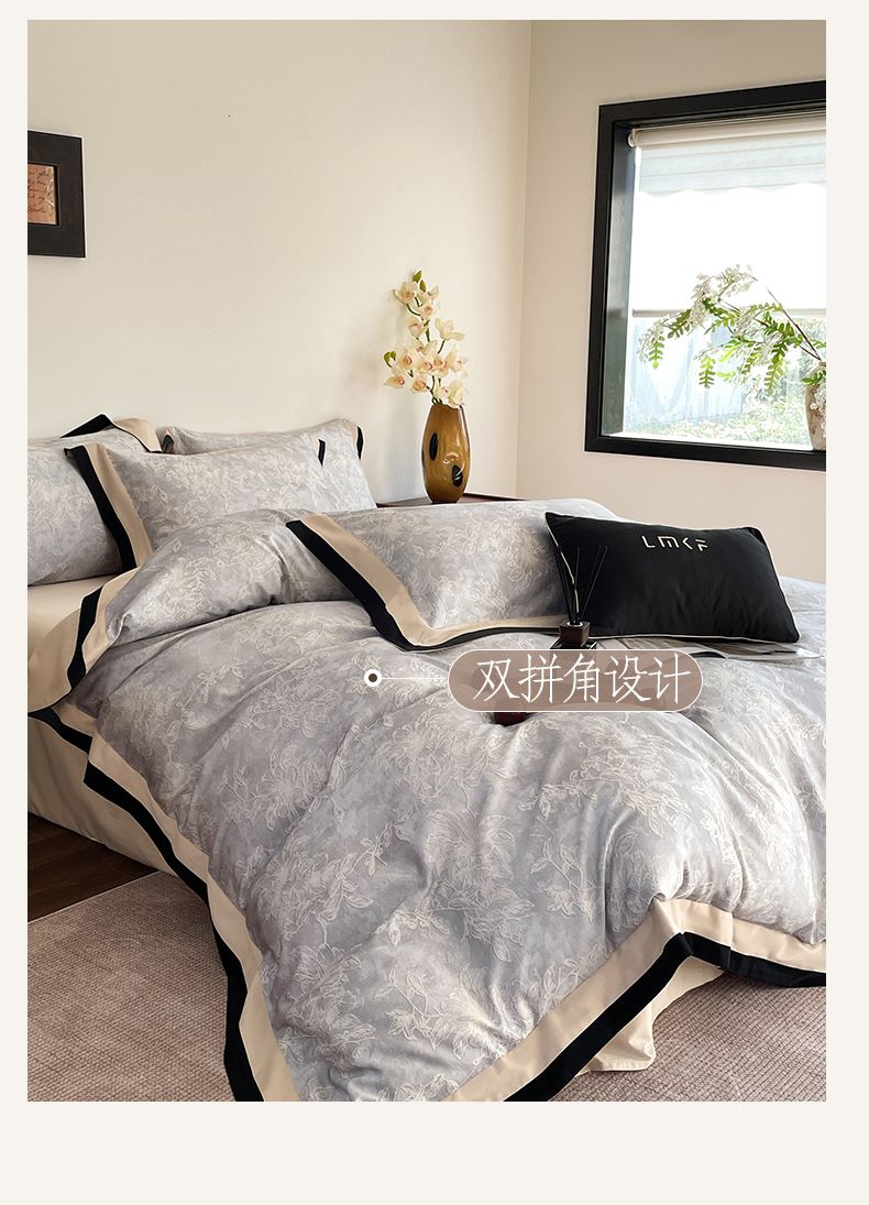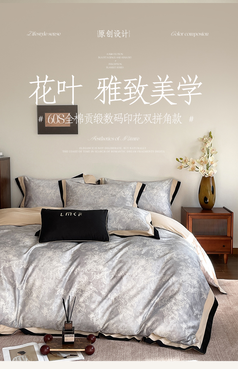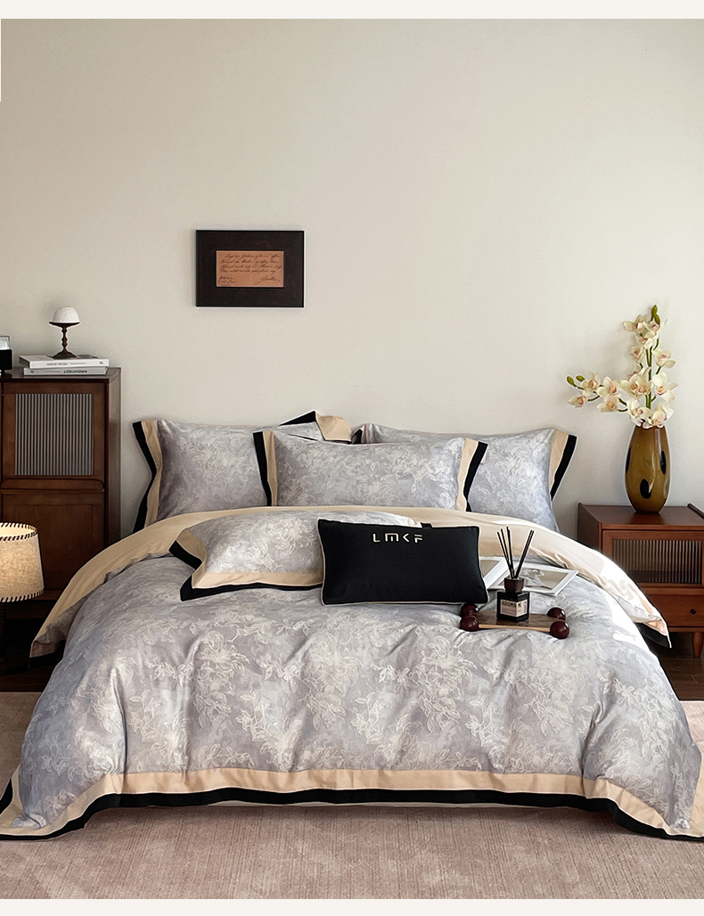 蓝米卡夫 2026春季新款-60S长绒棉数码印花贡缎双拼角系列四件套-巴音布鲁(礼盒) 巴音布鲁-浅灰