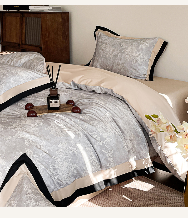 商品名称:蓝米卡夫 2026春季新款-60S长绒棉数码印花贡缎双拼角系列四件套-巴音布鲁(礼盒) 巴音布鲁-浅灰