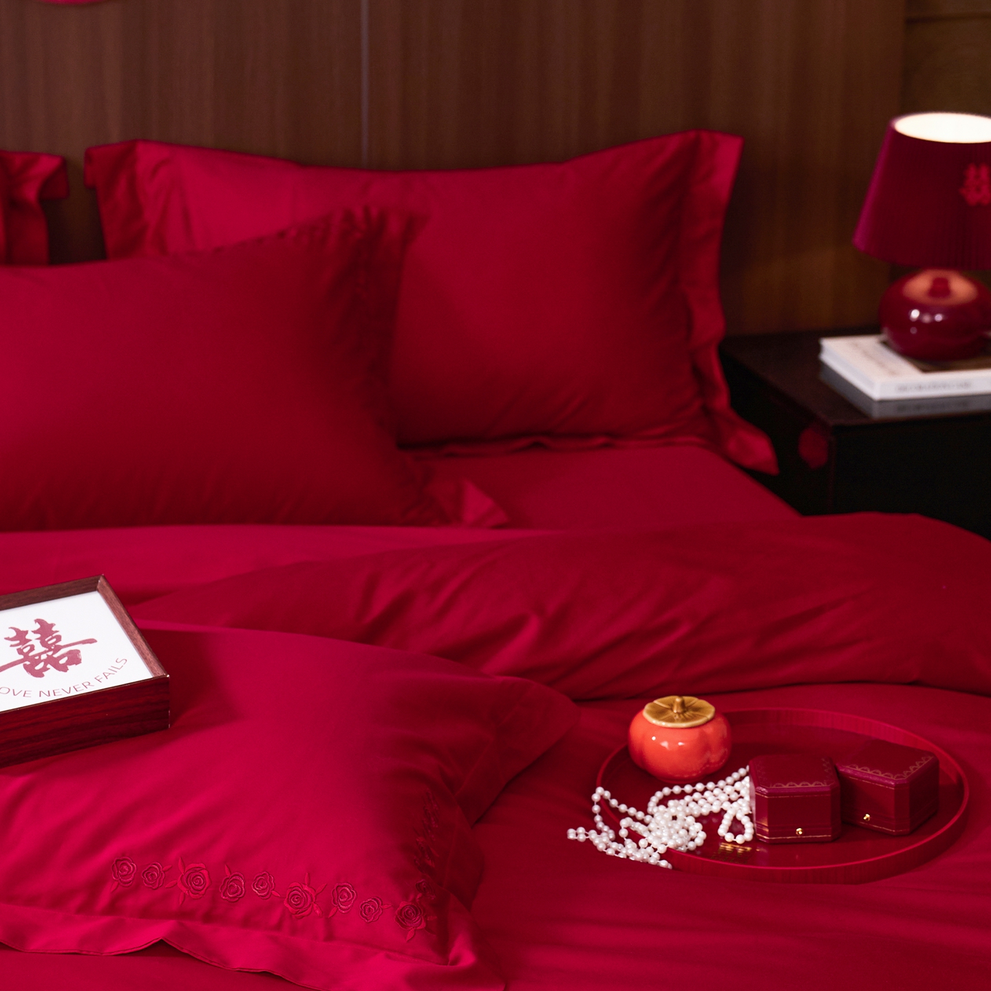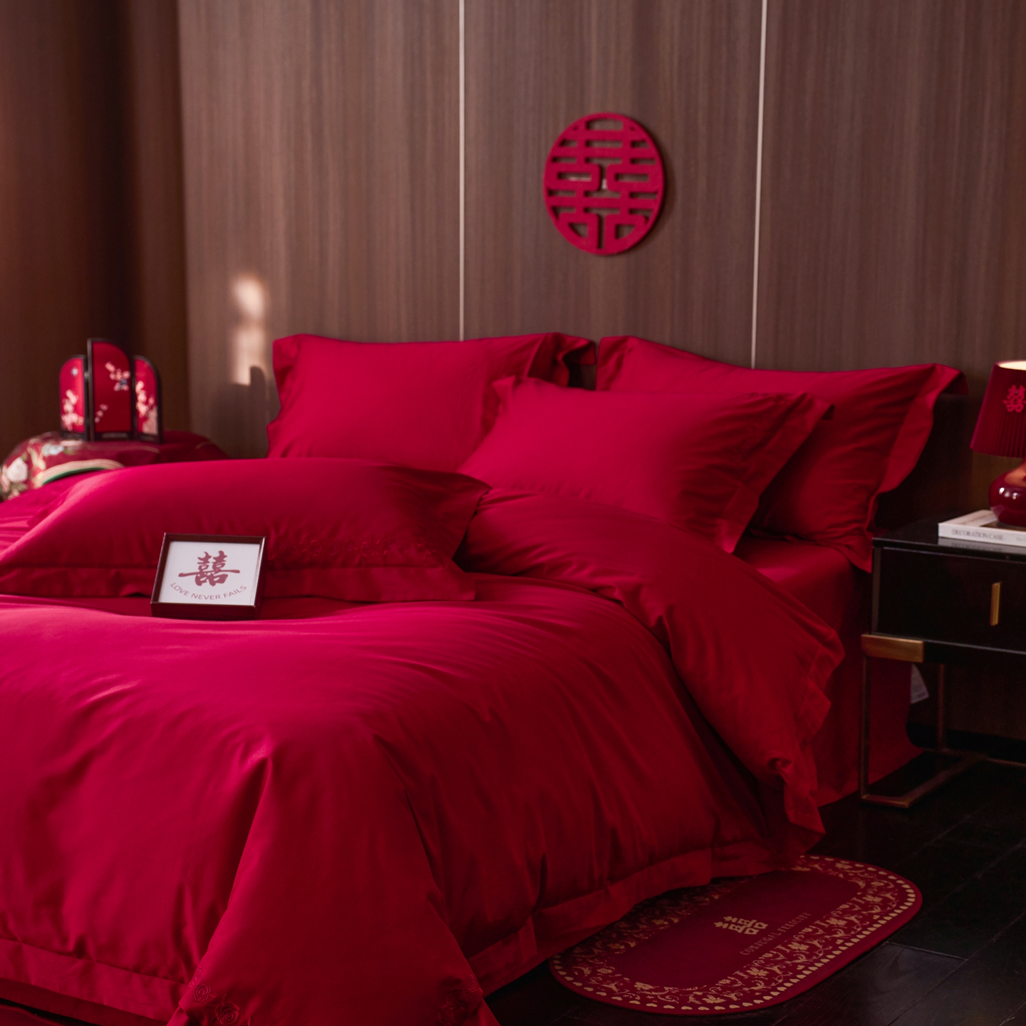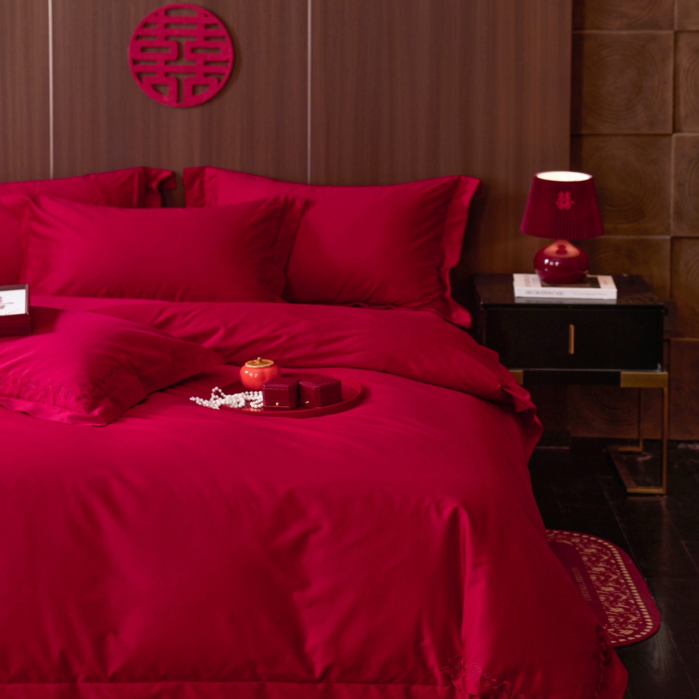 (总)初拾 2026新款贡缎全棉纯棉红色提花简约婚庆四件套—一眼万年