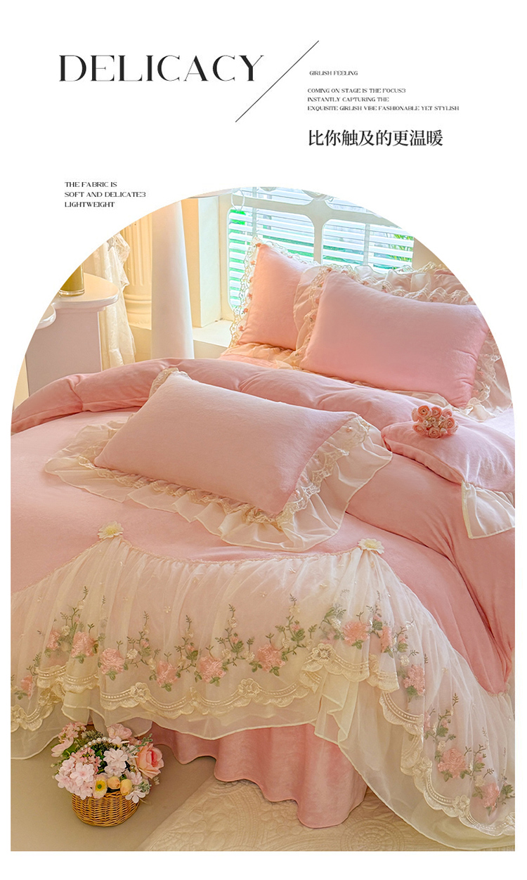 (总)苏米娜家纺SUMINA 2025新款230g高克重韩版立体盘花牛奶蚕丝绒绣花四件套床裙款被套-洛丽塔系列,洛丽塔-嫩黄 ,洛丽塔-香芋紫,洛丽塔-珍珠粉, 洛丽塔-婴儿蓝