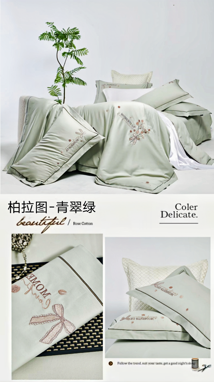 梦丝语家纺秋冬婚庆送礼居家高端100支长绒棉磨毛平绣加毛巾绣四件套,柏拉图-青翠绿