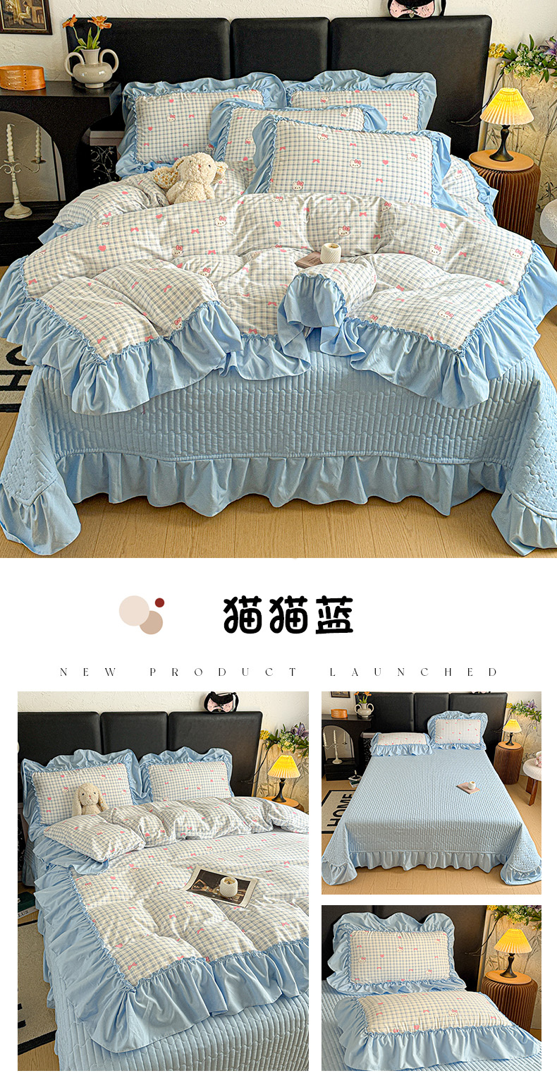 (总)富米莱(原臻工厂) 2026新款水洗棉波点毛巾绣黑格球球款床盖床裙四件套,幸福猫咪-蓝,幸福猫咪-粉,幸福猫咪-紫,幸福猫咪-米