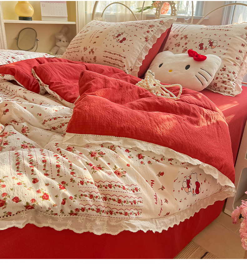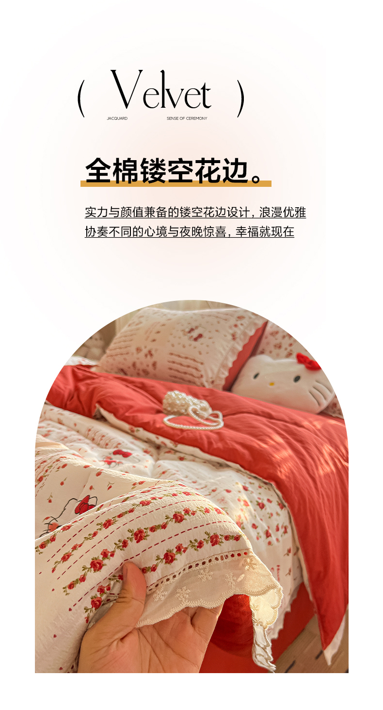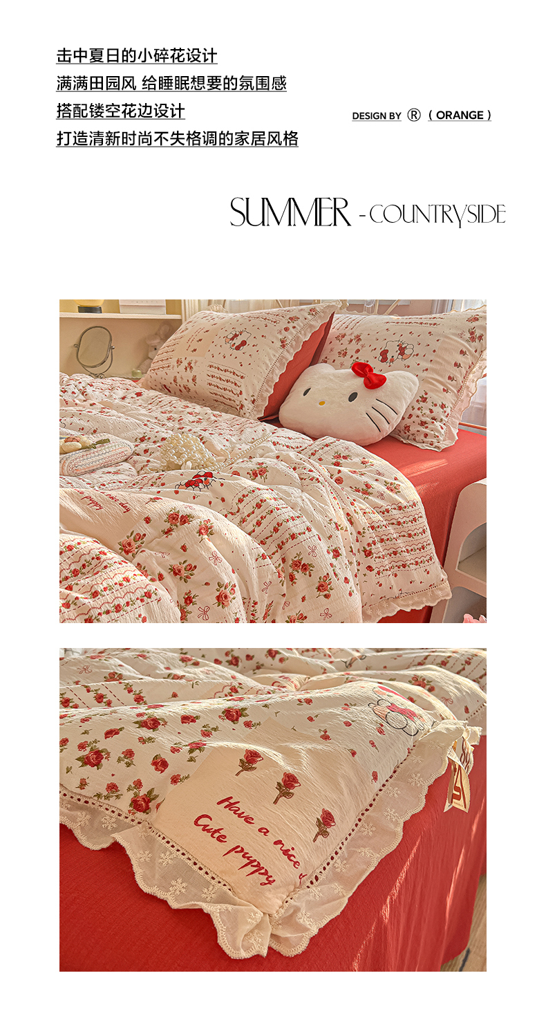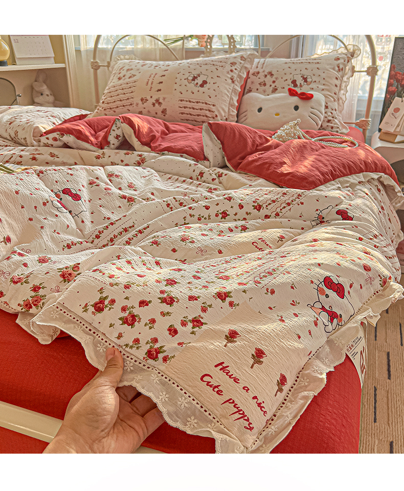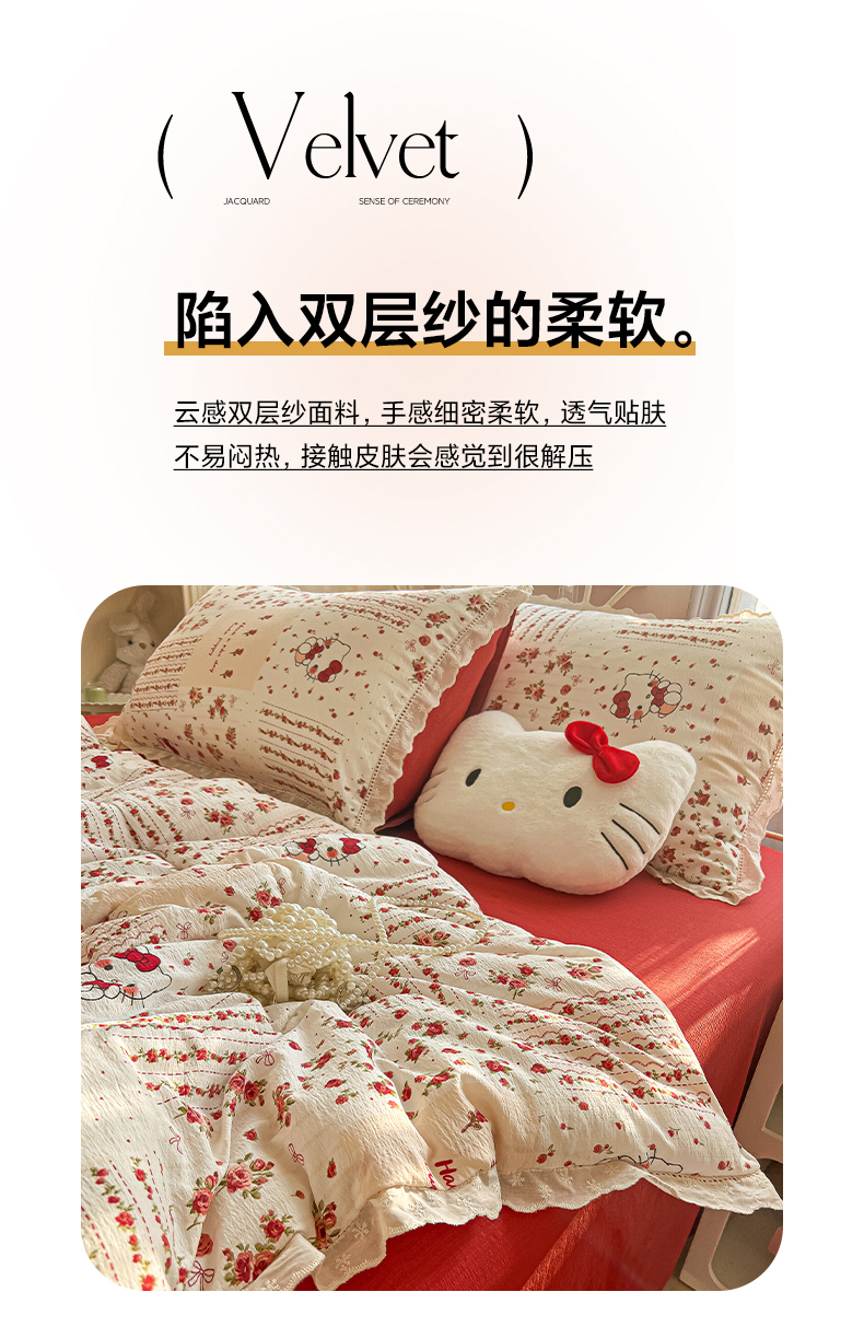 商品名称:罗亿家纺 2026新款全棉镂空花边云感双层纱夏被四件套 花漾kitty