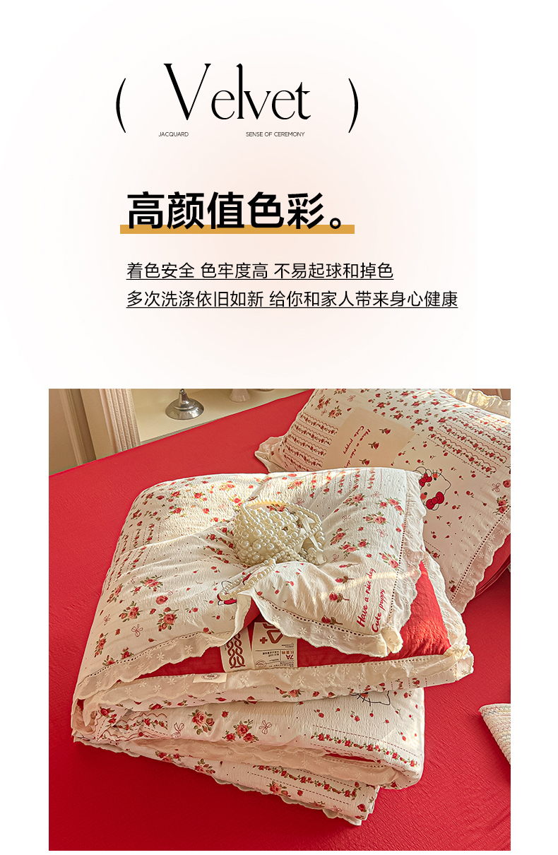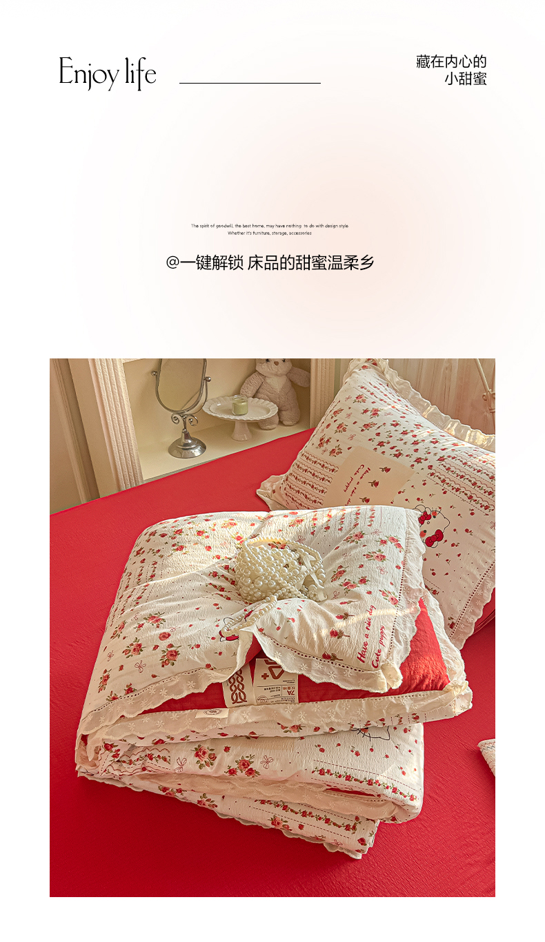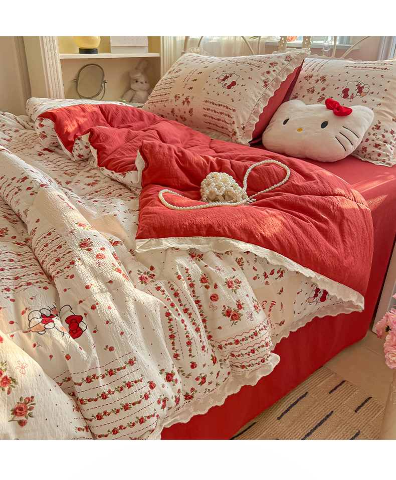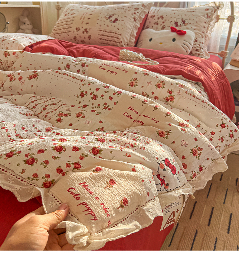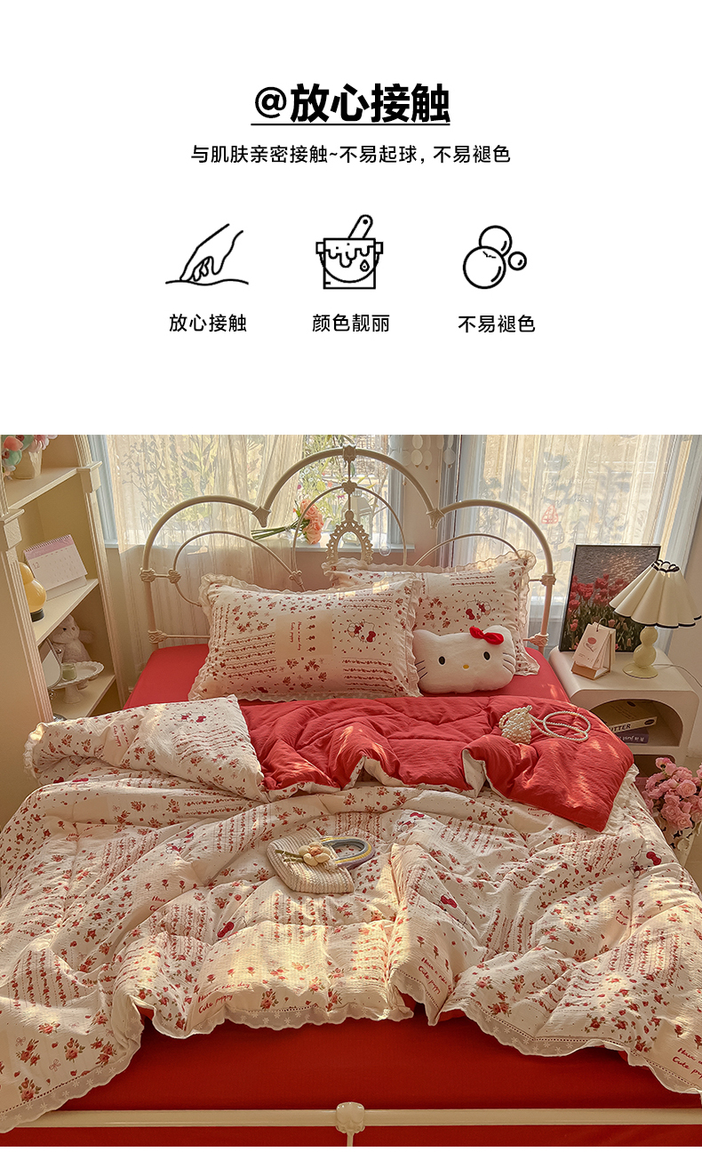 商品名称:罗亿家纺 2026新款全棉镂空花边云感双层纱夏被四件套 花漾kitty