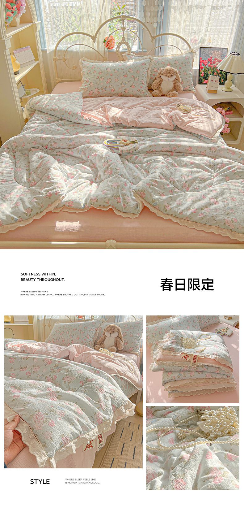 (总)罗亿家纺 2026新款全棉镂空花边云感双层纱夏被四件套,春日限定,点点小狗,海盐甜心,韩范小猫,赫本小姐,花花腊肠狗,花漾kitty,花与兔,简夏,蓝蓝小奶狗,蓝萱,蔷薇絮,萄气满满,小粉兔,小猫数星星,星星兔,薰衣草,枝蔓,kitty甜梦窝,组合图仅展示