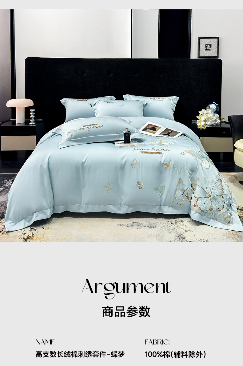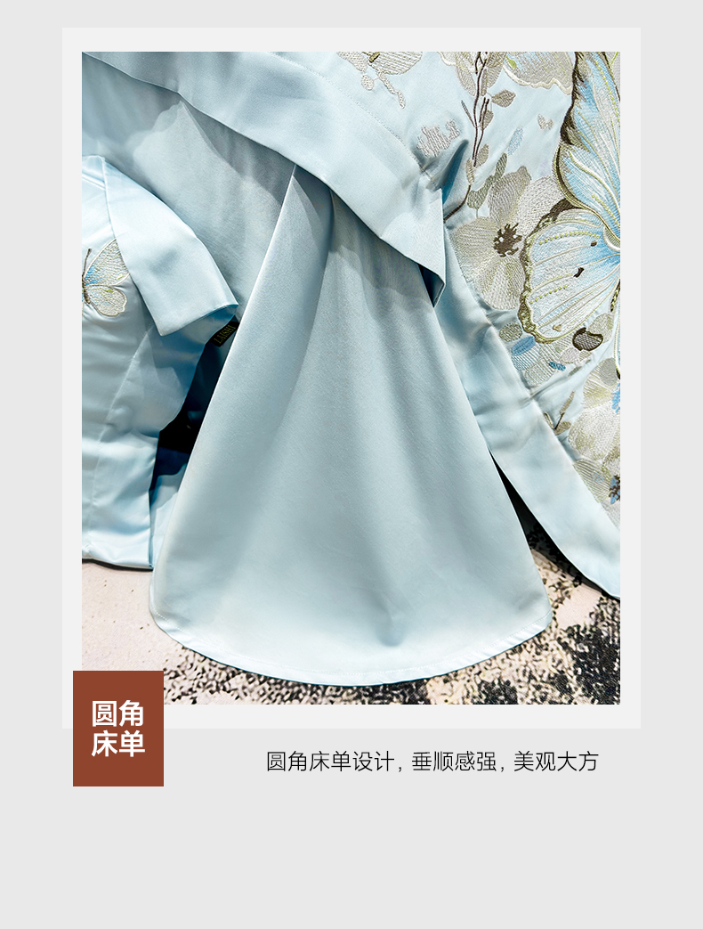 商品名称:欣宜家纺 2026新款100支纯棉全棉50x50s贡缎长绒棉刺绣绣花床上四件套【含高端礼盒】-蝶梦系列 天空蓝