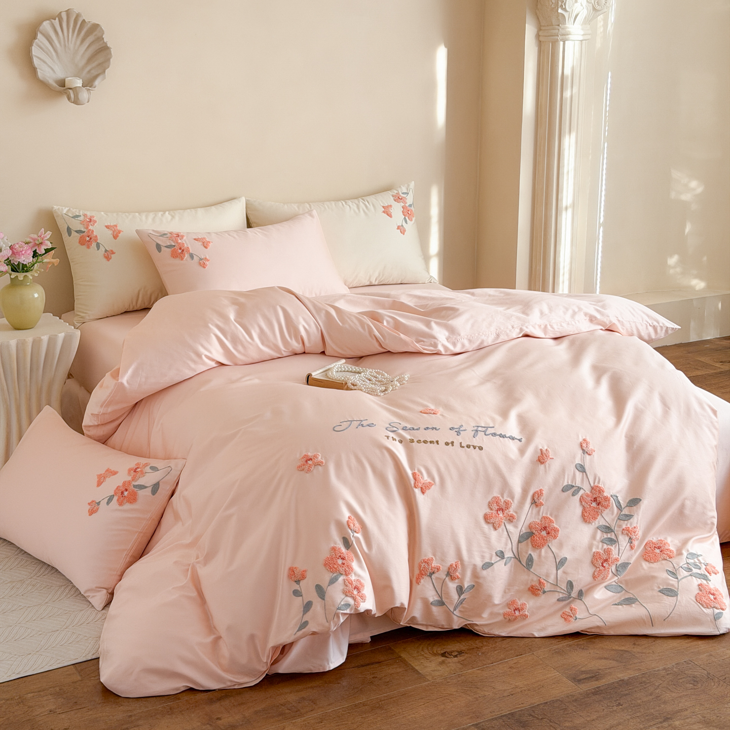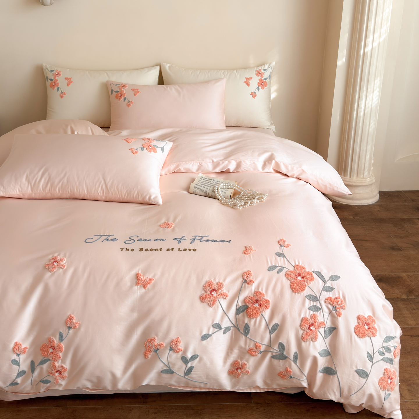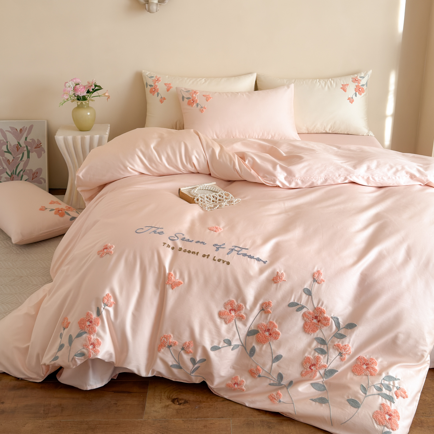 (总)优彩 2026春夏新款60支浮雕提花全棉纯棉四件套,流光,清风颂雅,山间雾-粉,山间雾-奶油白