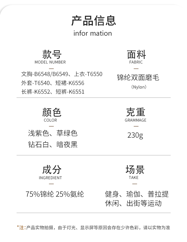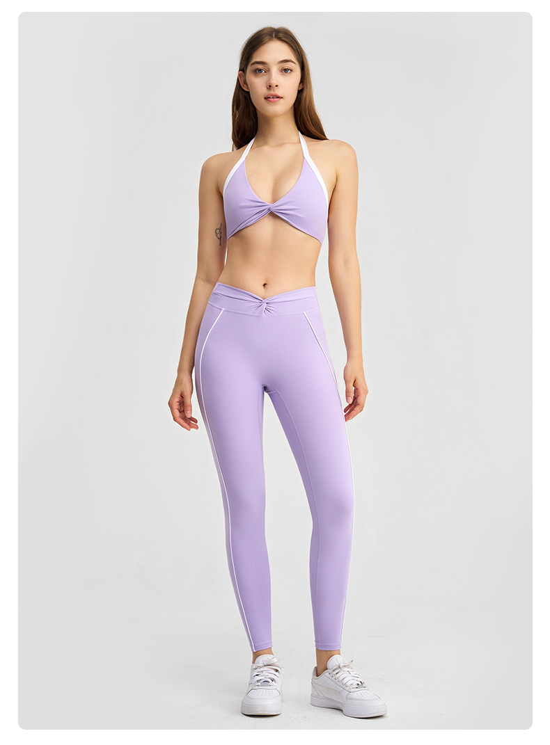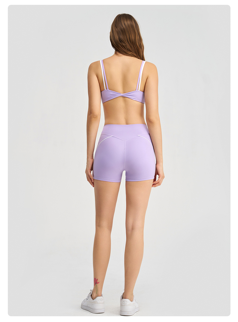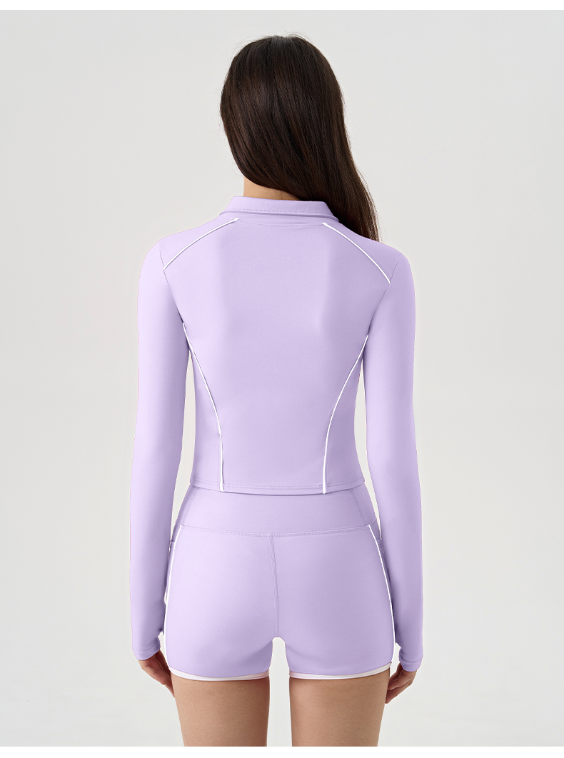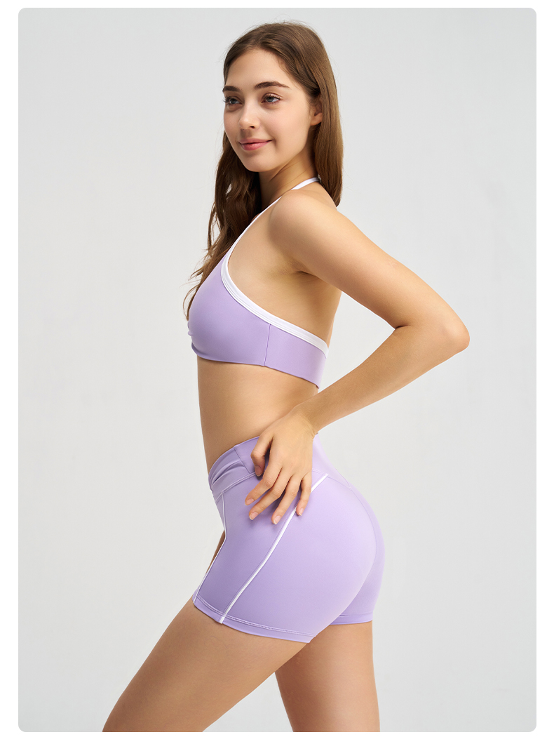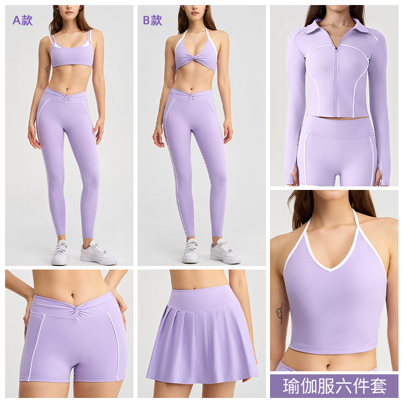 商品名称:沐珩家纺 2026新款撞色文胸上衣长袖短袖长裤短裤短裙百褶裙拉链外套瑜伽服六件套装(1) B款 浅紫色