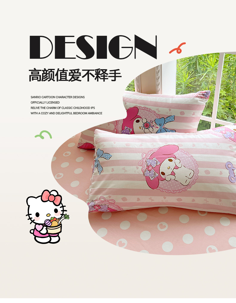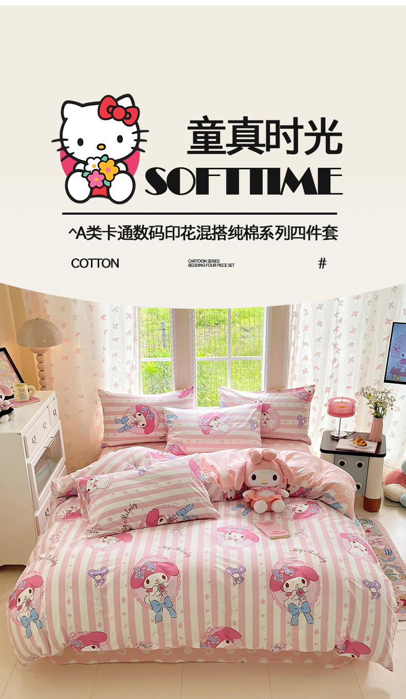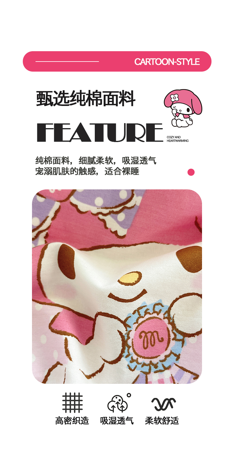 当前位置: 91家纺网 > 商品网购 > 床品套件 > 四件套 > 全棉普通四件套 > 桃子家居 2026新款A类三丽鸥正版授权卡通数码印花混搭纯棉印花系列四件套 棉三丽鸥-甜甜美乐蒂