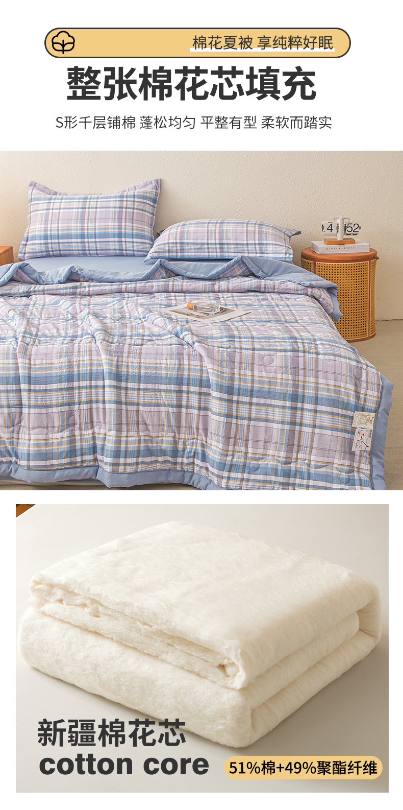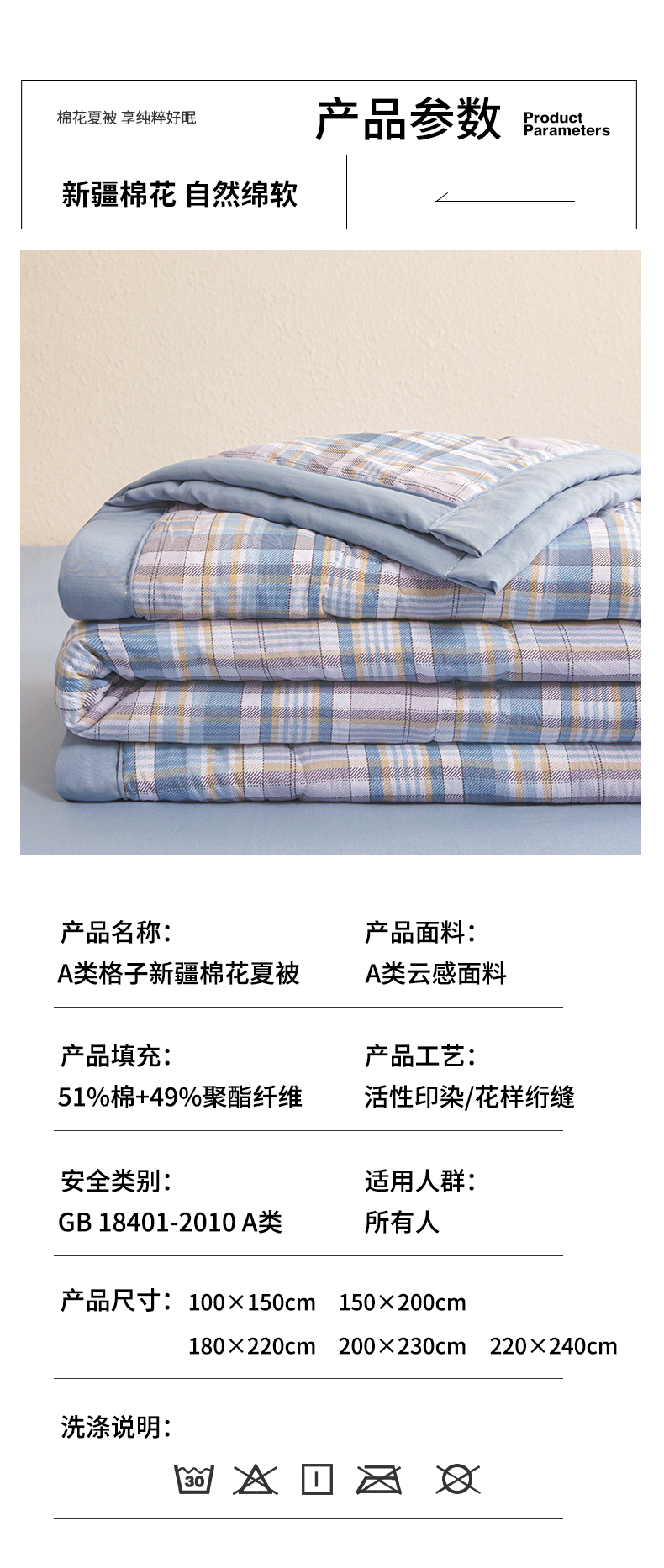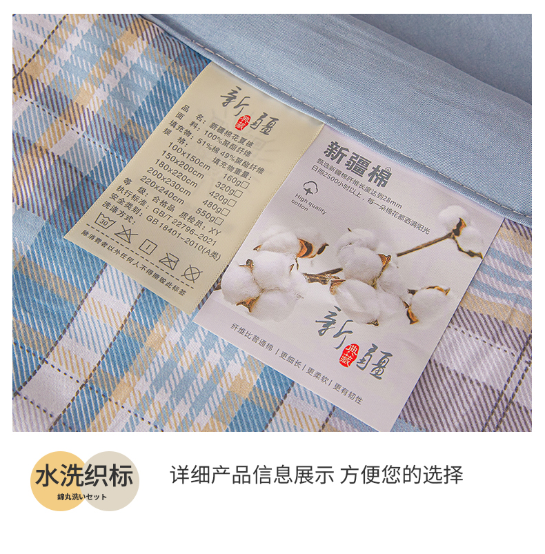 商品名称:西域种棉人·千百笠 2026新款A类新疆棉花夏凉被加宽包边水洗棉无印格子印花吸湿透气棉花夏被空调被 格子蓝