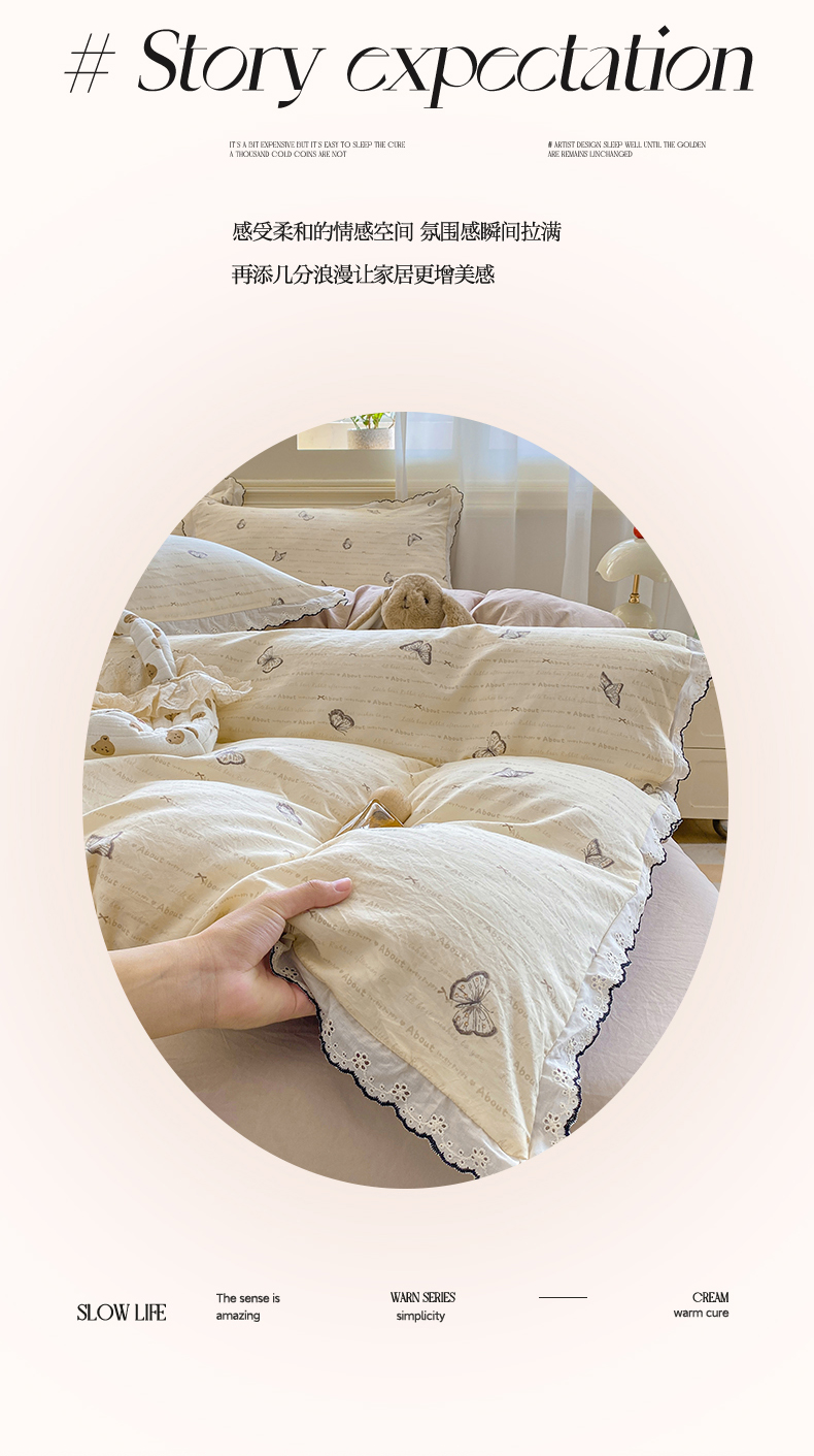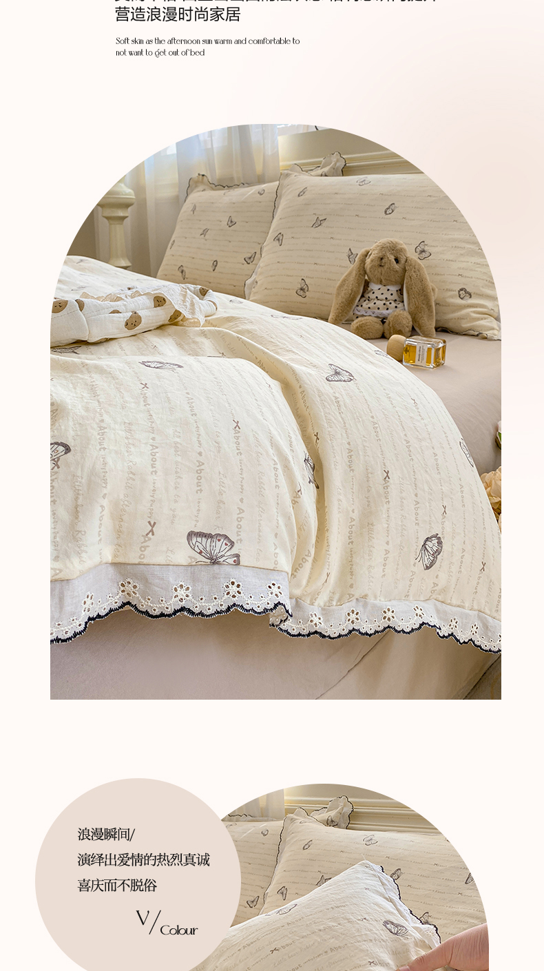 豫见家纺 2026新款A类仿棉云感纱花边四件套 雨沫蝴蝶结