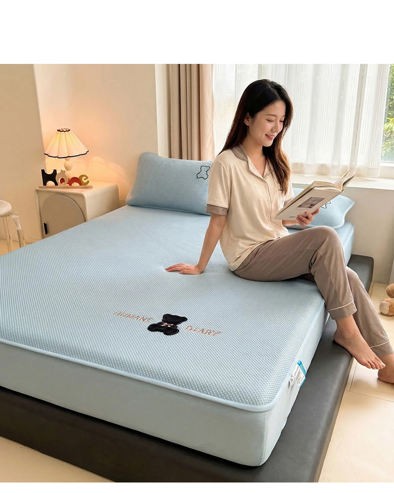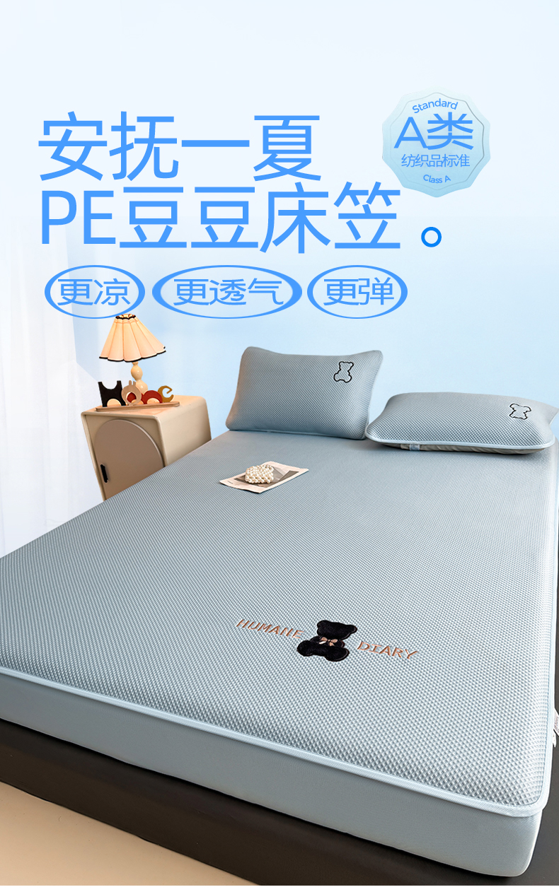 • 91家纺网 家纺一手货源 找家纺 (总)雯豆家纺 2026新款PE中分子绣花床笠三件套夏季凉感豆豆席子床罩-墨仔熊,墨仔熊床笠款-灰,墨仔熊床笠款-蓝,墨仔熊床笠款-粉,墨仔熊床笠款-绿