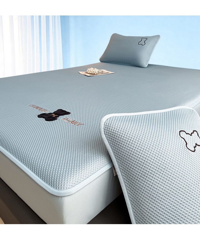 • 91家纺网 家纺一手货源 找家纺 雯豆家纺 2026新款PE中分子绣花床笠三件套夏季凉感豆豆席子床罩-墨仔熊 墨仔熊床笠款-蓝