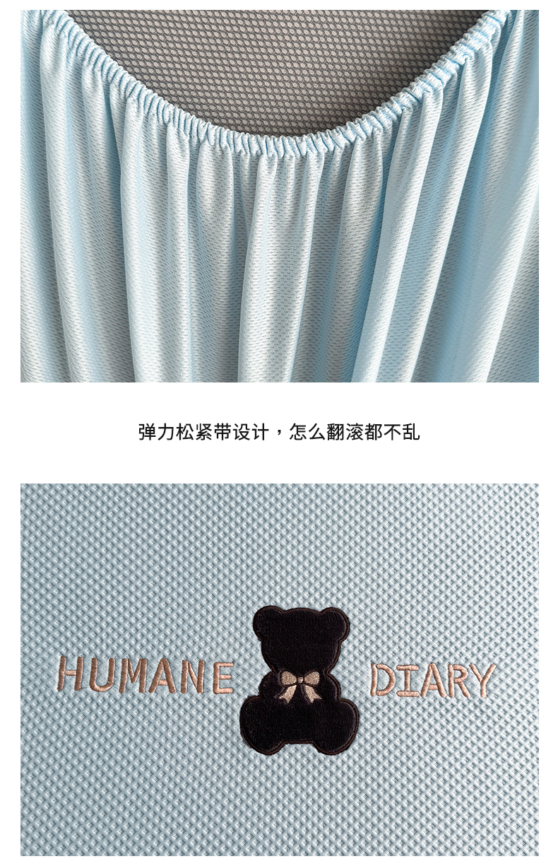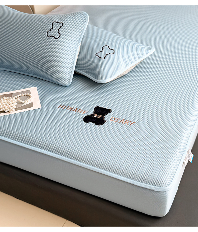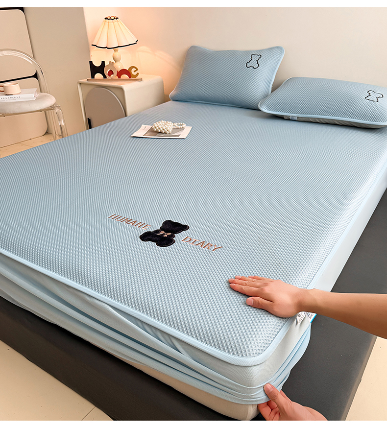雯豆家纺 2026新款PE中分子绣花床笠三件套夏季凉感豆豆席子床罩-墨仔熊 墨仔熊床笠款-蓝