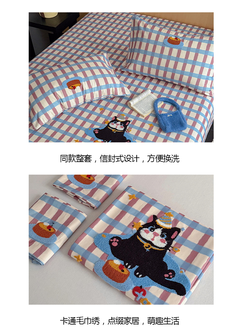 • 91家纺网 家纺一手货源 找家纺 (总)暖生活 2026新款全棉纯棉色织水洗棉毛巾绣床笠三件套,组合图仅做展示不可下单,KT日记,蓝鲸梦,墨镜小狗,下雨天,小企鹅,阅读星人