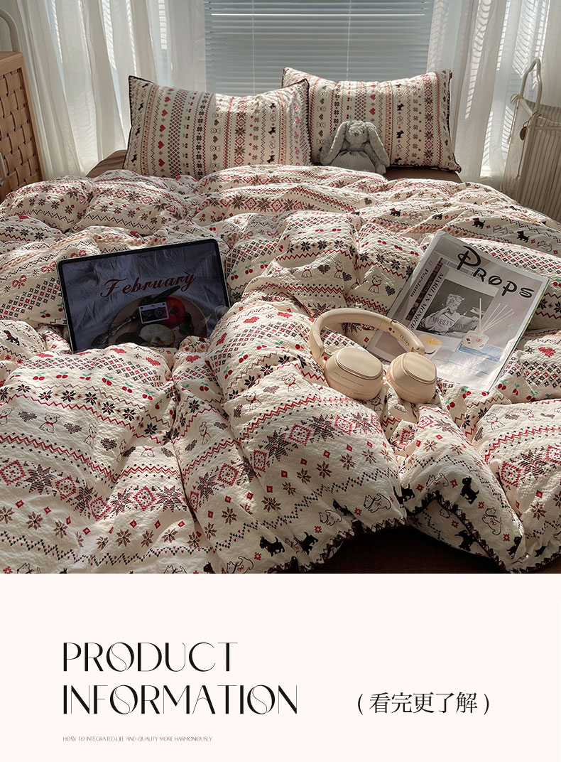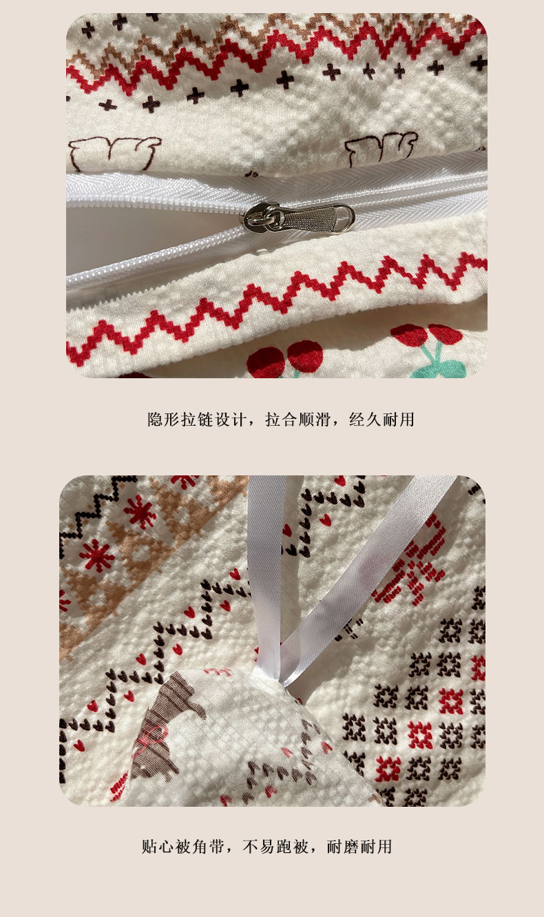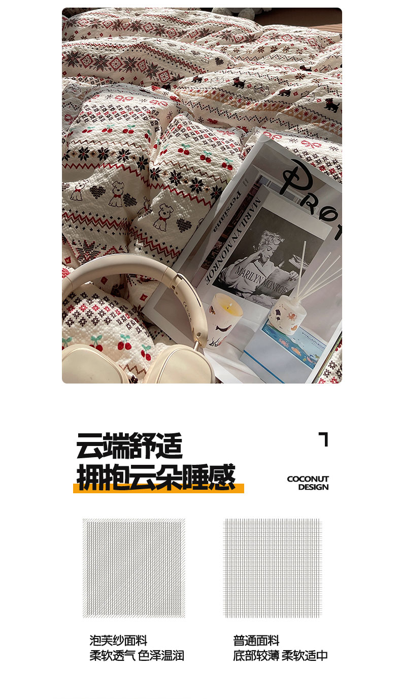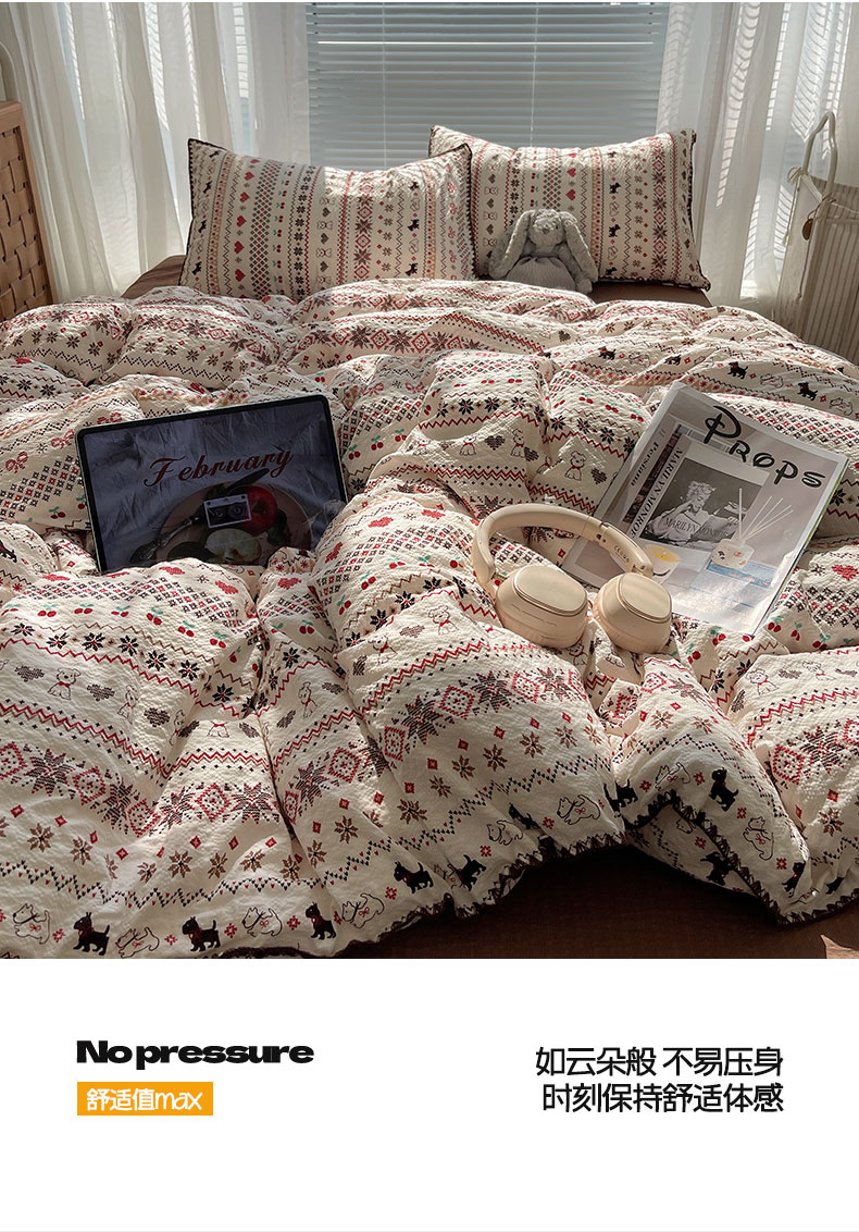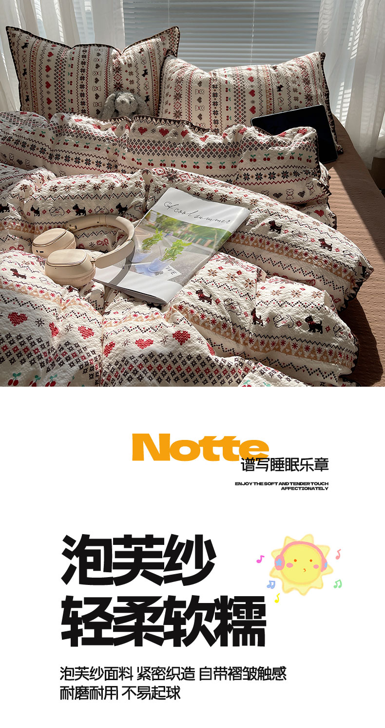 当前位置: 91家纺网 > 商品网购 > 床品套件 > 四件套 > 其它四件套 > 桃心家居 2026新款A类费尔岛可爱卡通贝壳边三角针工艺双层纱泡芙棉泡芙纱系列四件套 泡芙棉-圣诞小狗