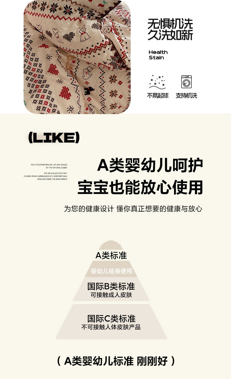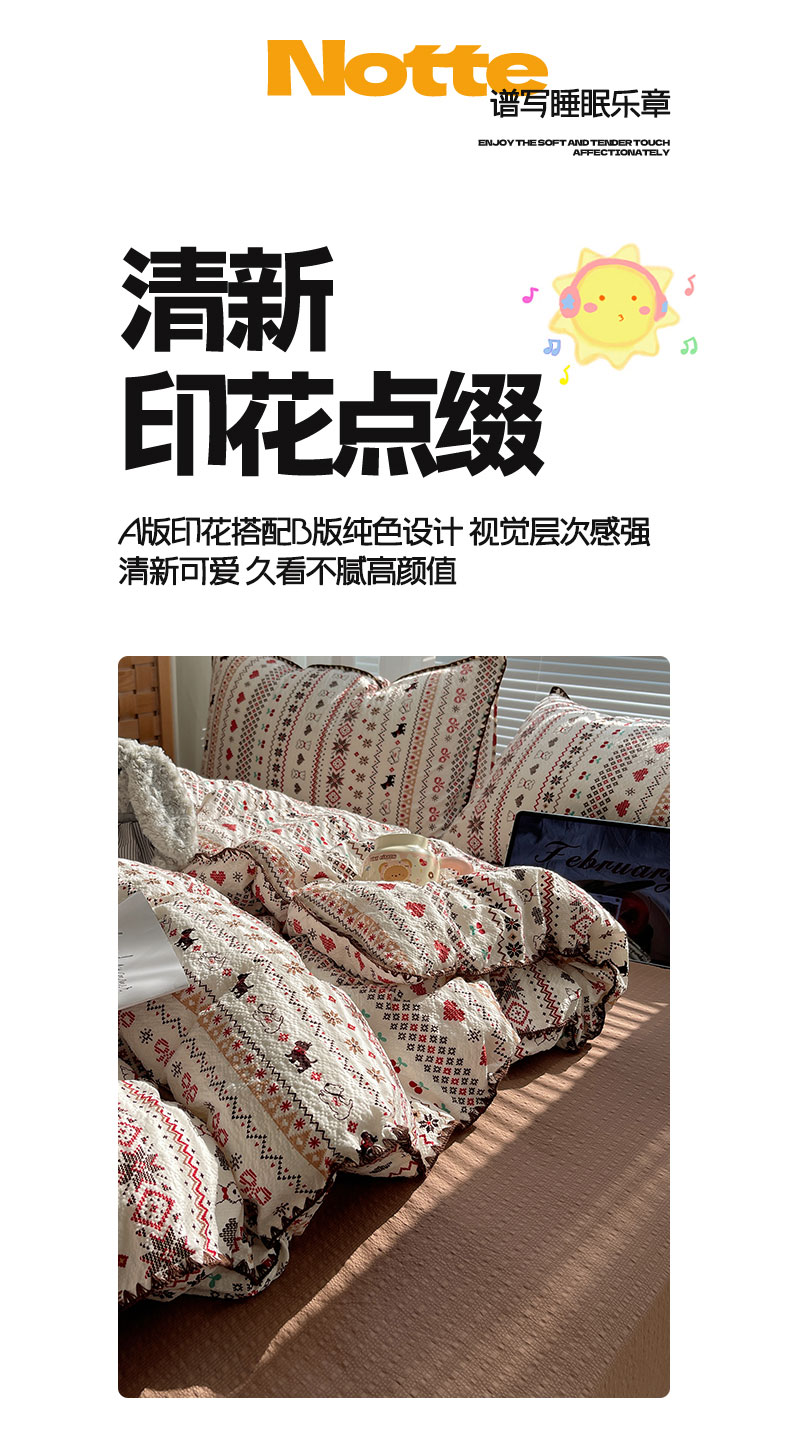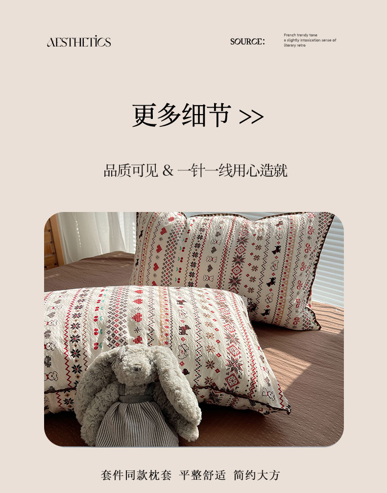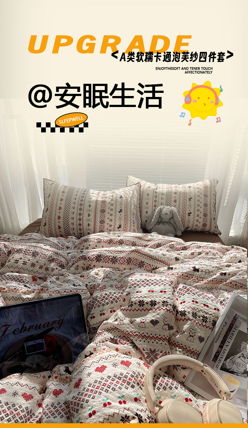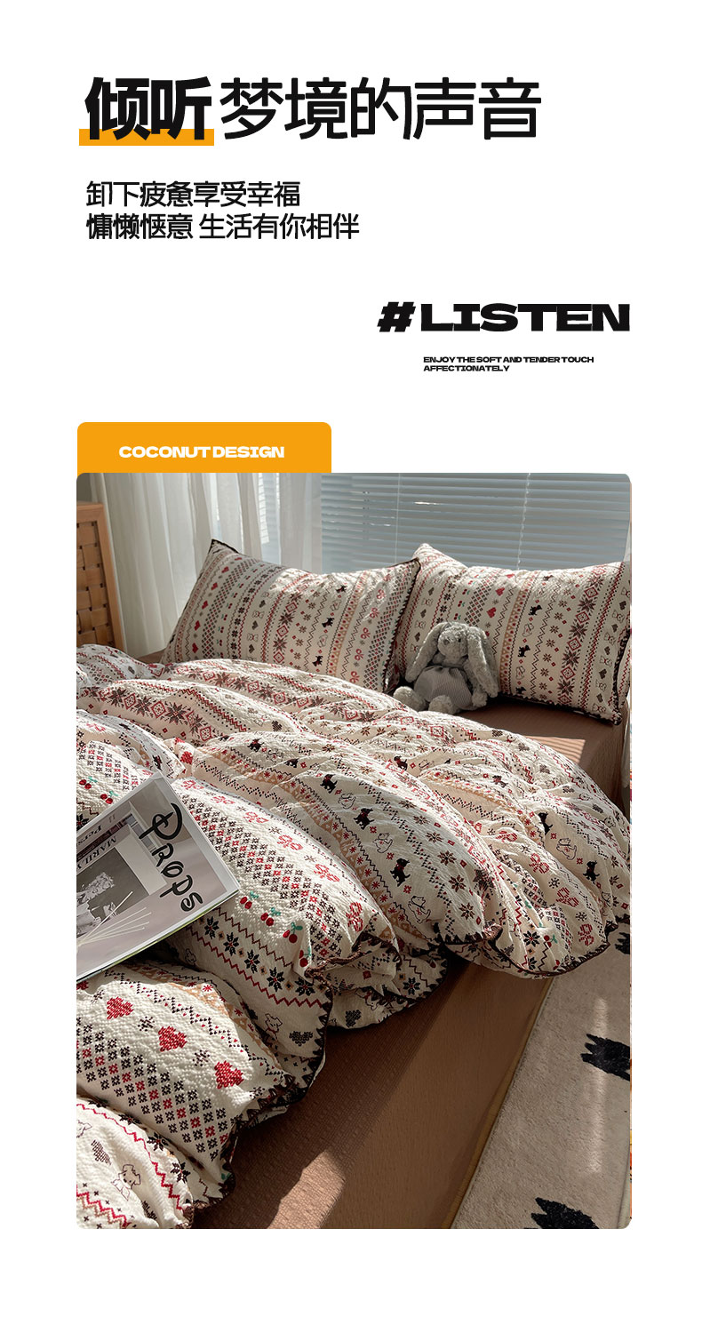 当前位置: 91家纺网 > 商品网购 > 床品套件 > 四件套 > 其它四件套 > 桃心家居 2026新款A类费尔岛可爱卡通贝壳边三角针工艺双层纱泡芙棉泡芙纱系列四件套 泡芙棉-圣诞小狗