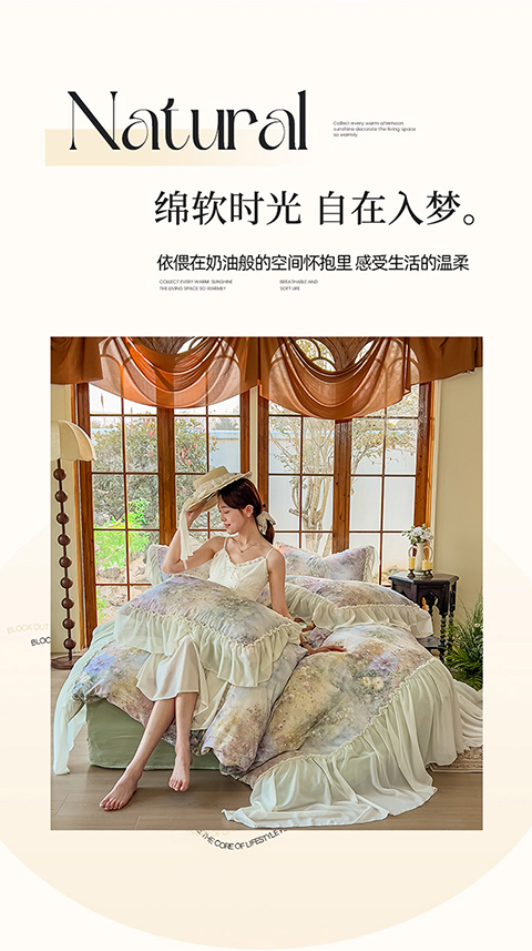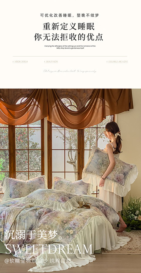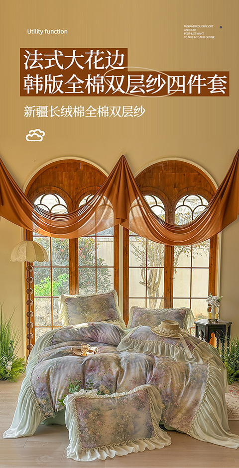 商品名称:(总)(总)2026高端韩版法式公主复古油画风全棉纯棉双层纱四件套赫本浪漫荷叶花边仙女纯棉全棉双层纱四件套床上用品被套