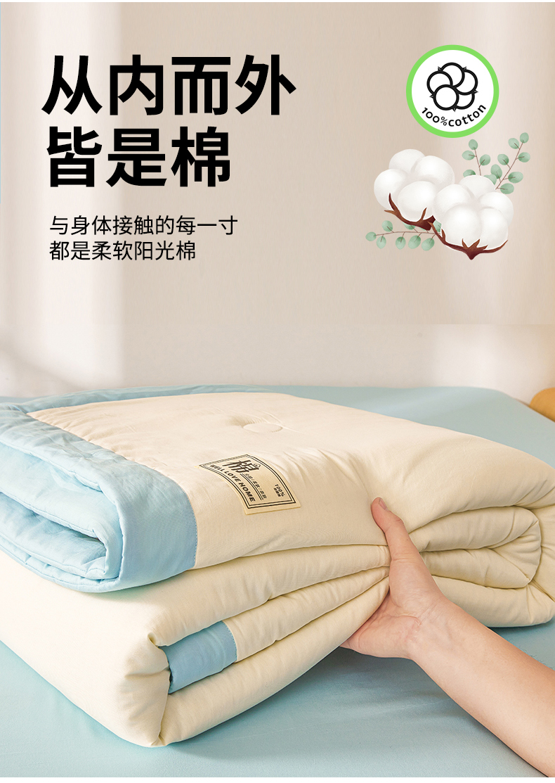 • 91家纺网 家纺一手货源 找家纺 晓时候 2026新款纯色100%里外全棉新疆棉花被纯棉夏凉被空调被夏被四件套被子被芯 里外全棉-月光白拼蓝