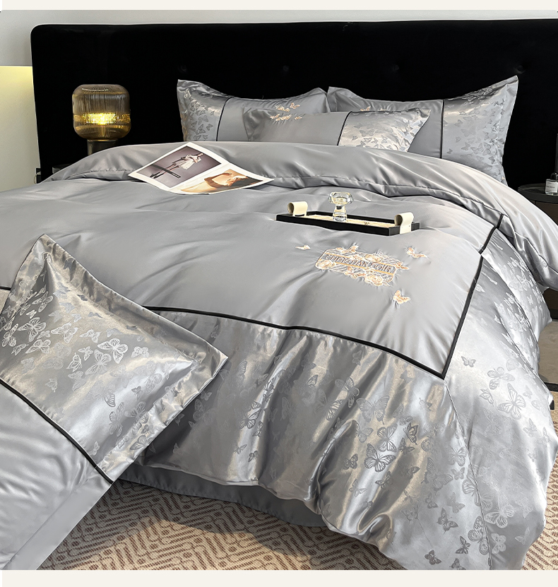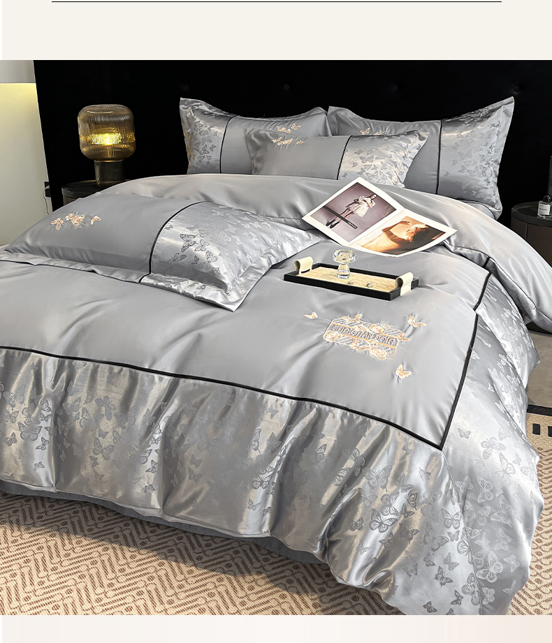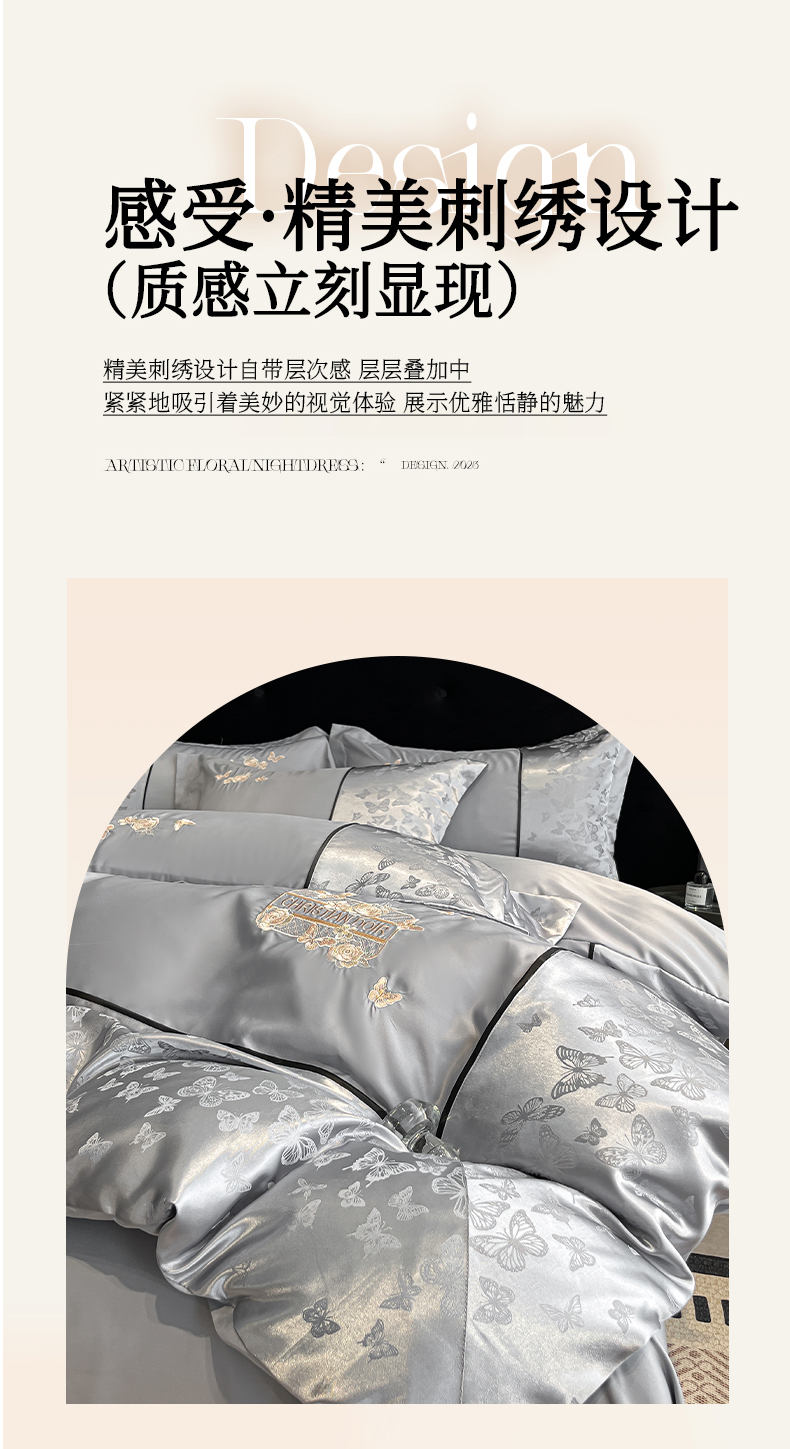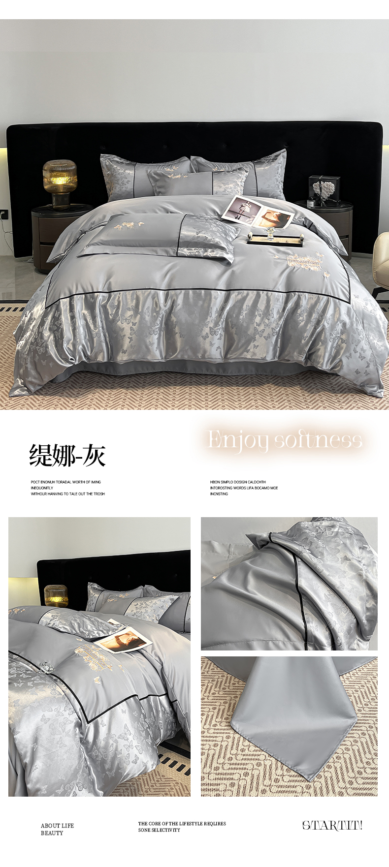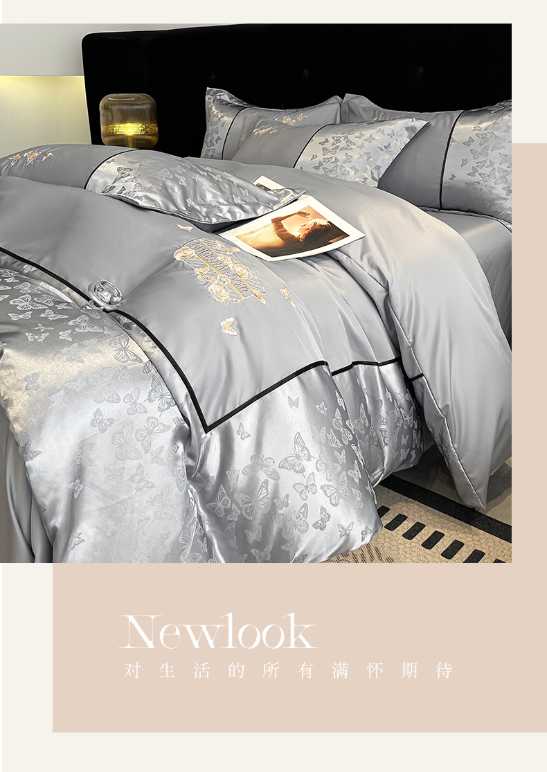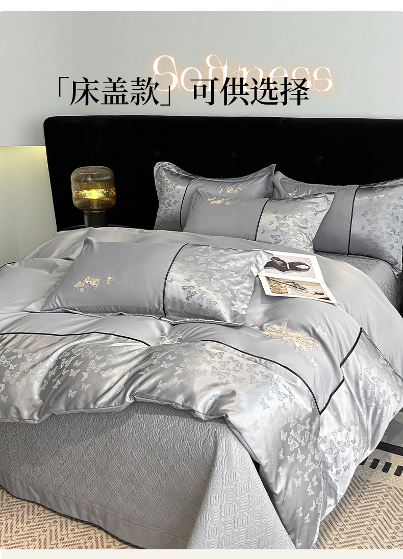 当前位置: 91家纺网 > 商品网购 > 床品套件 > 四件套 > 其它四件套 > 金牛座家纺 2026新款金牛座细斜纹贡缎亮丝提花大拼角刺绣床盖四件套-缇娜系列 缇娜-灰