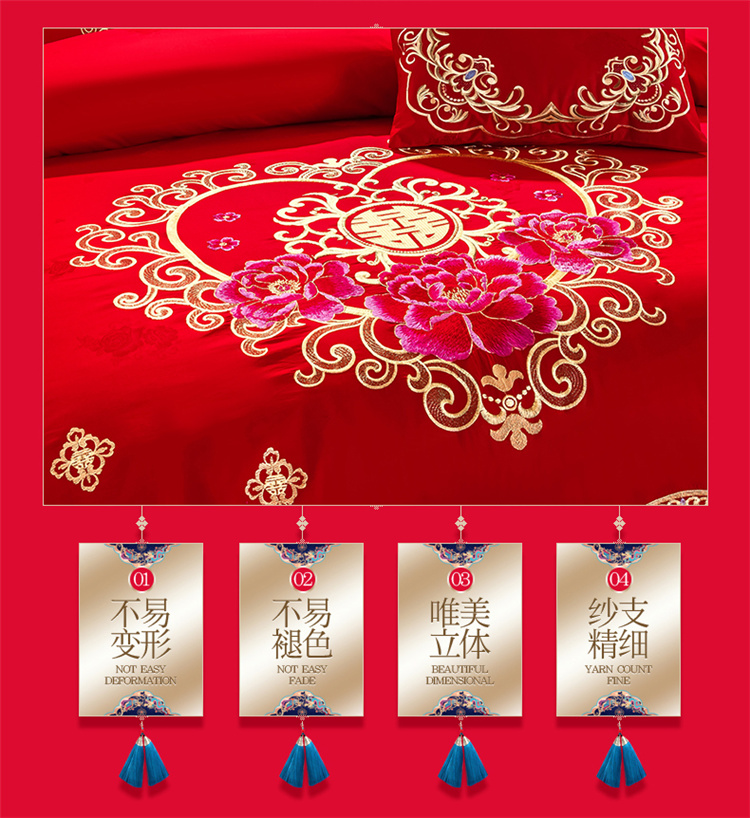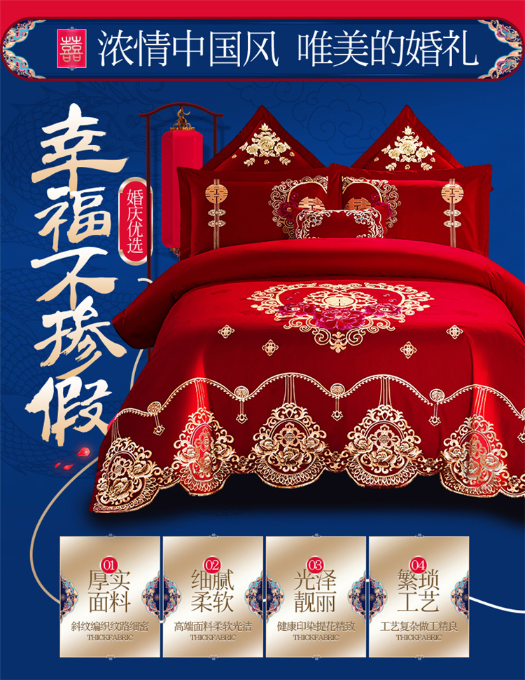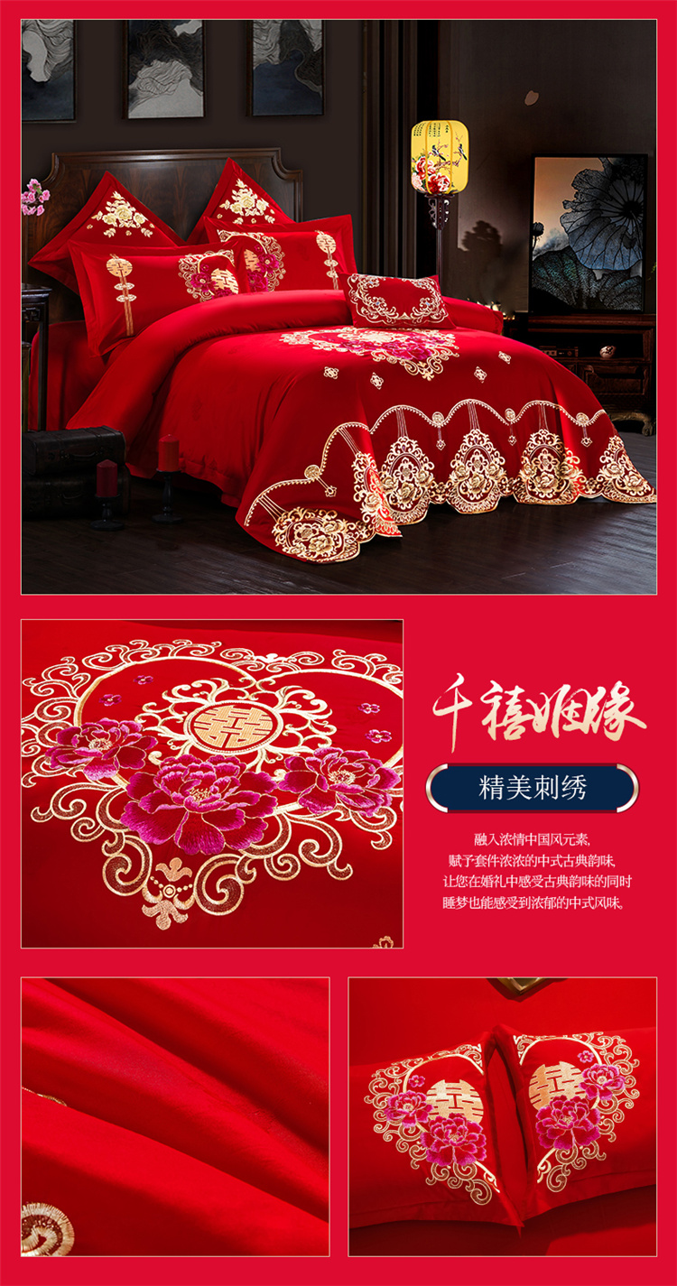 千禧婚庆专供 长绒棉贡缎提花绣花婚庆套件 千禧姻缘