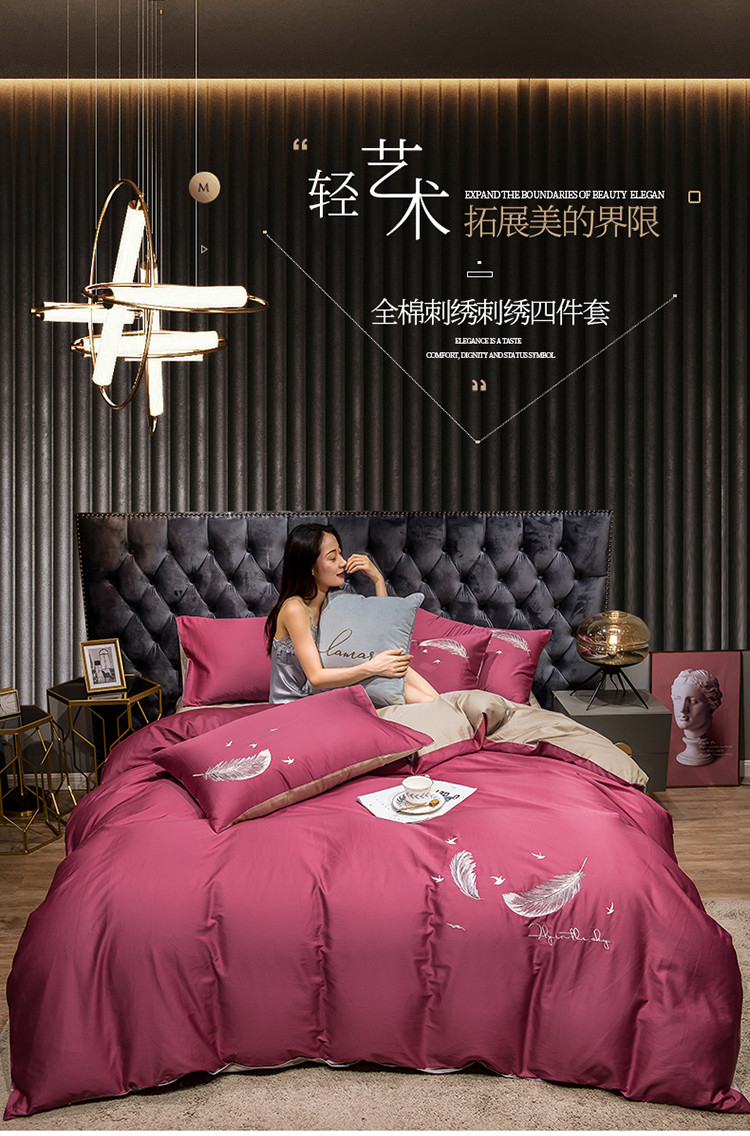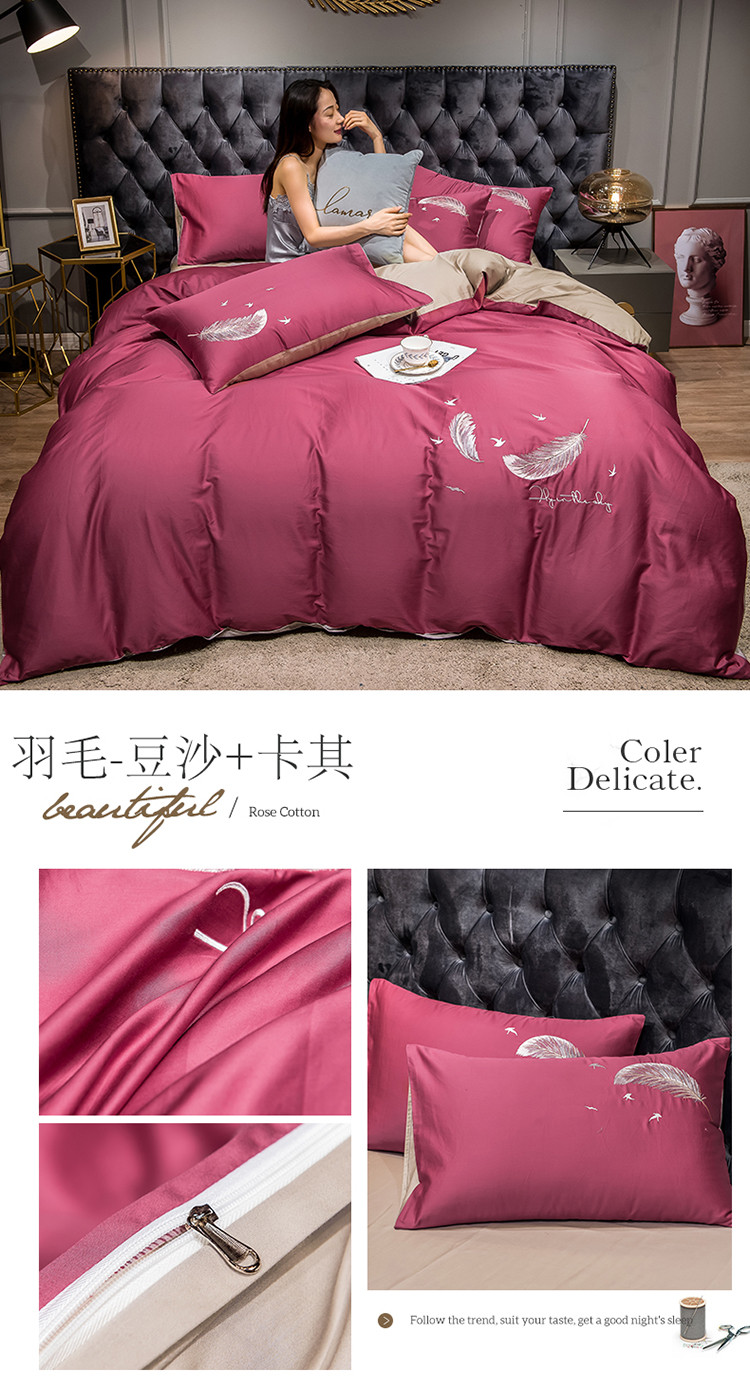 骏腾 2022新款全棉羽毛绣花四件套 羽毛-豆沙+卡其