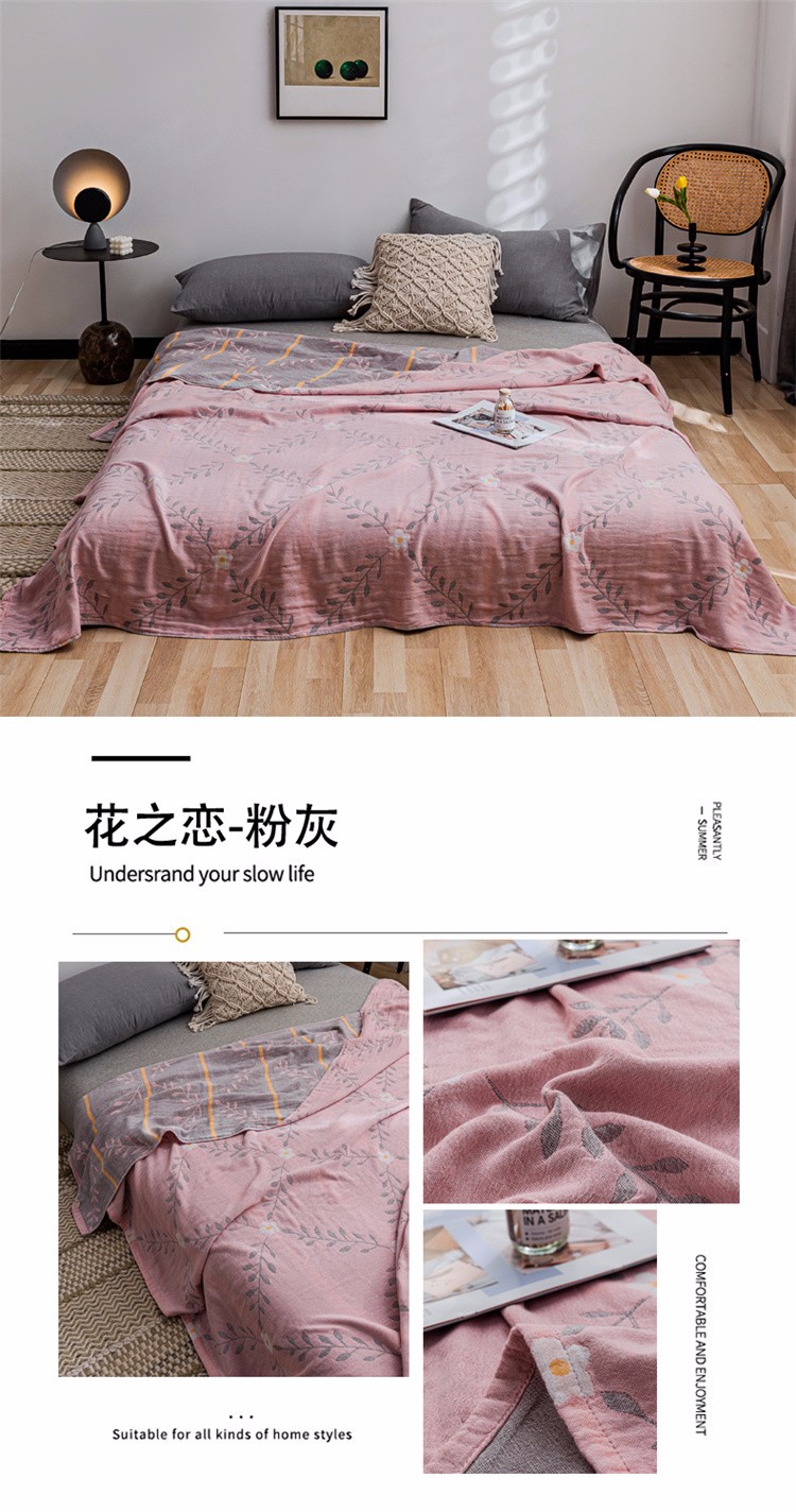 商品名称:朴尔 2021新款主推三层水洗棉纱布毛巾被花之恋-粉灰