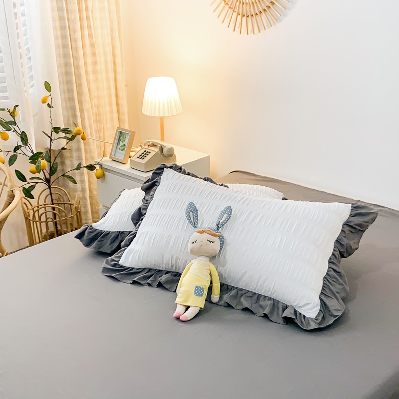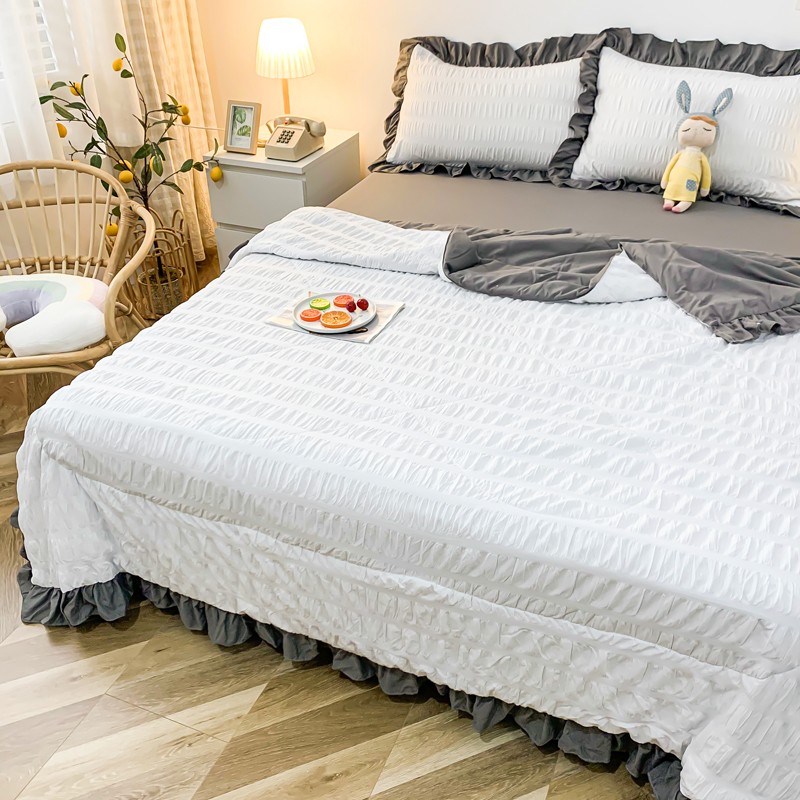 仟网汇2021新款泡泡纱夏被四件套 泡芙小姐-梨花白灰