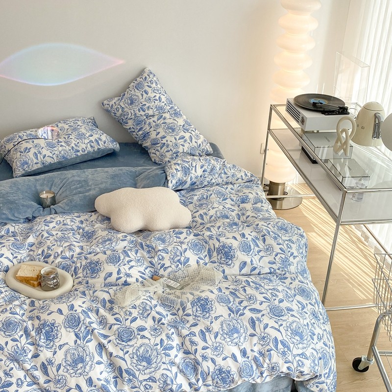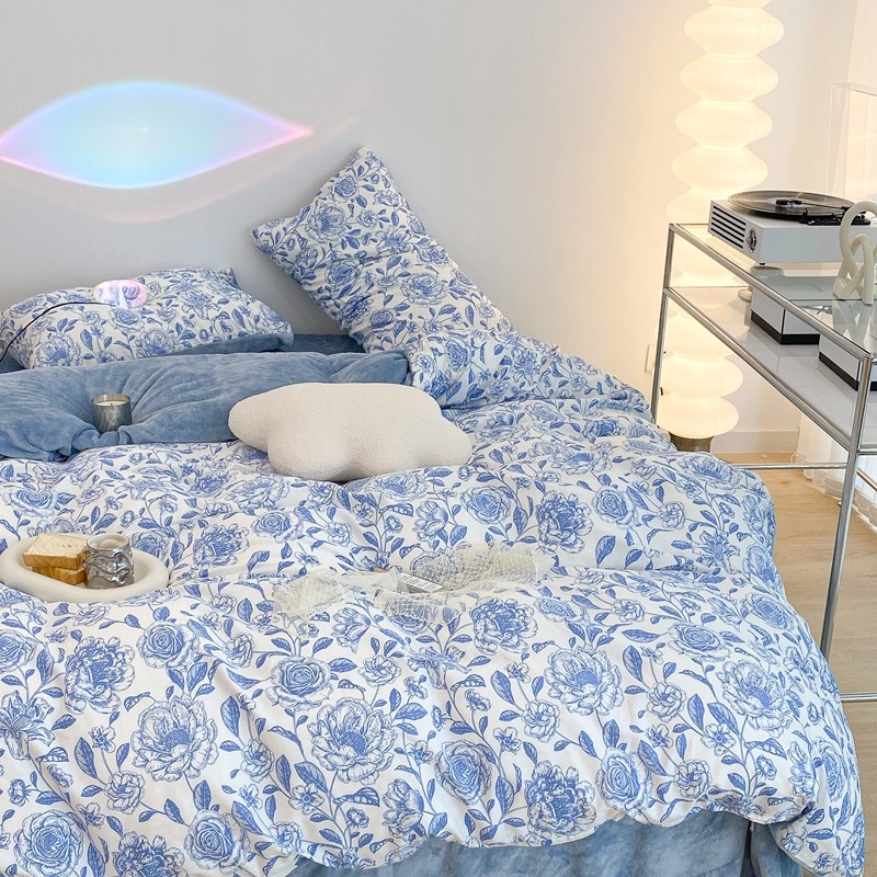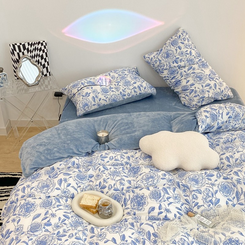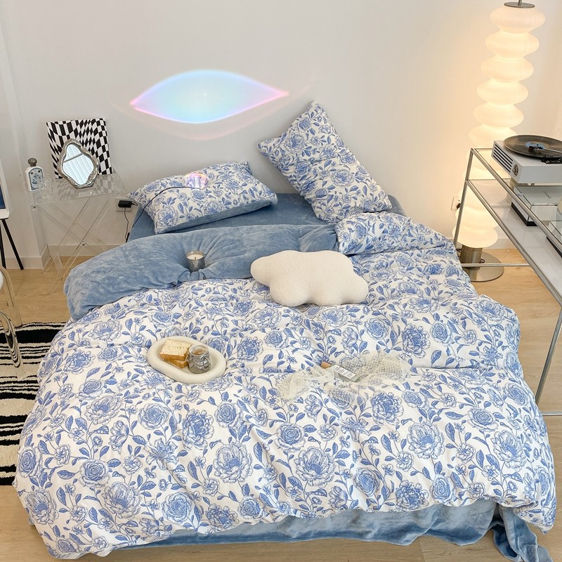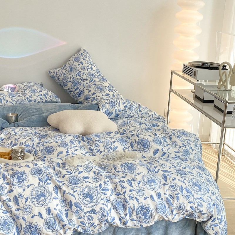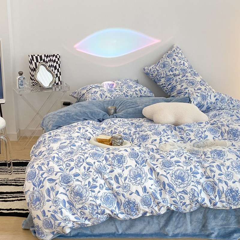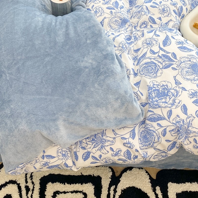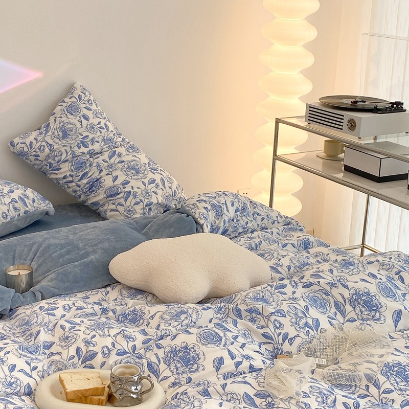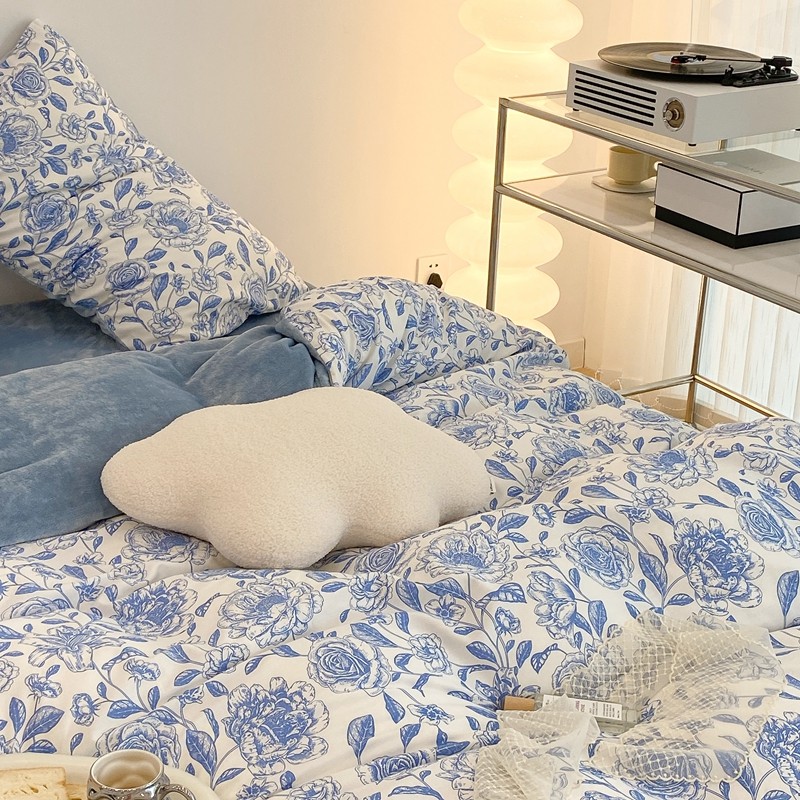 商品名称:昔可家纺 2021新款棉加牛奶绒四件套 手绘山茶蓝