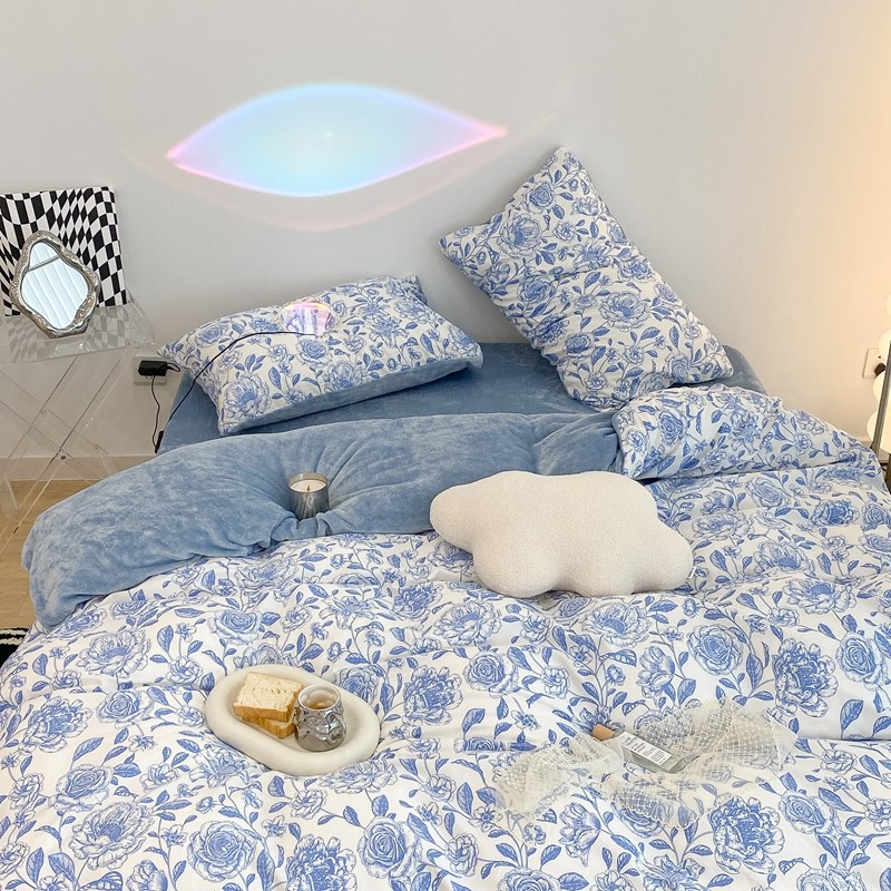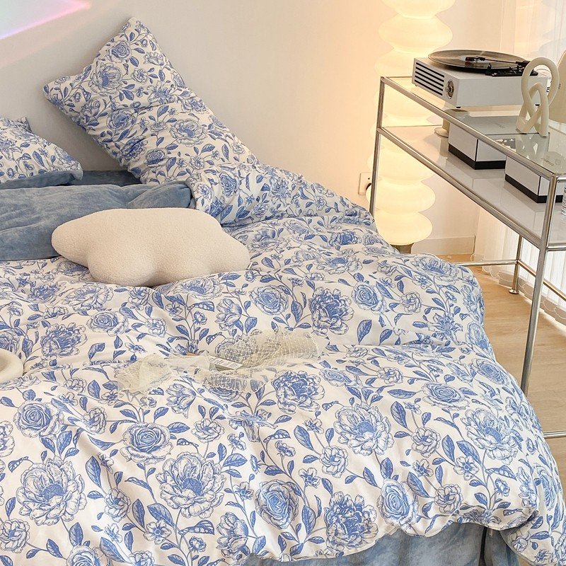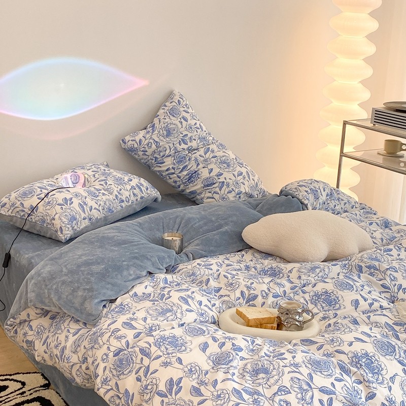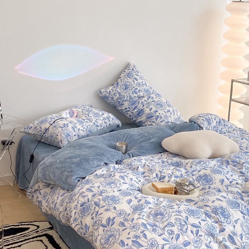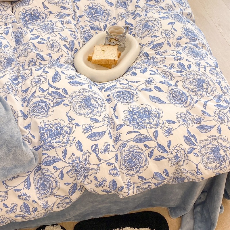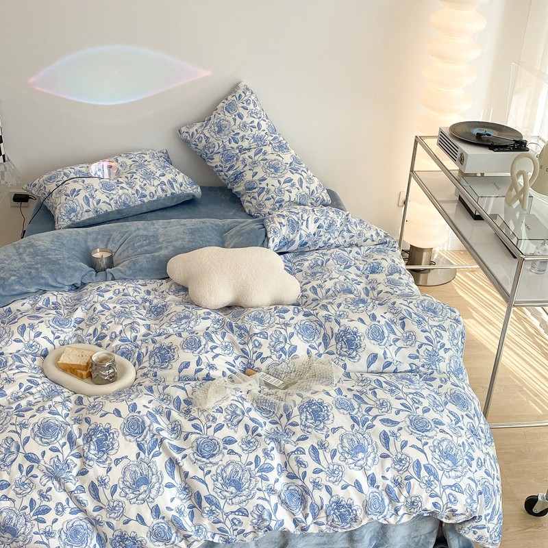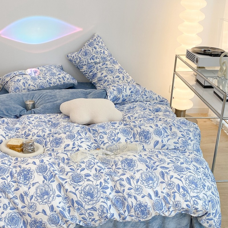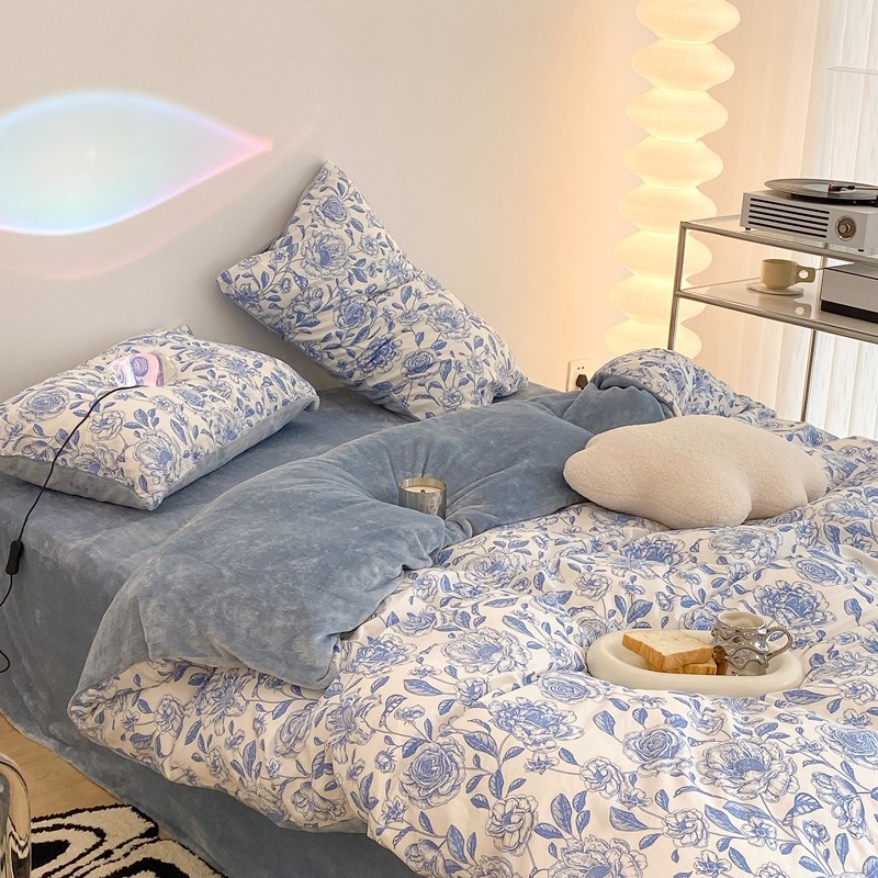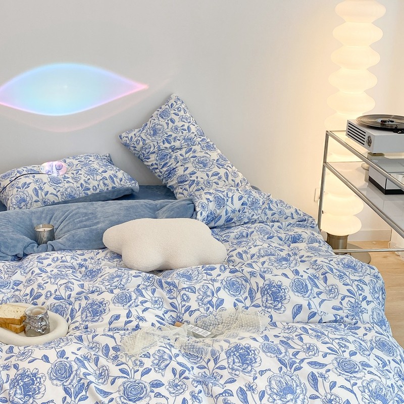 商品名称:昔可家纺 2021新款棉加牛奶绒四件套 手绘山茶蓝