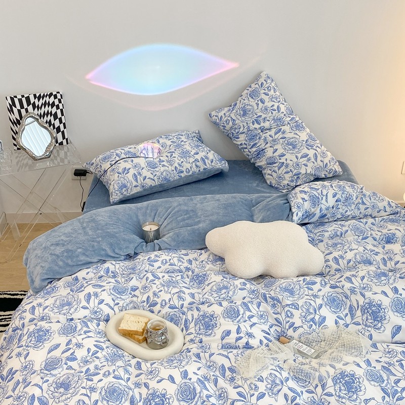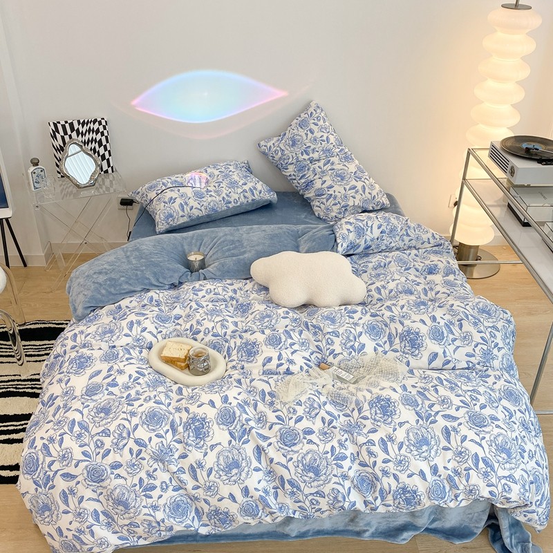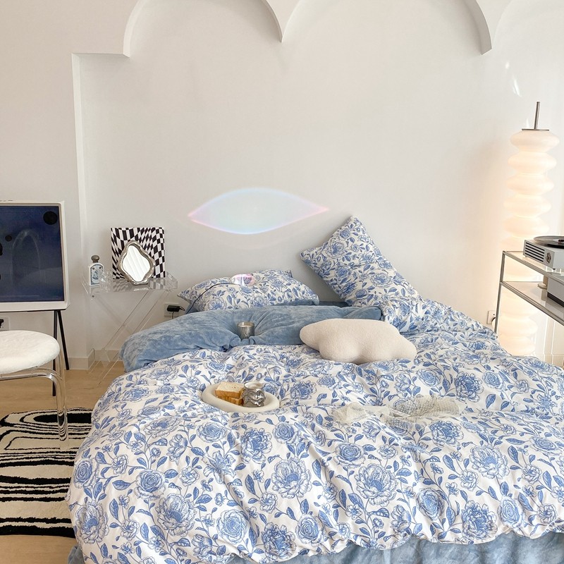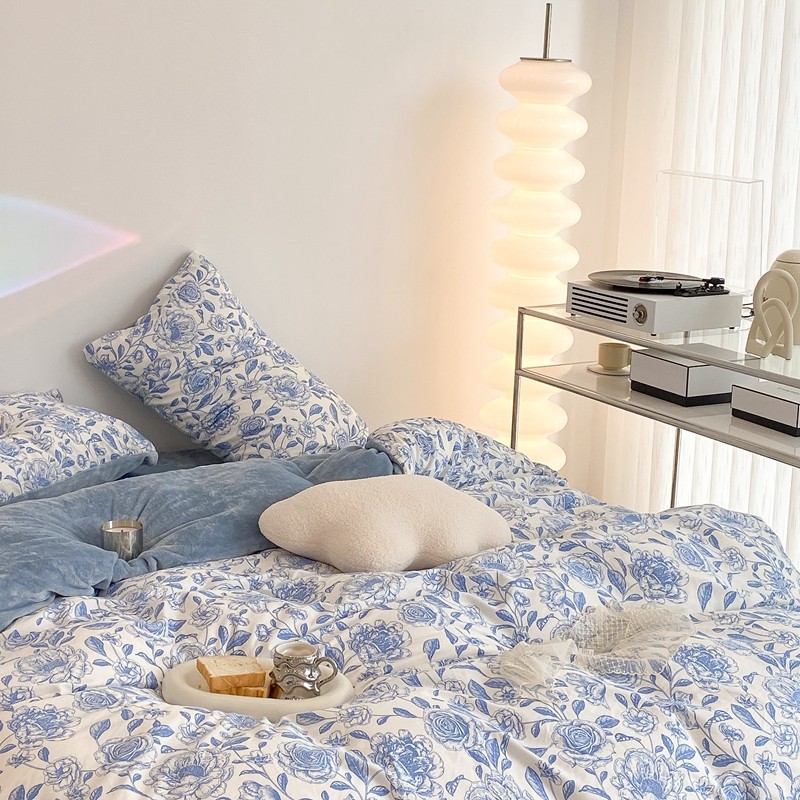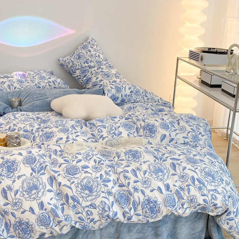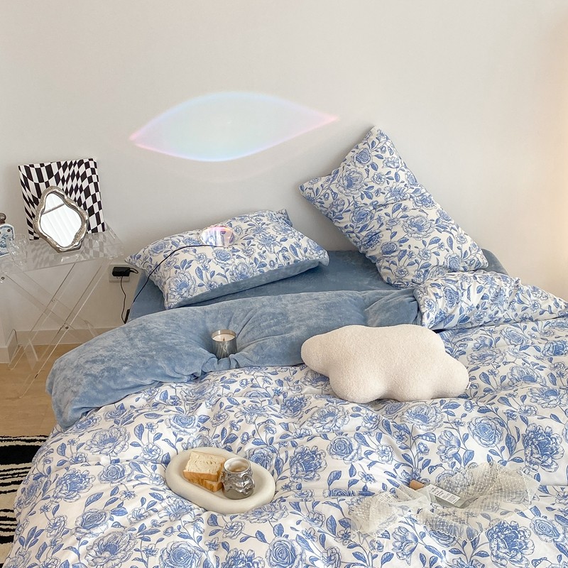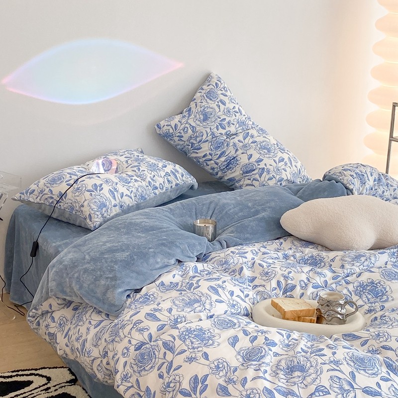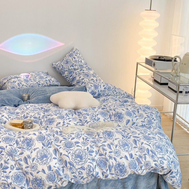 商品名称:昔可家纺 2021新款棉加牛奶绒四件套 手绘山茶蓝