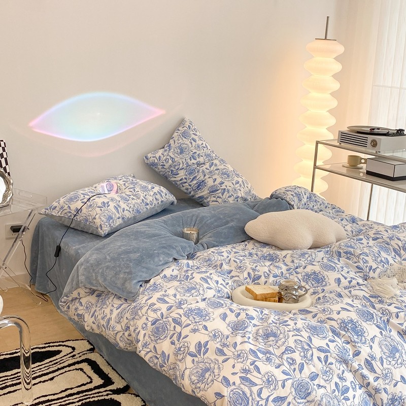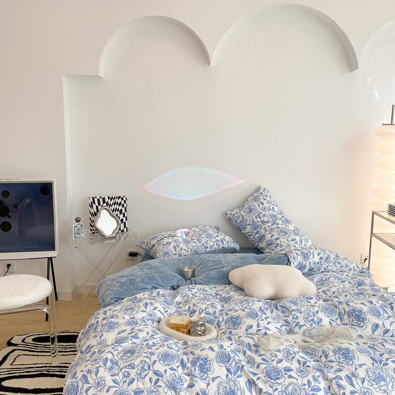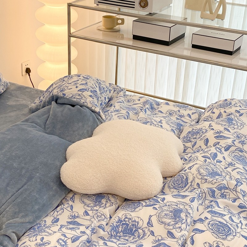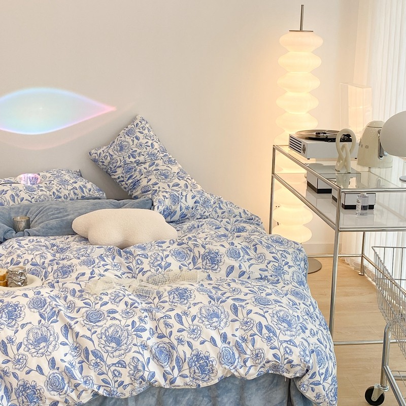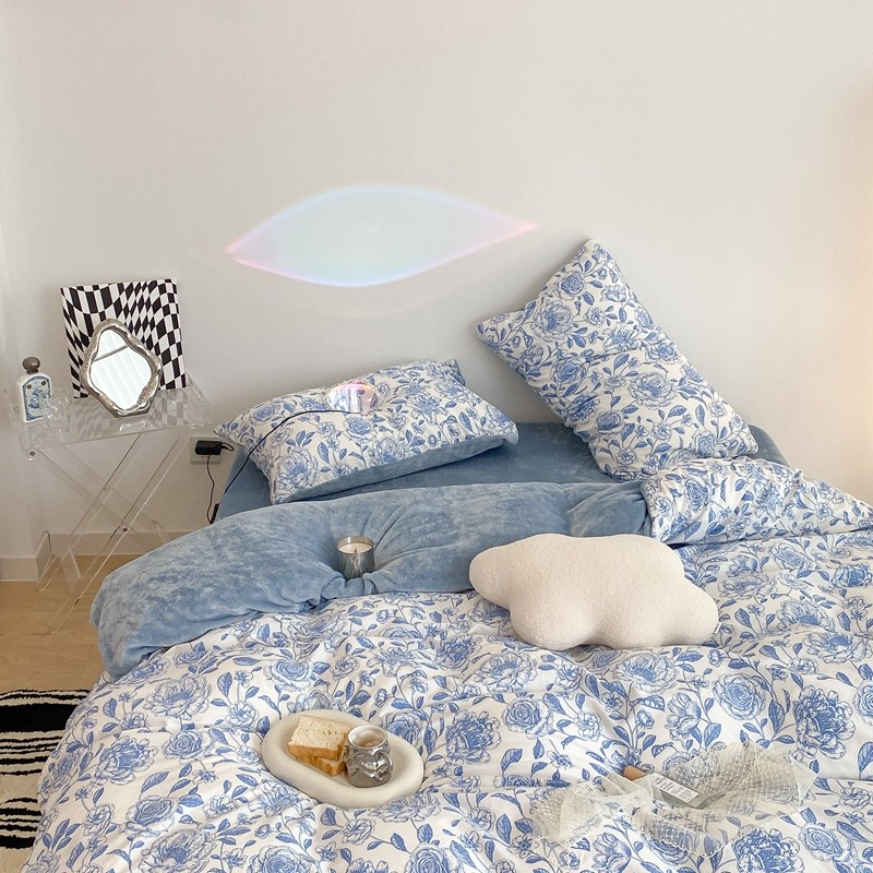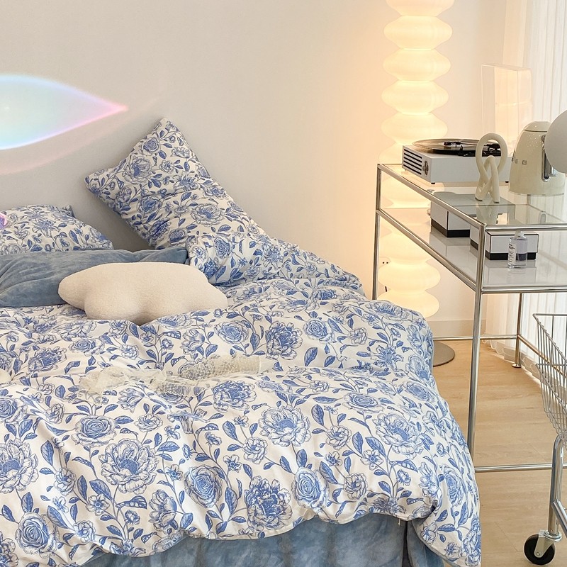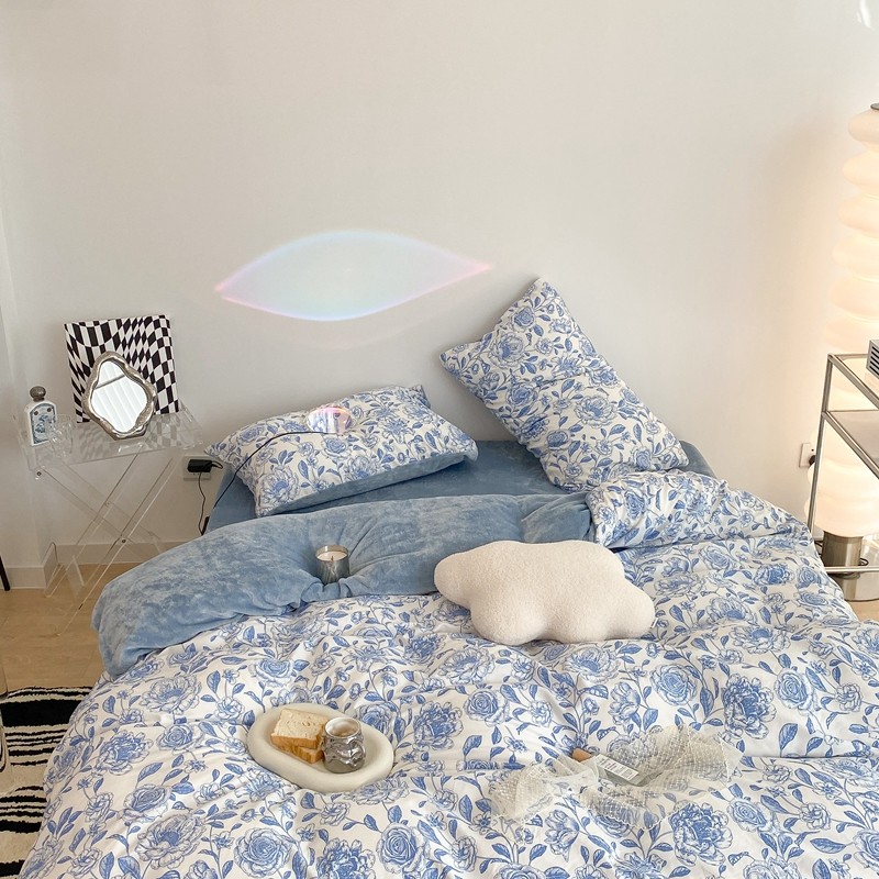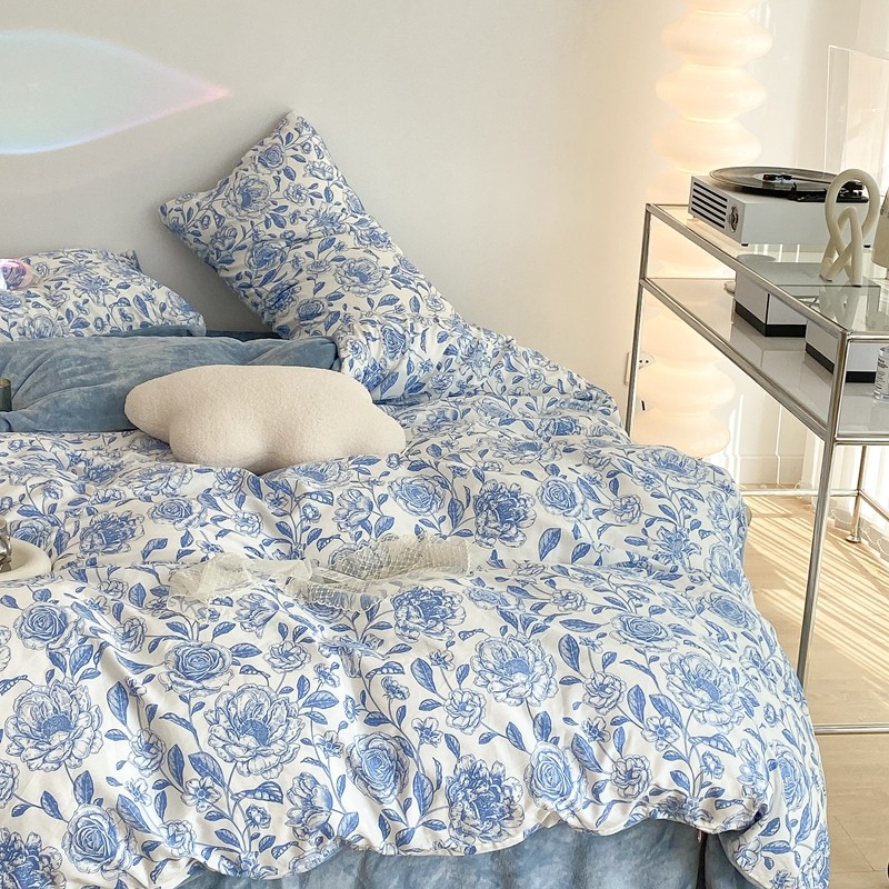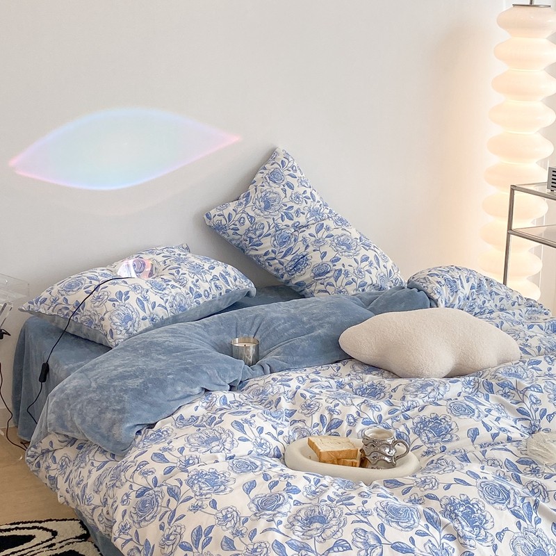 商品名称:昔可家纺 2021新款棉加牛奶绒四件套 手绘山茶蓝