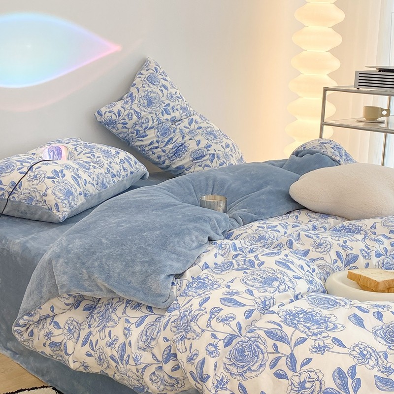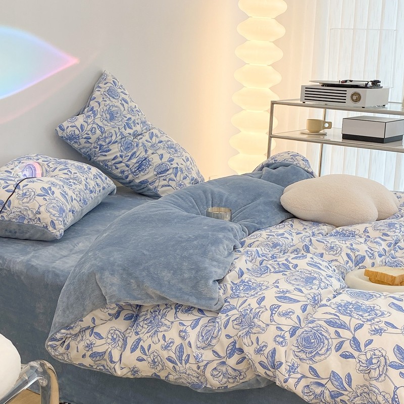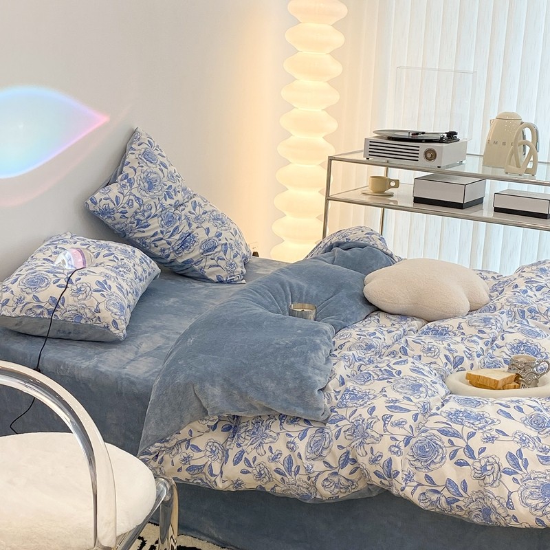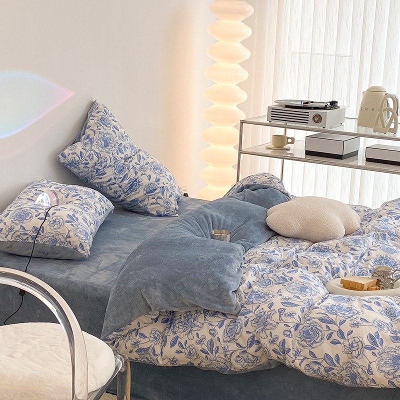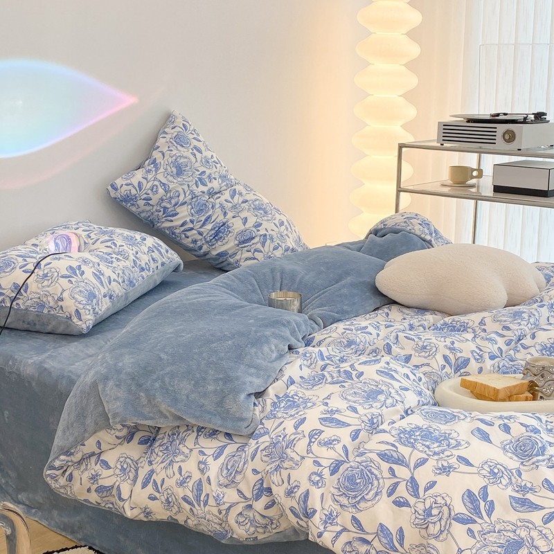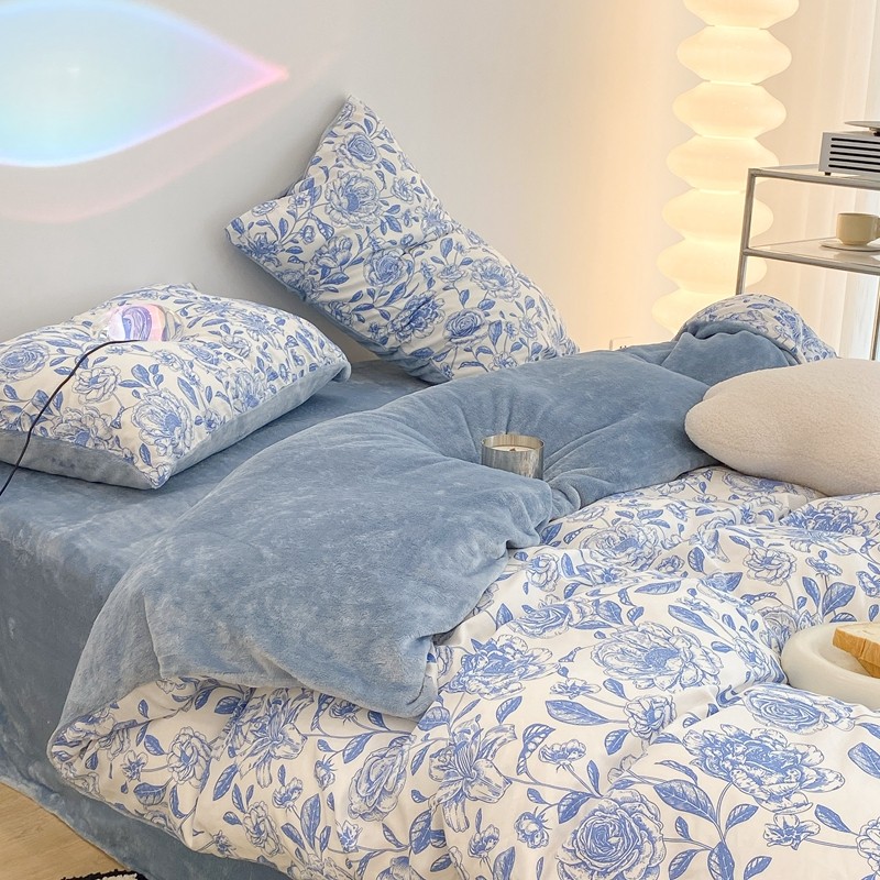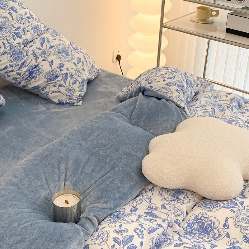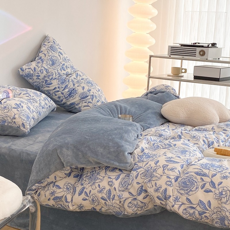 昔可家纺 2021新款棉加牛奶绒四件套 手绘山茶蓝