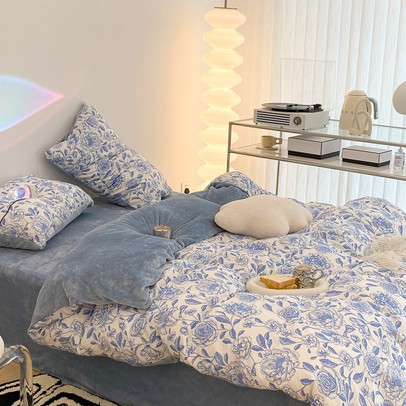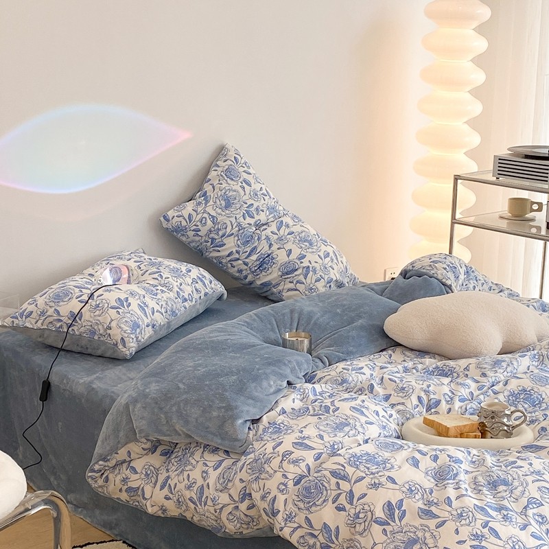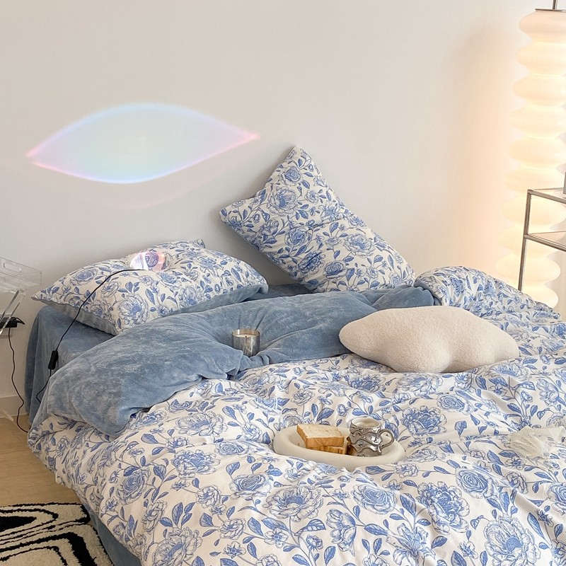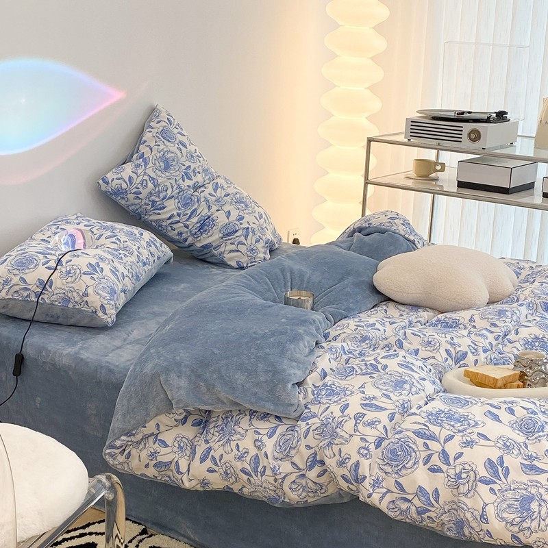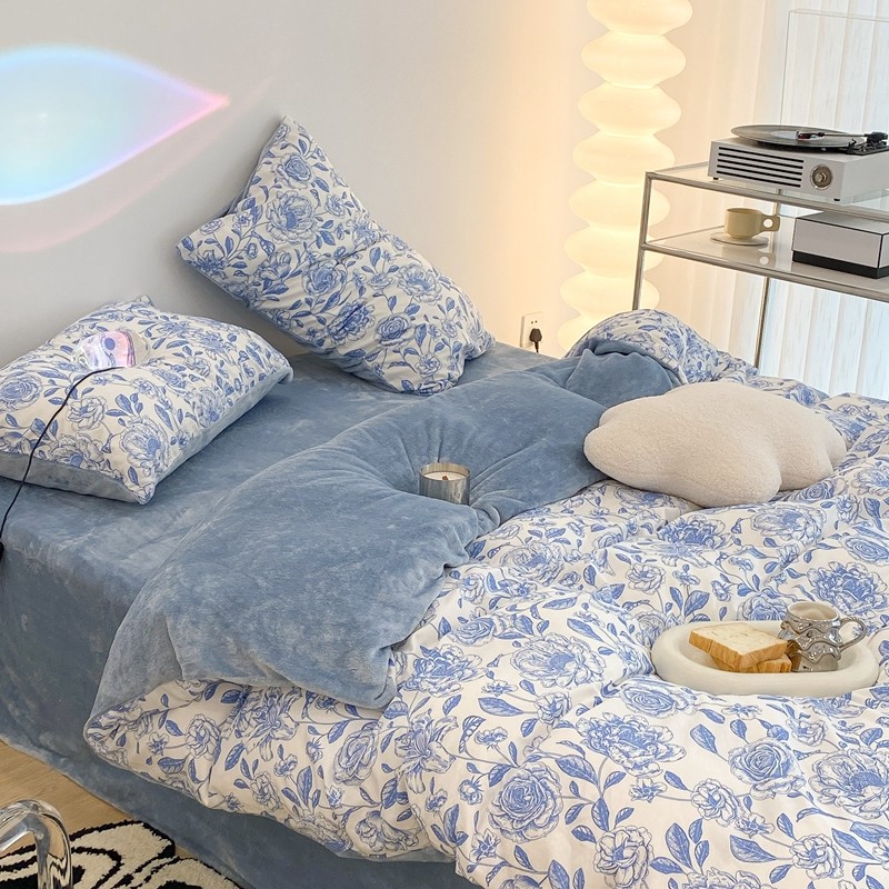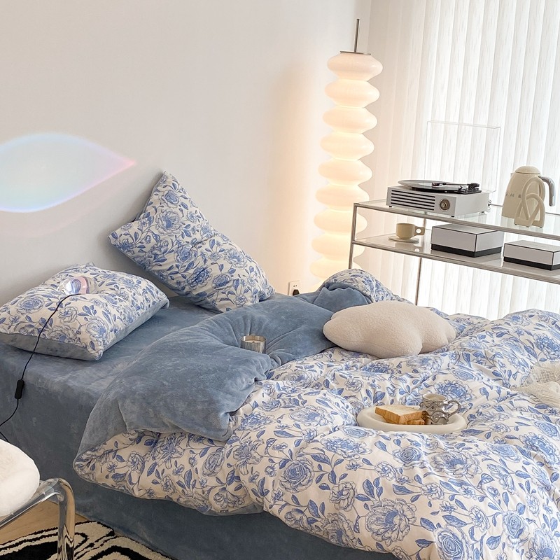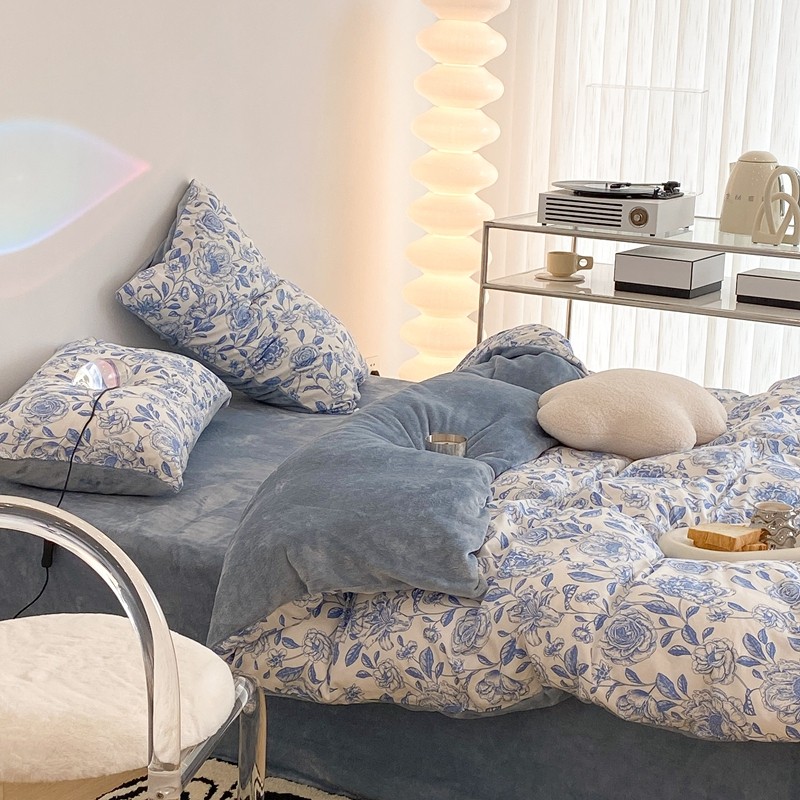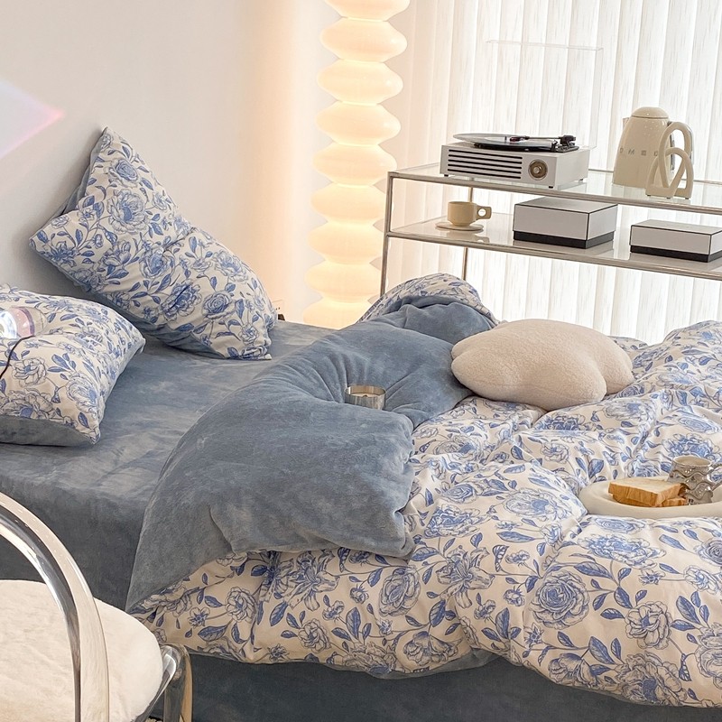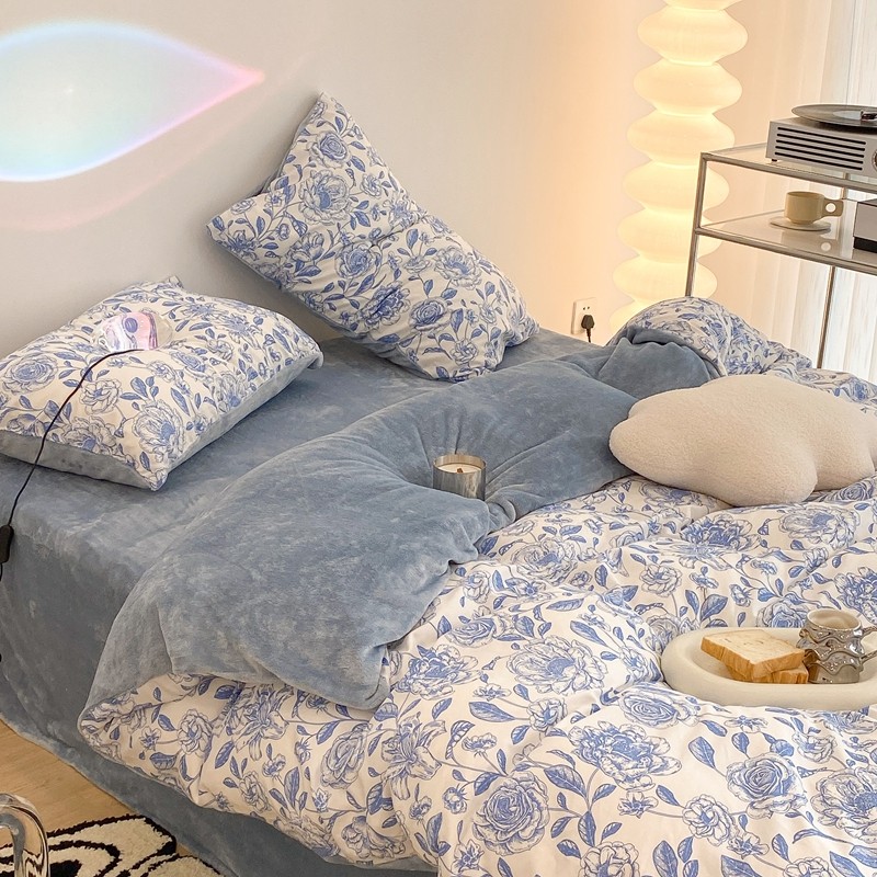 昔可家纺 2021新款棉加牛奶绒四件套 手绘山茶蓝