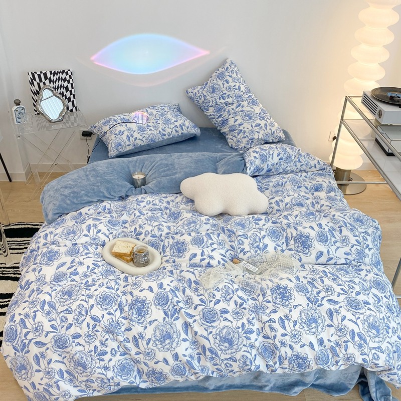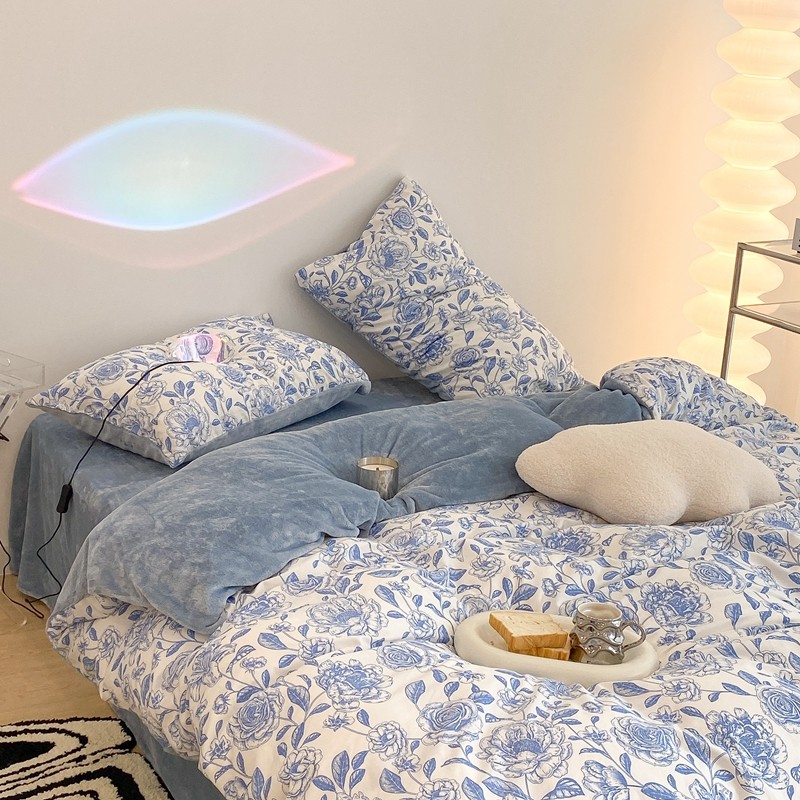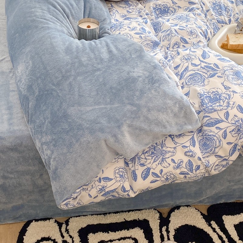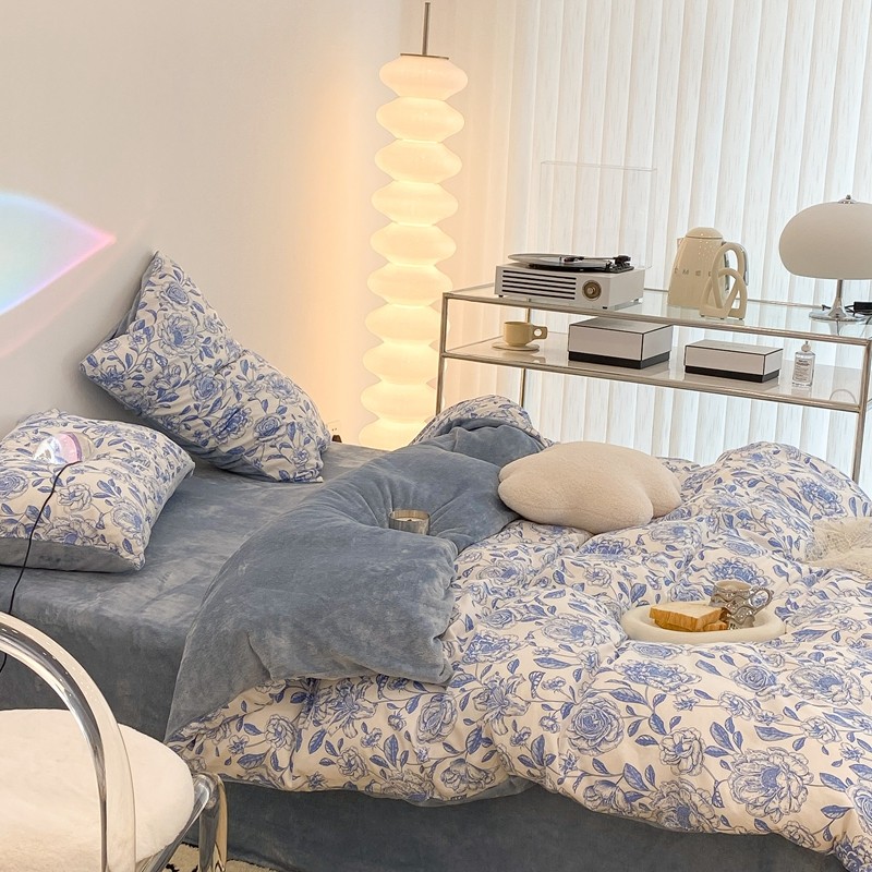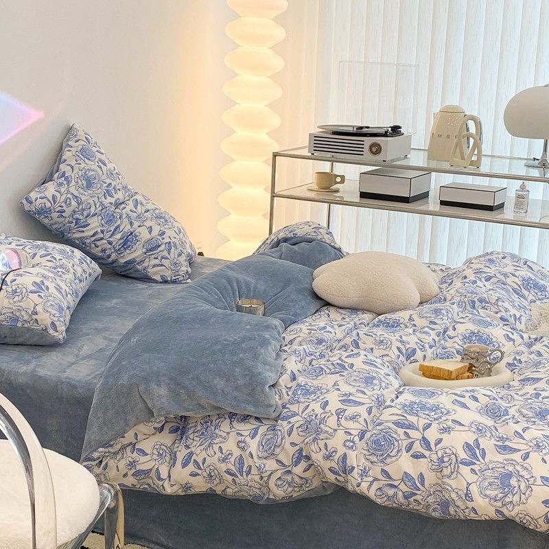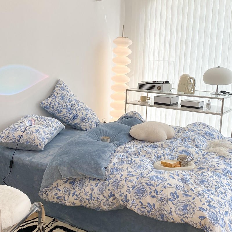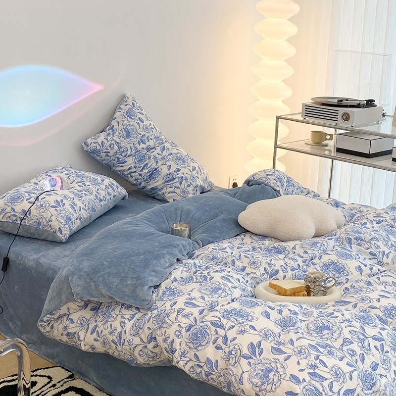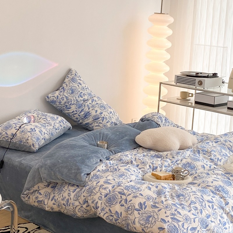 昔可家纺 2021新款棉加牛奶绒四件套 手绘山茶蓝