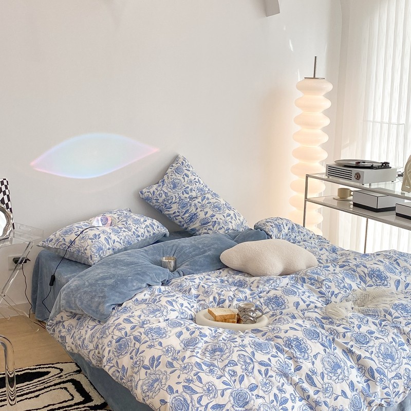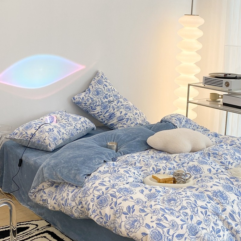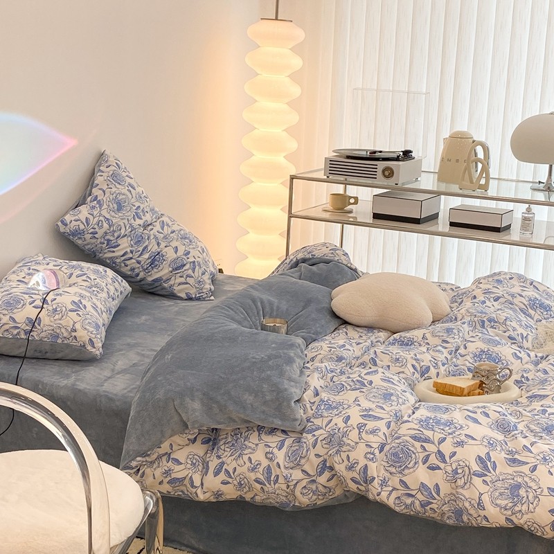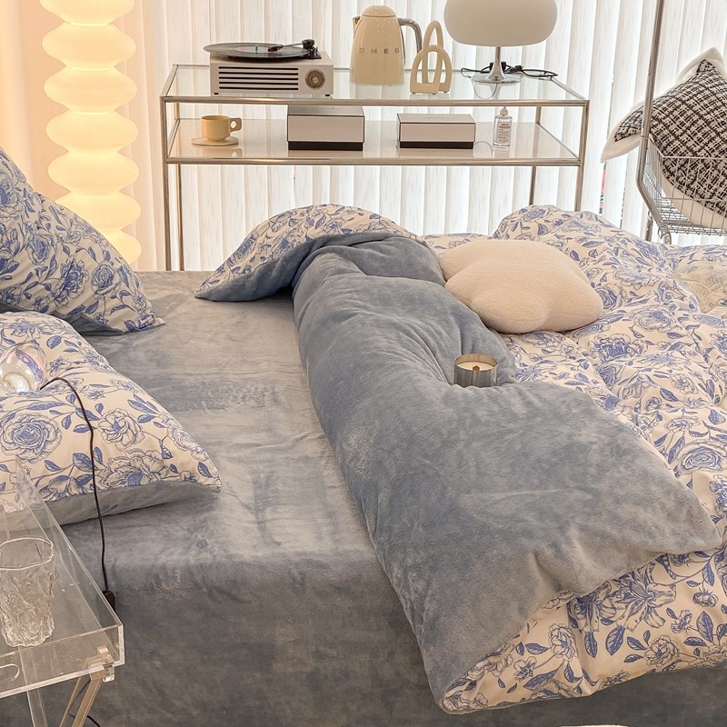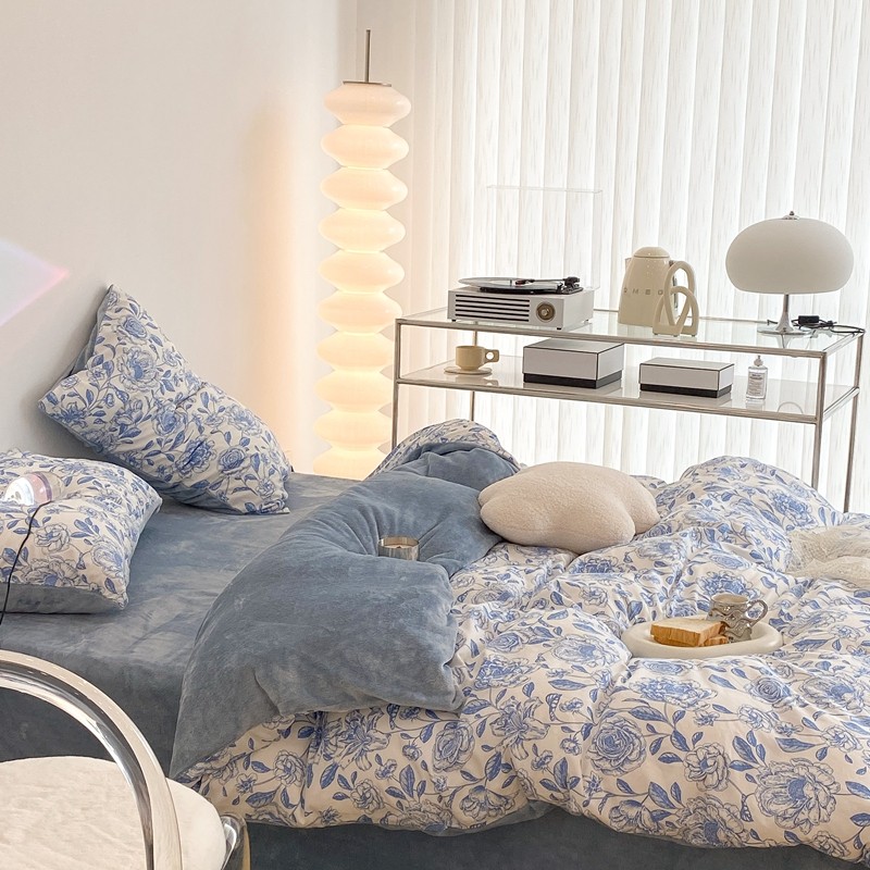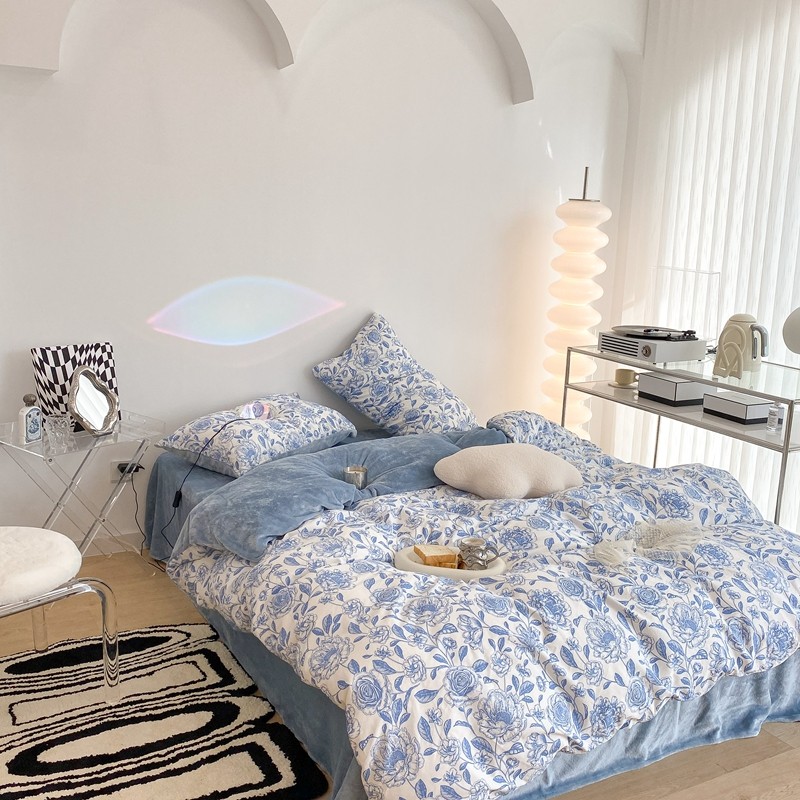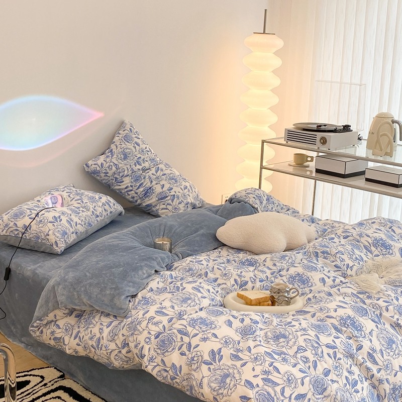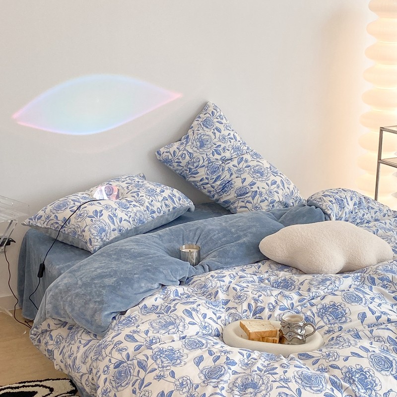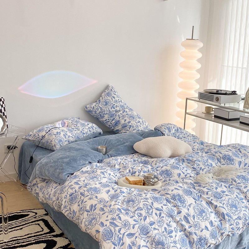 昔可家纺 2021新款棉加牛奶绒四件套 手绘山茶蓝