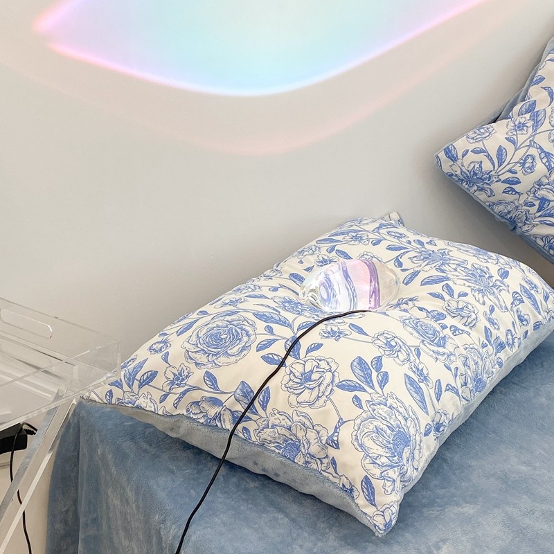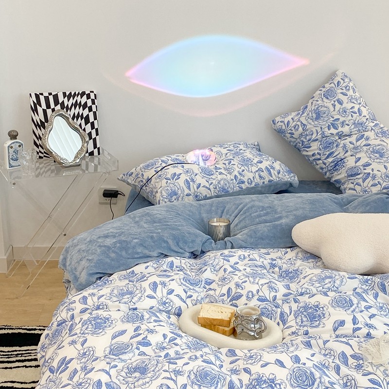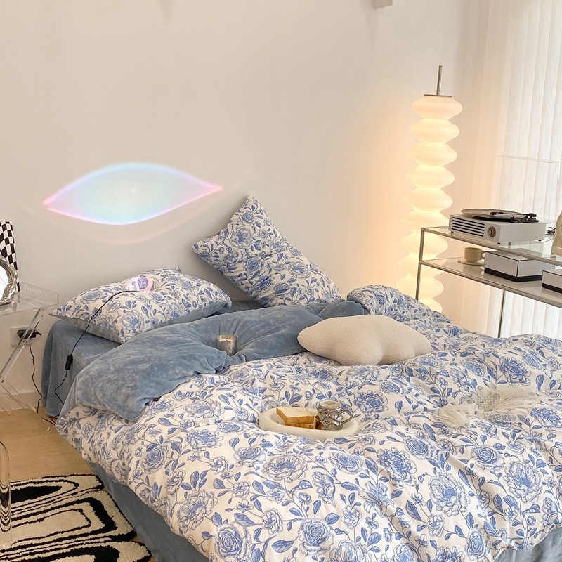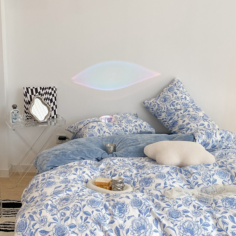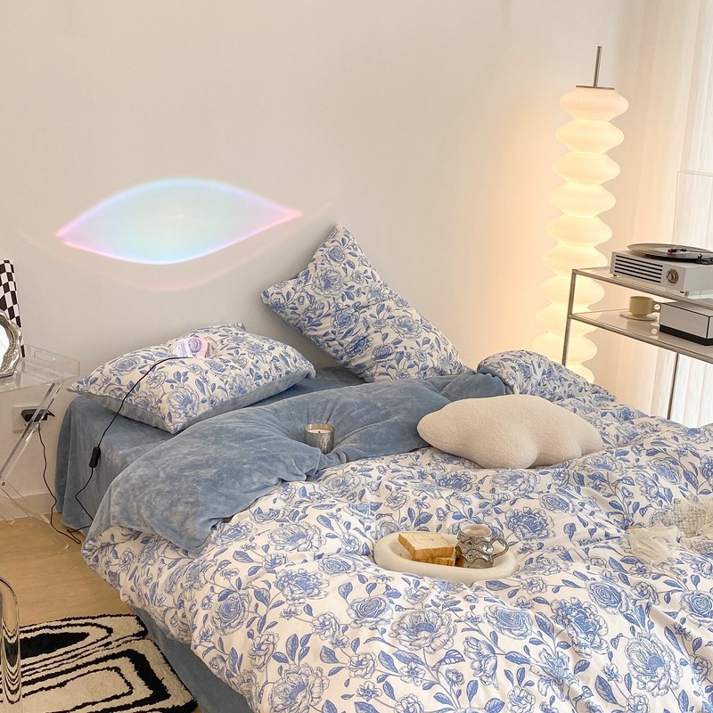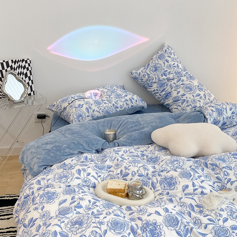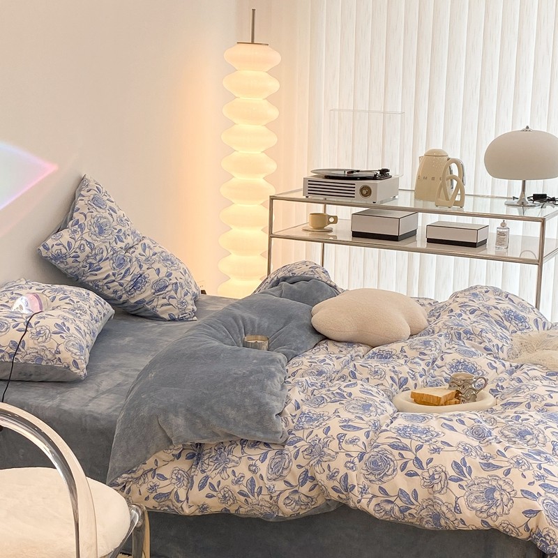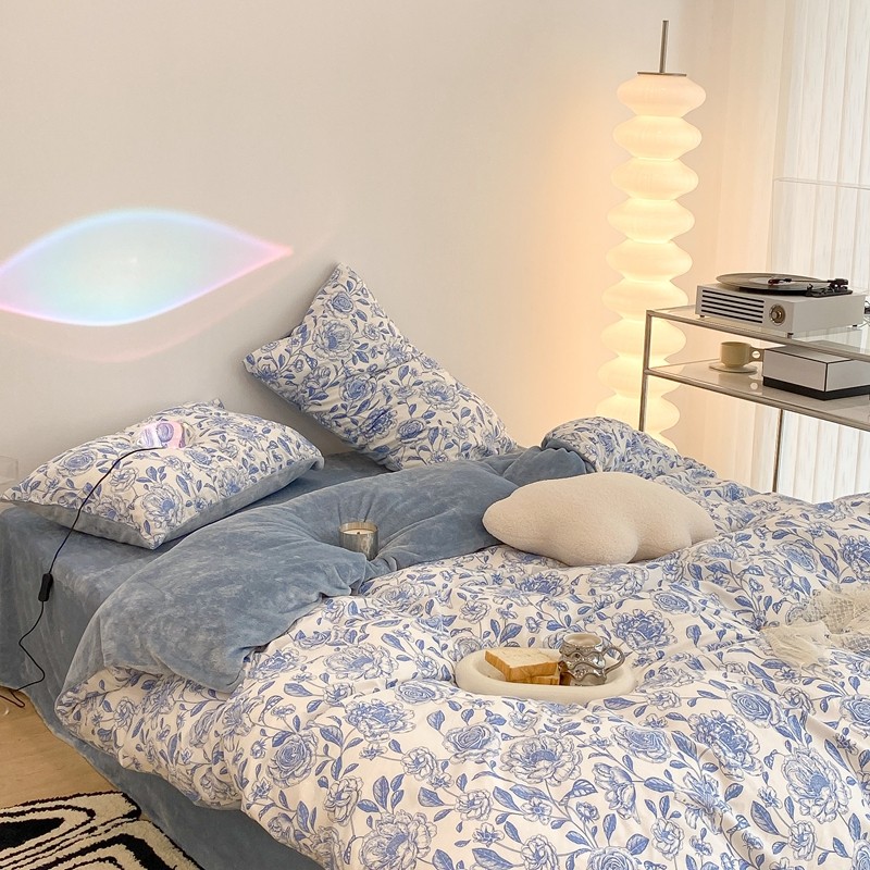 昔可家纺 2021新款棉加牛奶绒四件套 手绘山茶蓝
