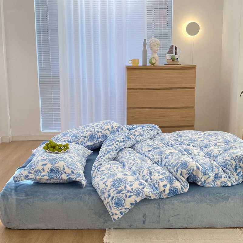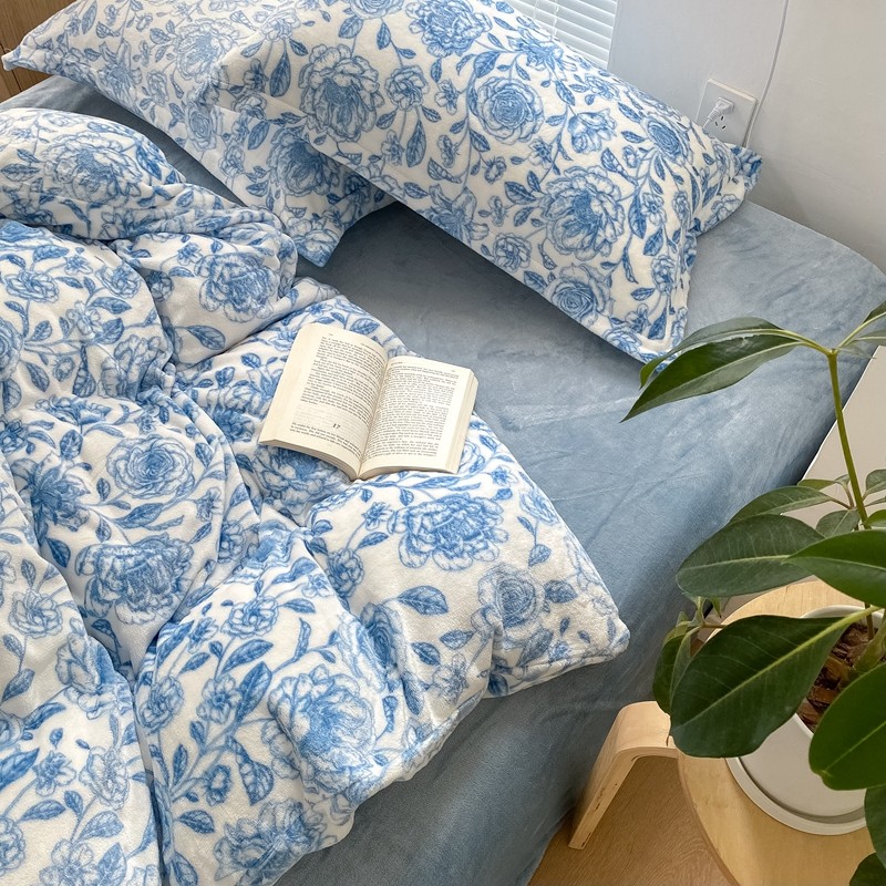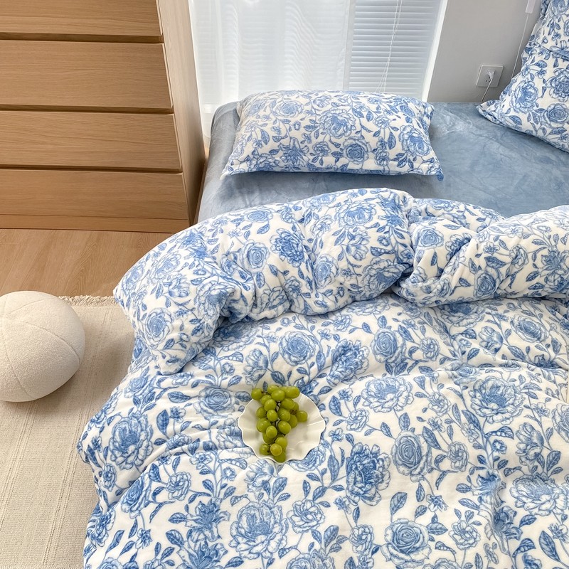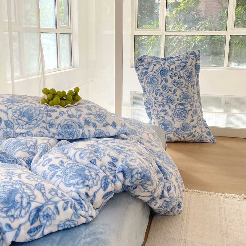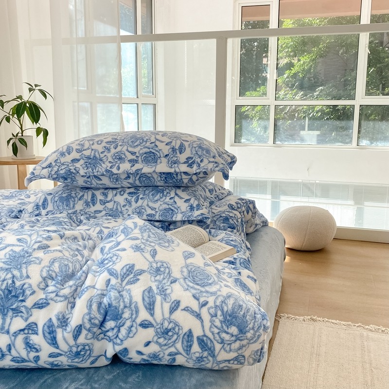 昔可家纺 2021新款牛奶绒四件套第二组图 手绘山茶蓝