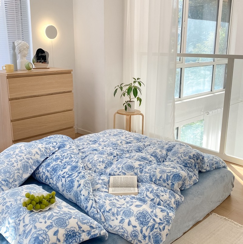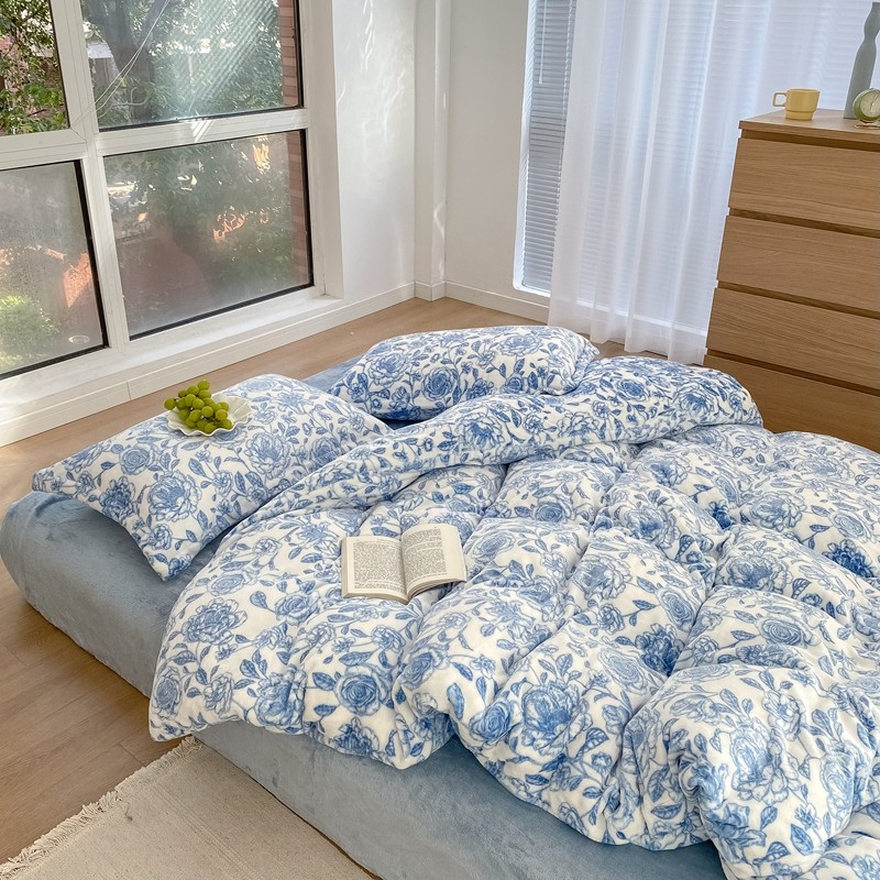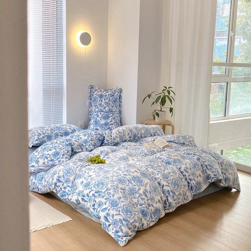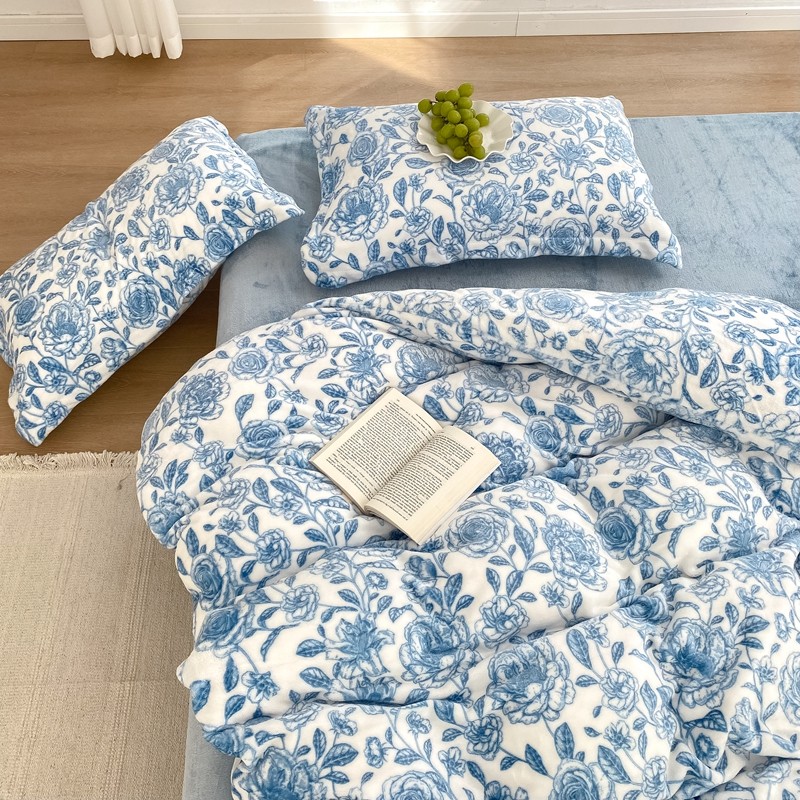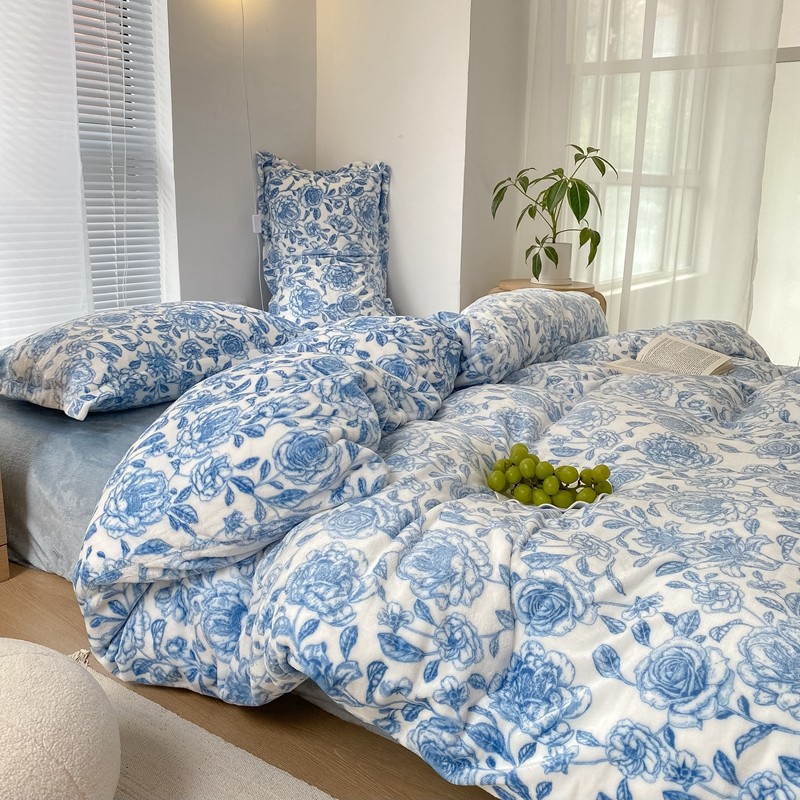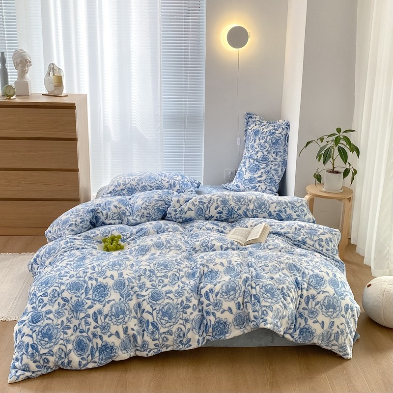 昔可家纺 2021新款牛奶绒四件套第二组图 手绘山茶蓝