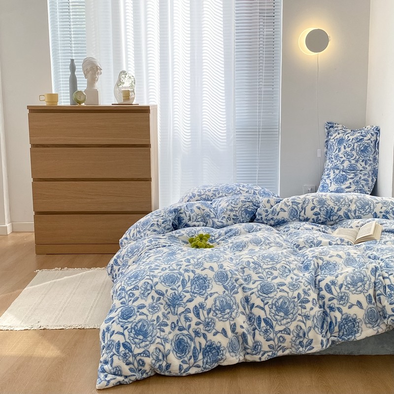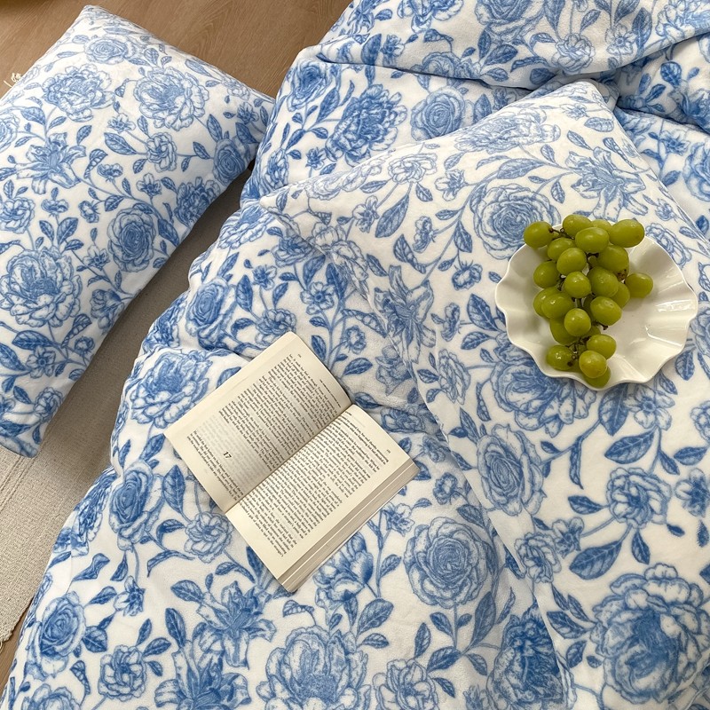 商品名称:昔可家纺 2021新款牛奶绒四件套第二组图 手绘山茶蓝