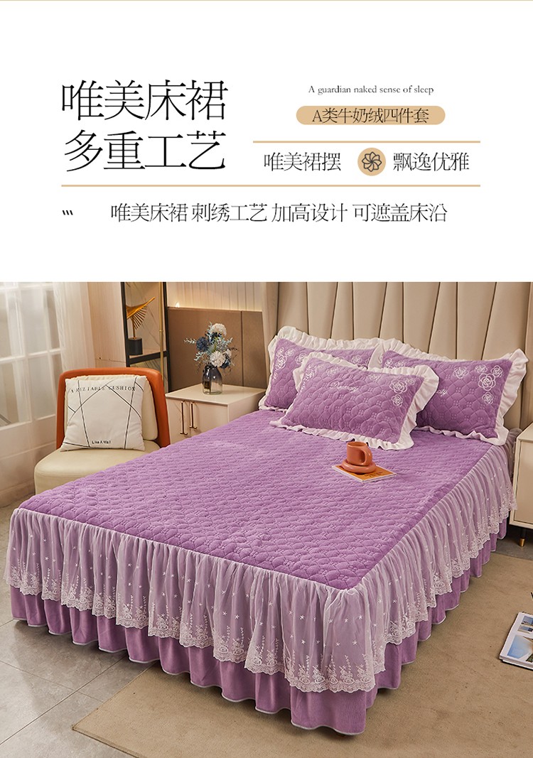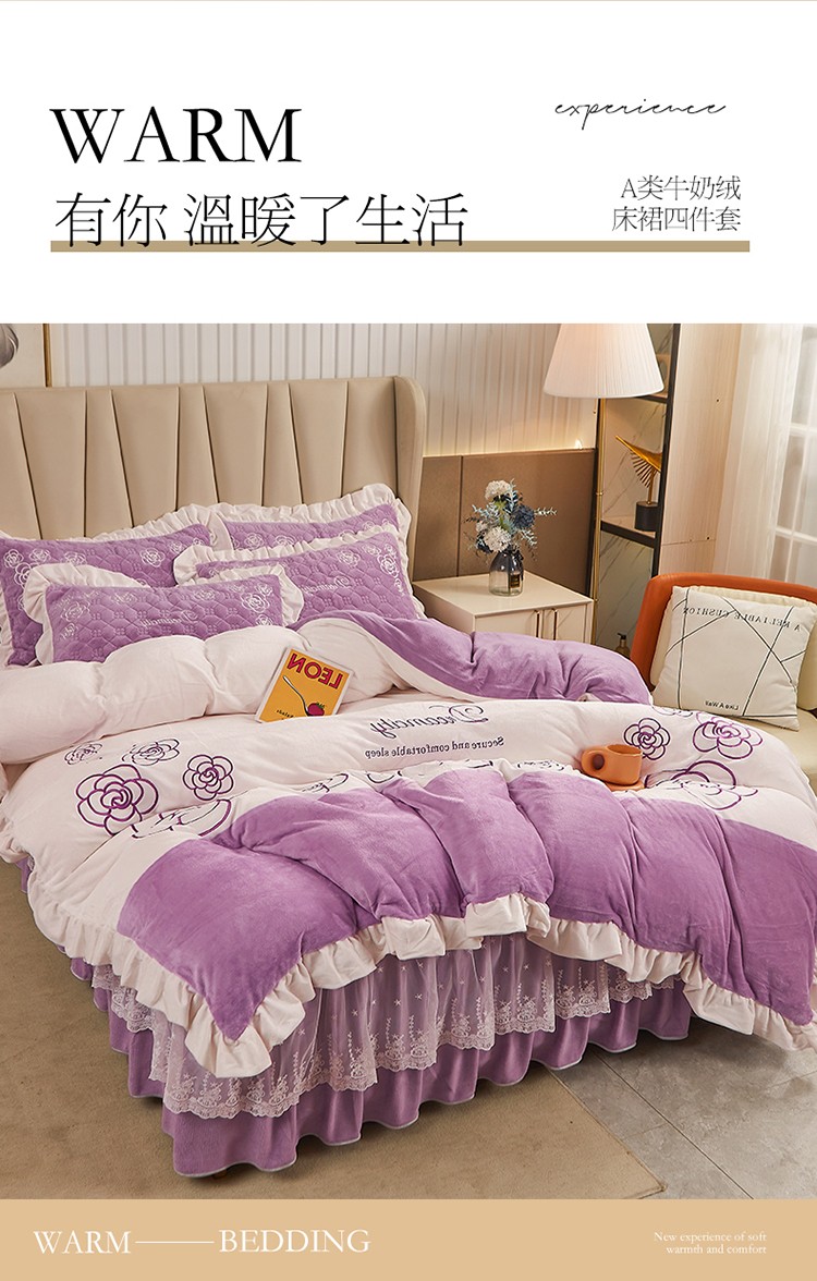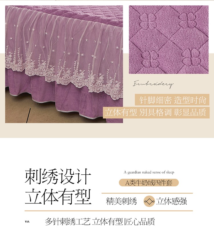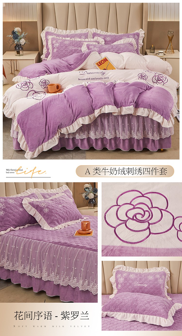 • 91家纺网 家纺一手货源 找家纺 宜凡 2022新款A类牛奶绒绣花床裙三四件套 花间序语-紫罗兰