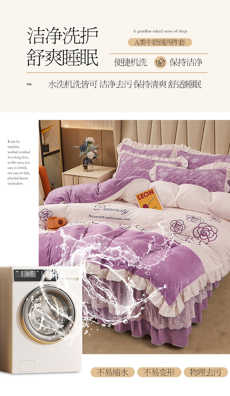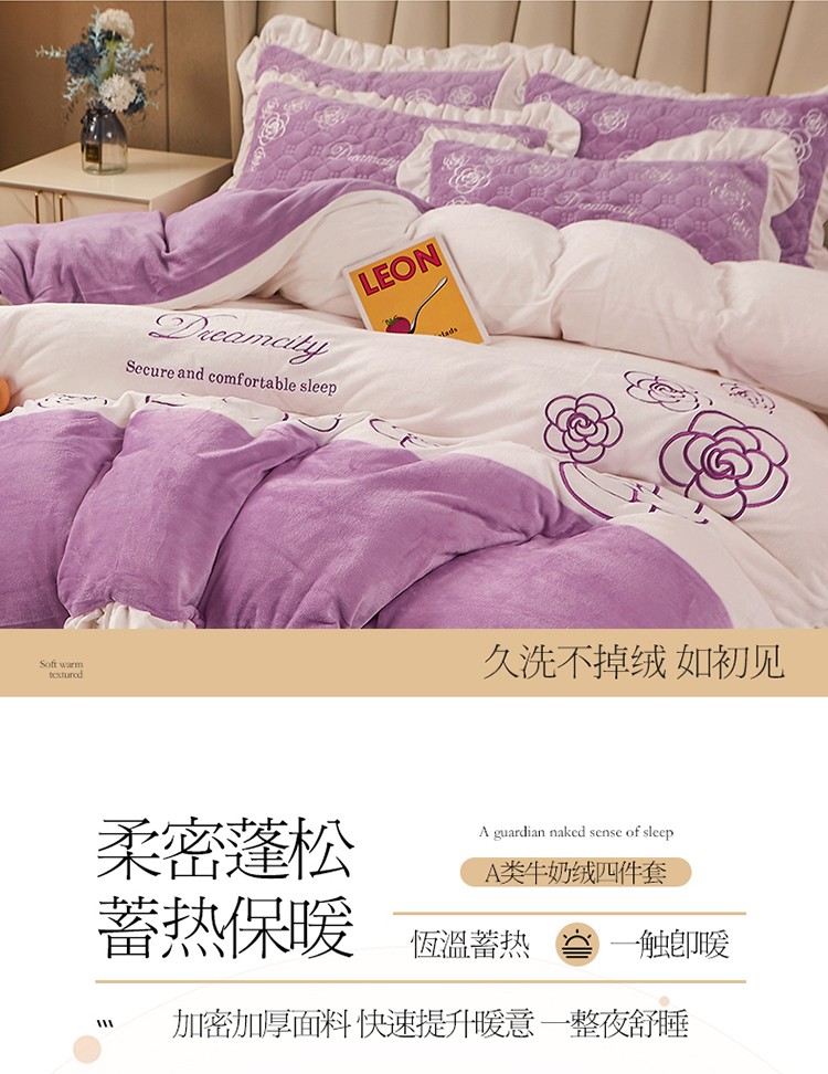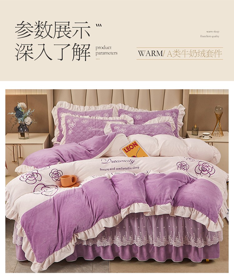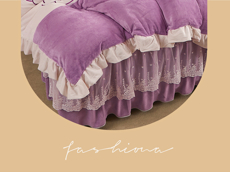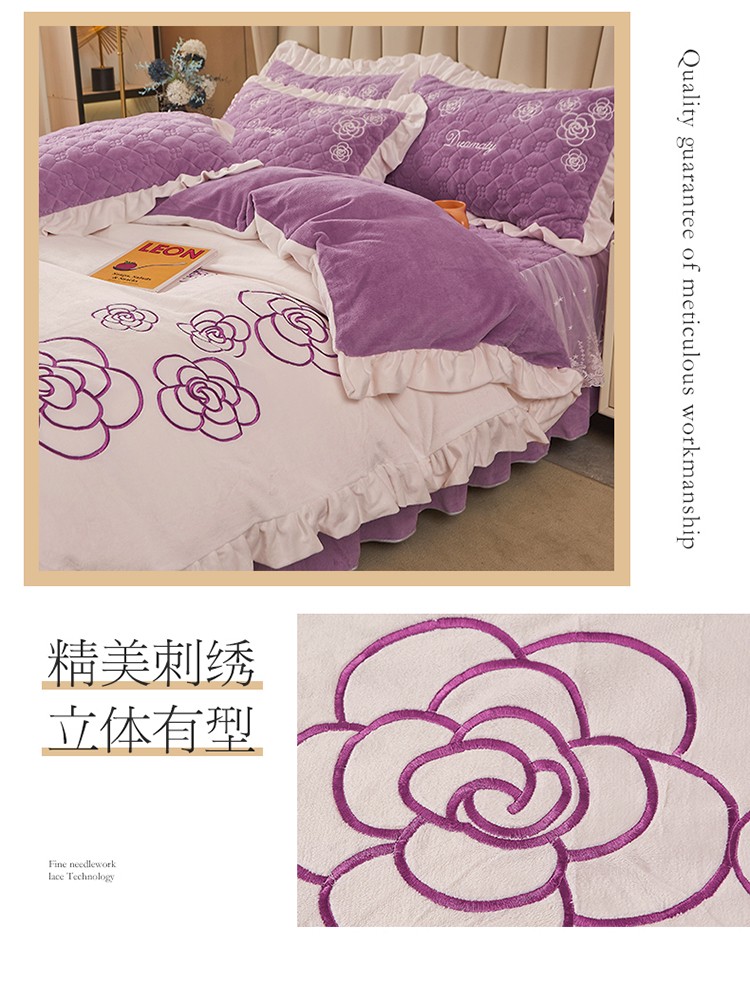 • 91家纺网 家纺一手货源 找家纺 宜凡 2022新款A类牛奶绒绣花床裙三四件套 花间序语-紫罗兰
