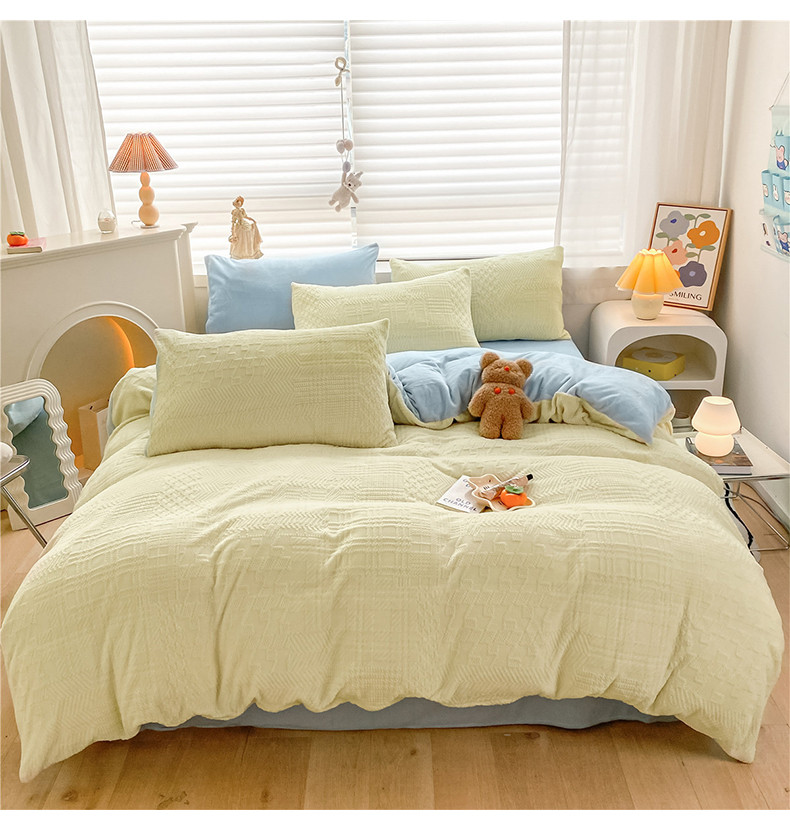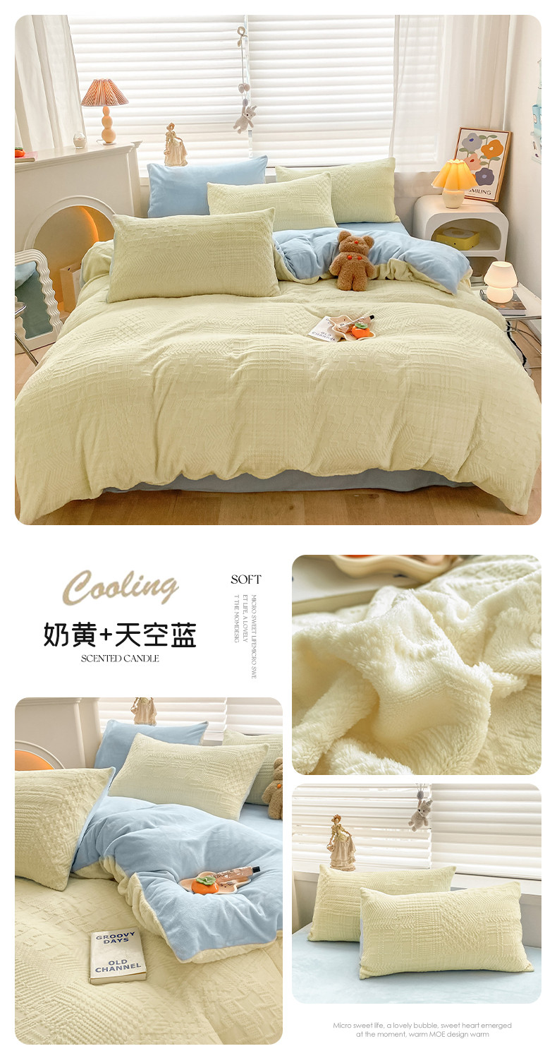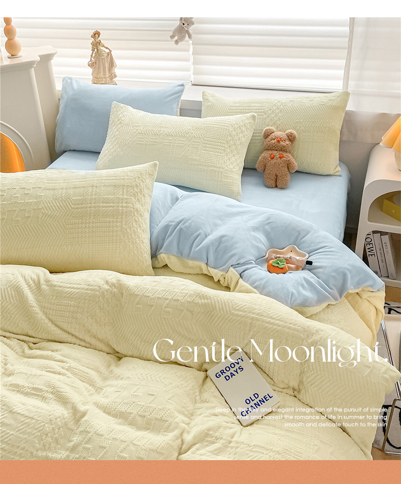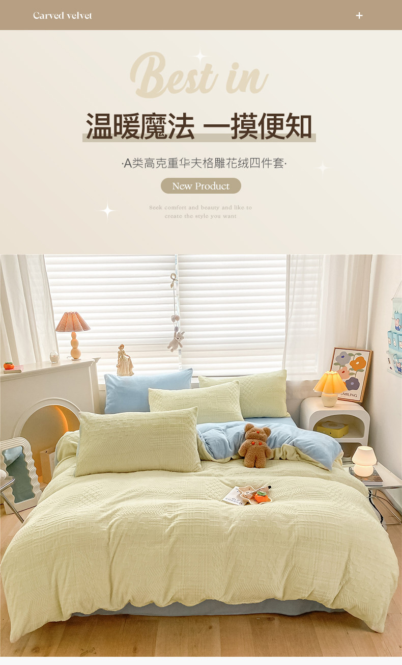 当前位置: 91家纺网 > 商品网购 > 床品套件 > 四件套 > 雕花绒四件套 > 古吉梦 2022新款A类高克重华夫格雕花绒四件套 华夫格-奶黄+天空蓝