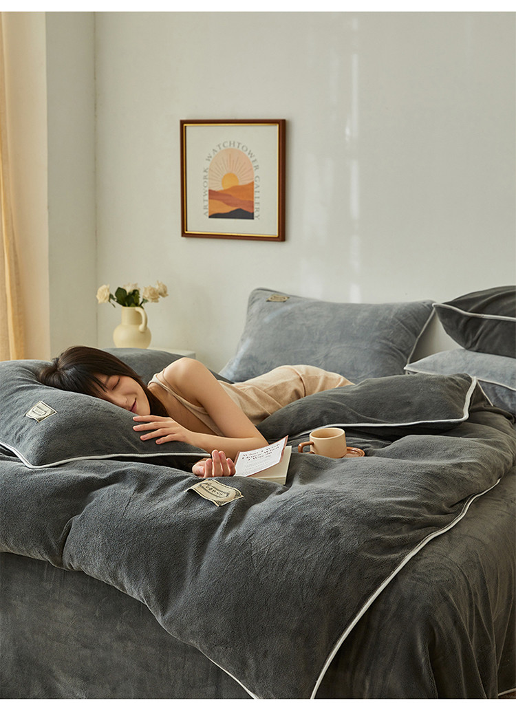 寐眠 2022新款纯色双拼暖冬保暖牛奶绒四件套 深灰