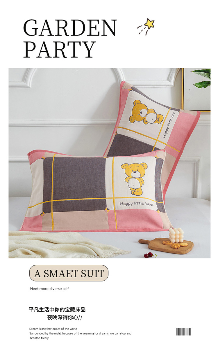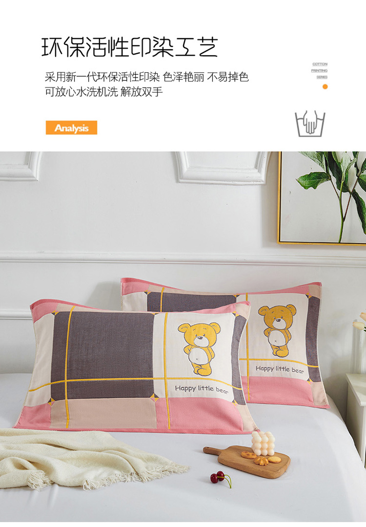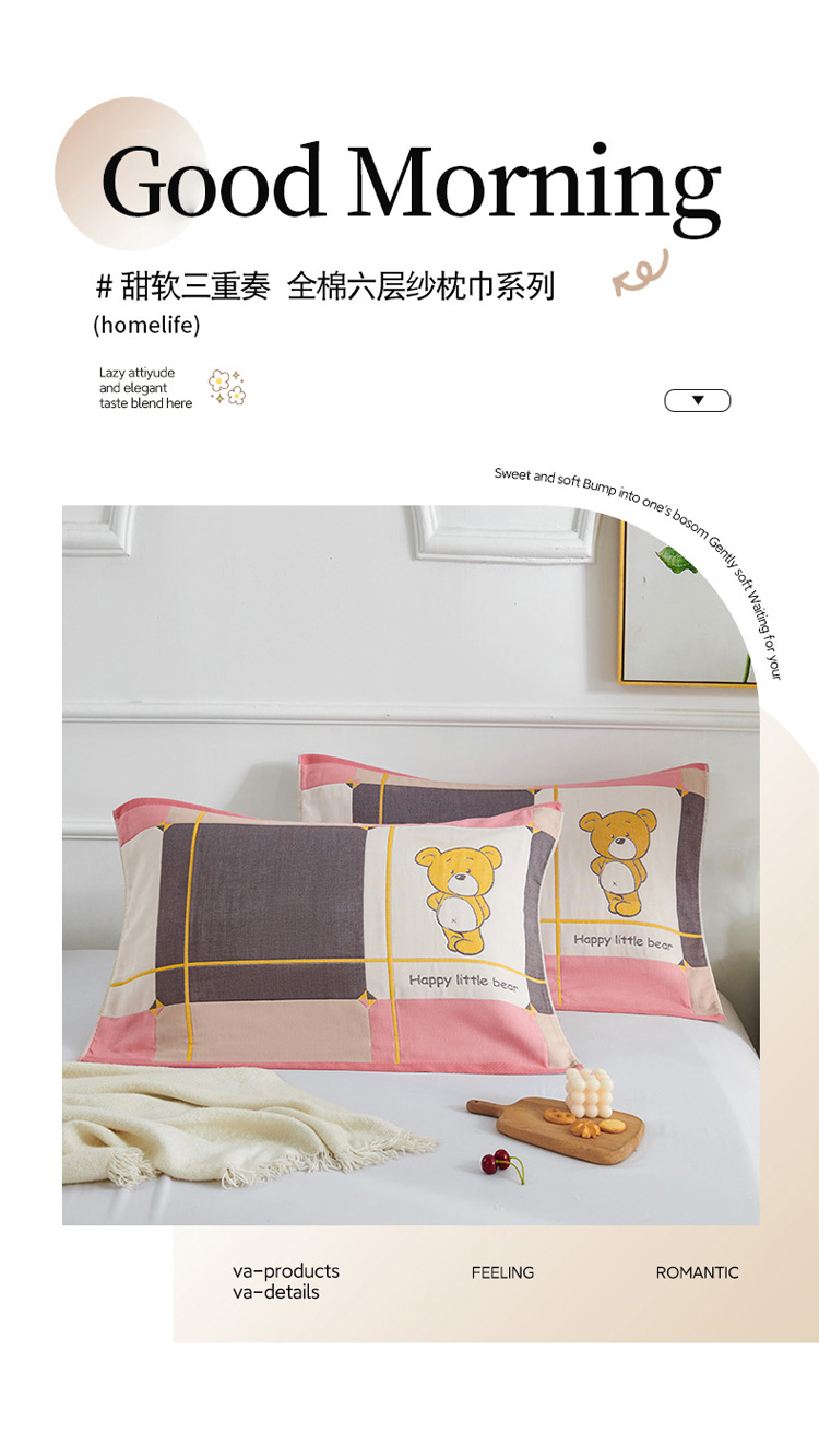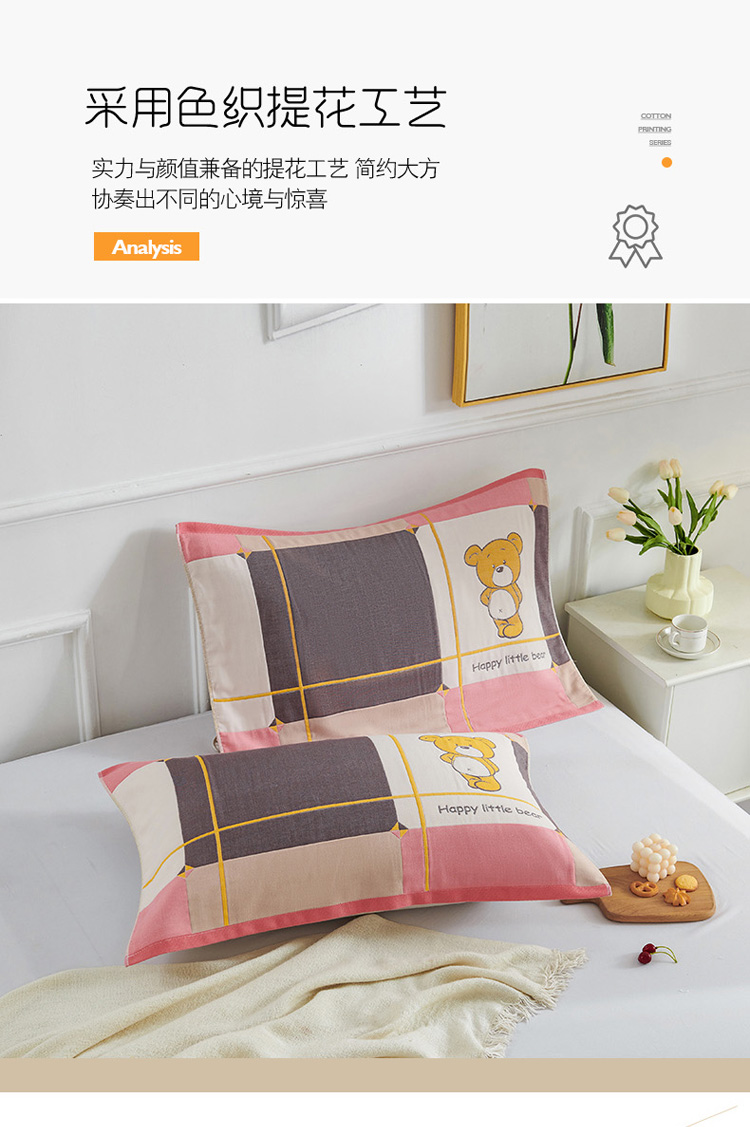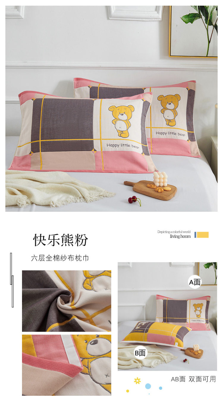 商品名称:棠薇 2023新款全棉6层纱布枕巾-简约系列 6层 快乐熊粉53*80cm/对